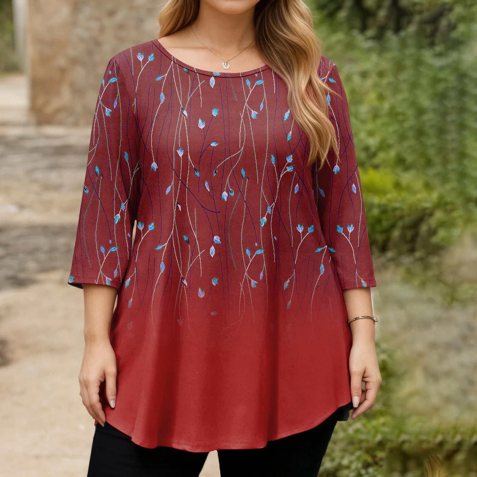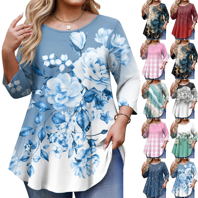 Ladie’s Retro Floral Print Long Sleeve Tops Plus Size 3/4 Sleeve Curved Hem O Neck Fashion T-shirt