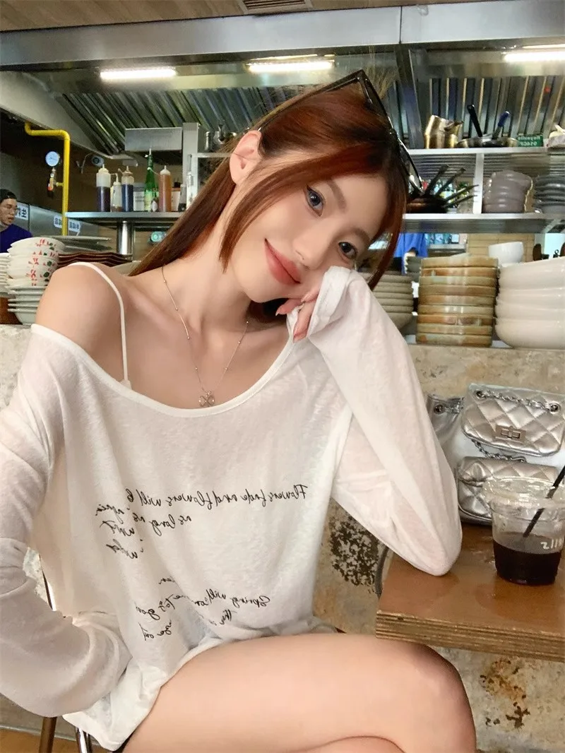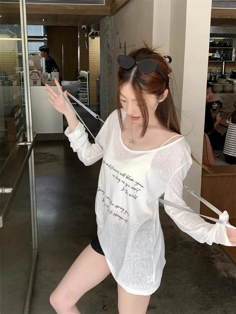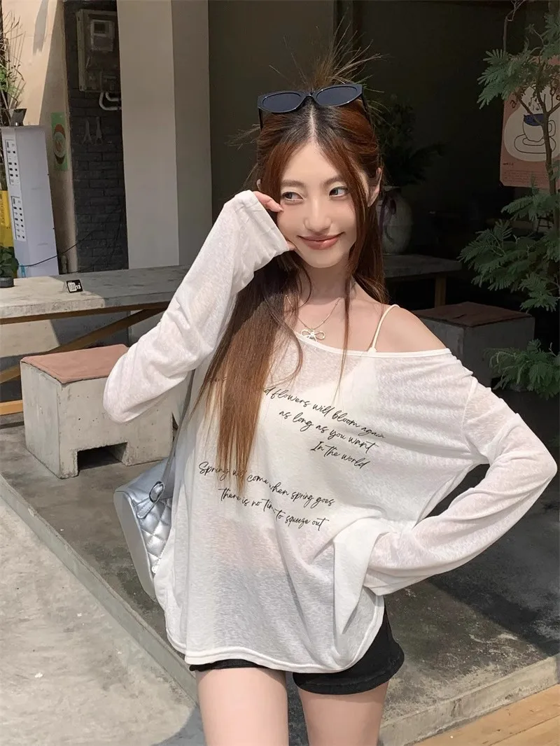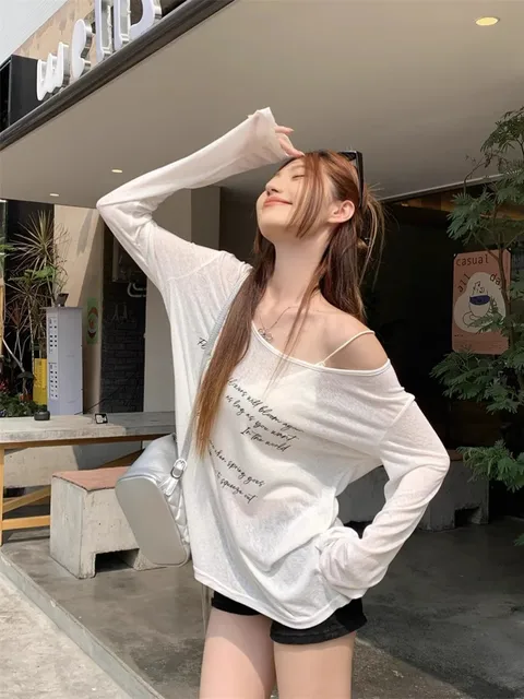 Laid-ba Sle Long Sve Loose Casual Thin Women's T-irt Summer Slimming Versatile Sun Protection Top oulder-baring Pr...