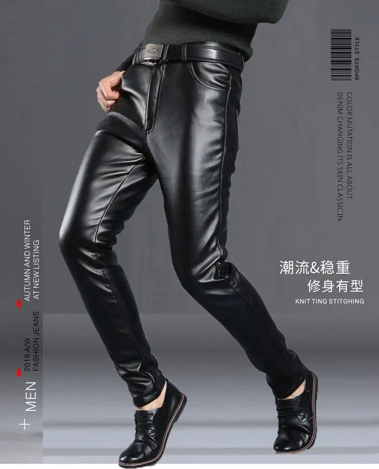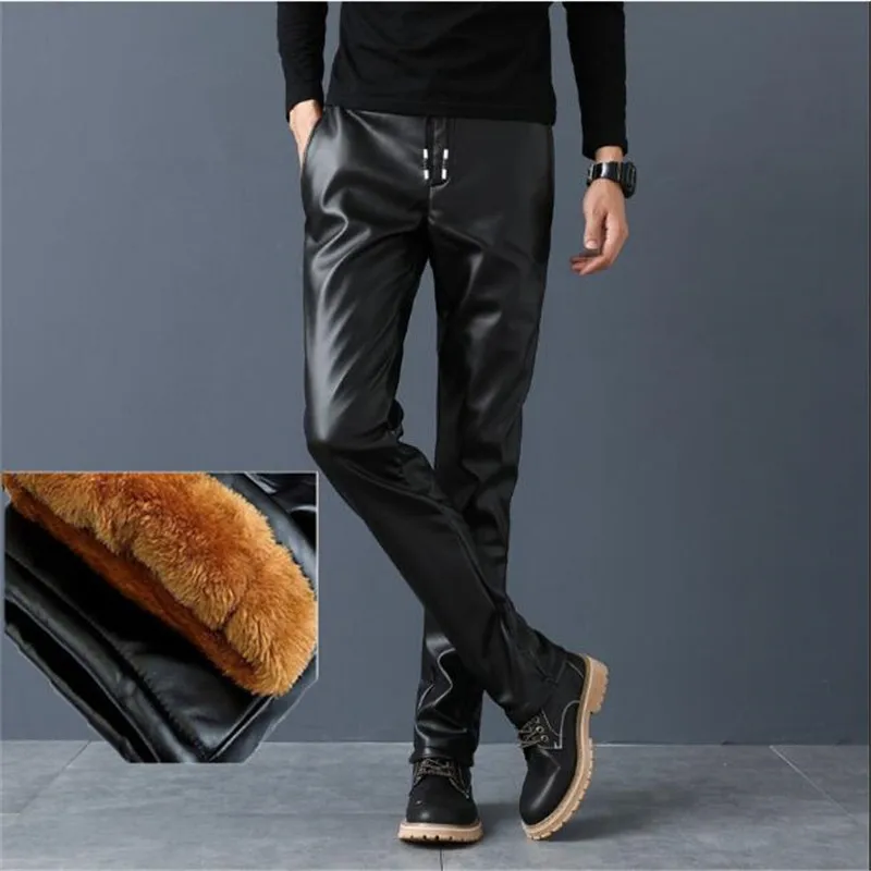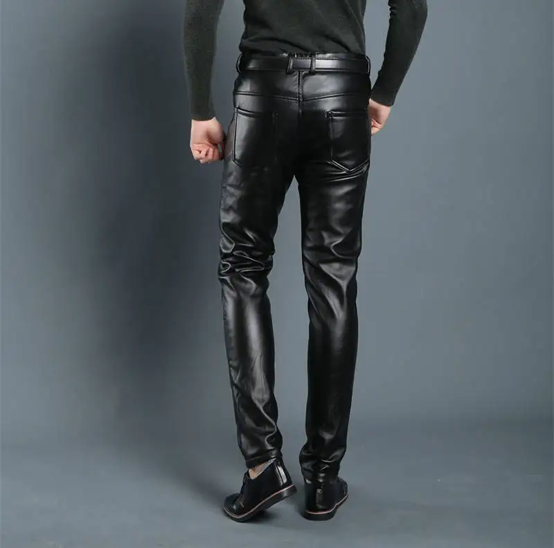 Men's Leather Motorcycle Pants with Cargo Pockets, Black, PU Pants No Belt, Men Trousers Big Size S-5XL