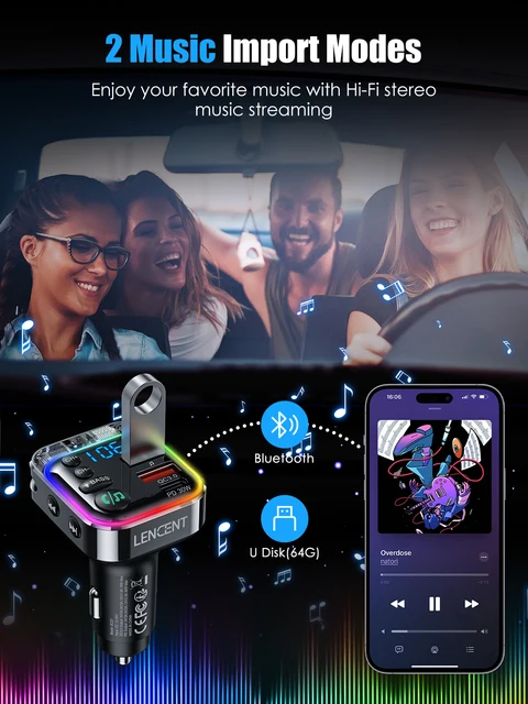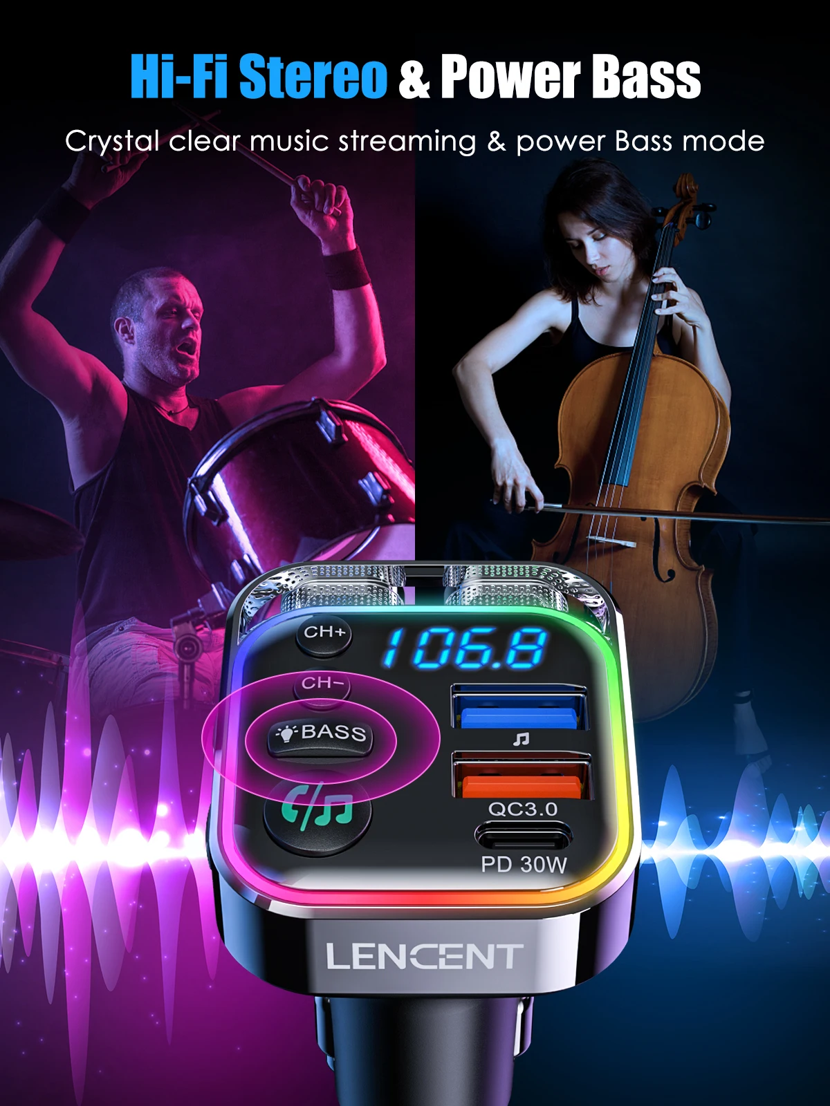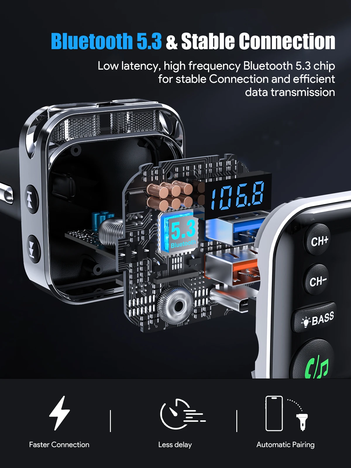 The latest Bluetooth 5.3 technology has a faster and more stable connection. It intelligently identifies and reconnects the last paired device. We optimized the antenna and signal for this FM transmitter so that it has extremely low latency and you will have a better call and music experience.