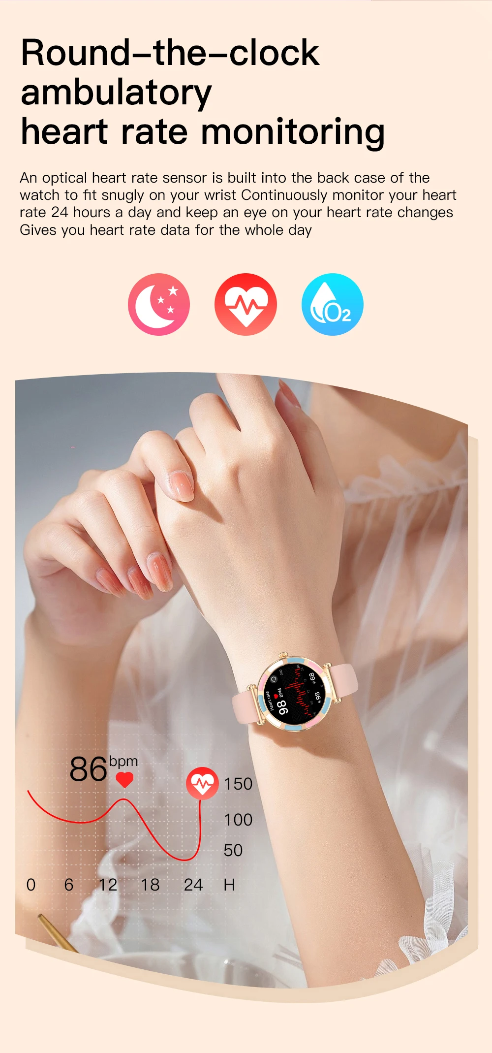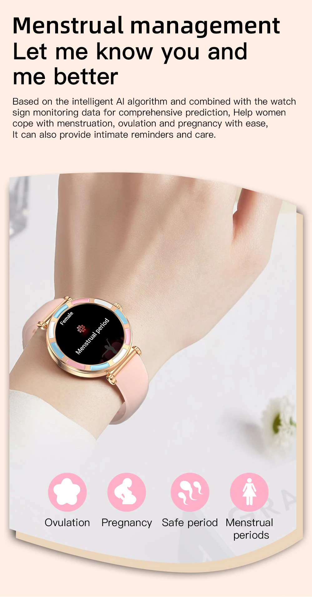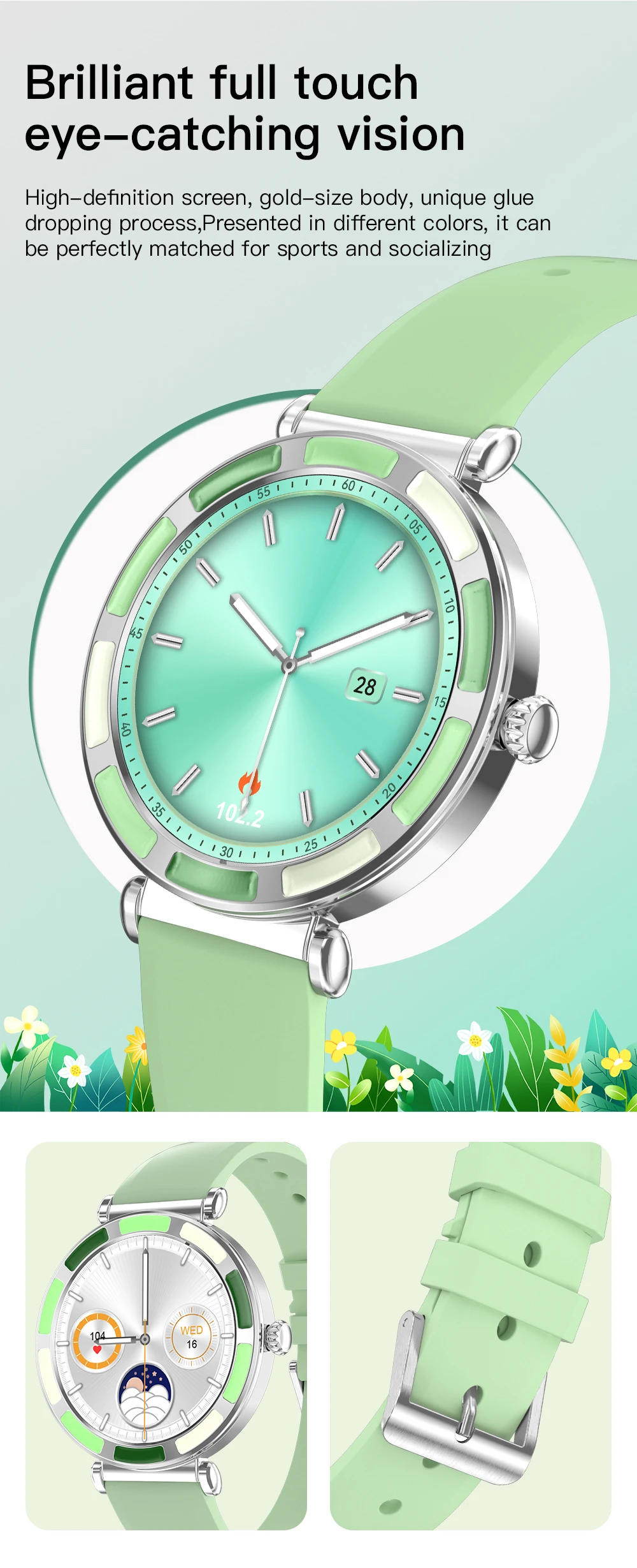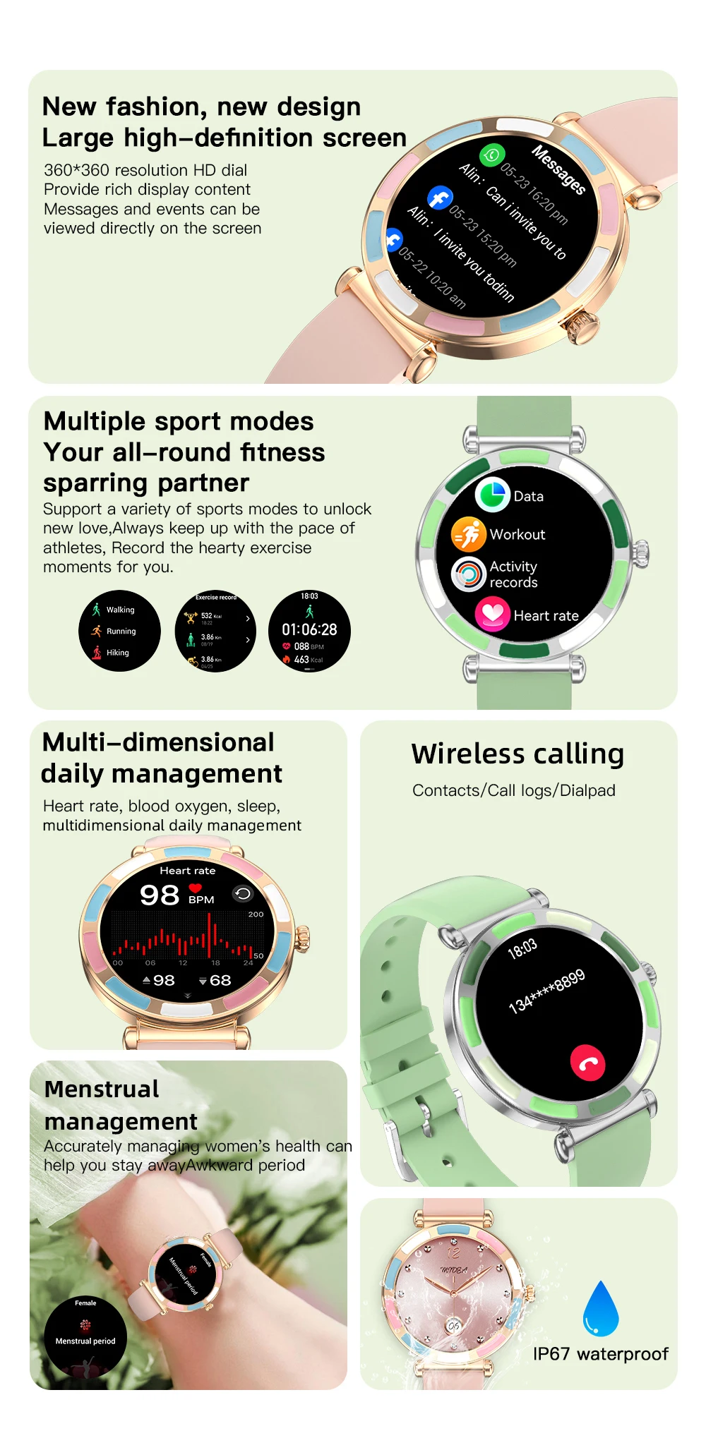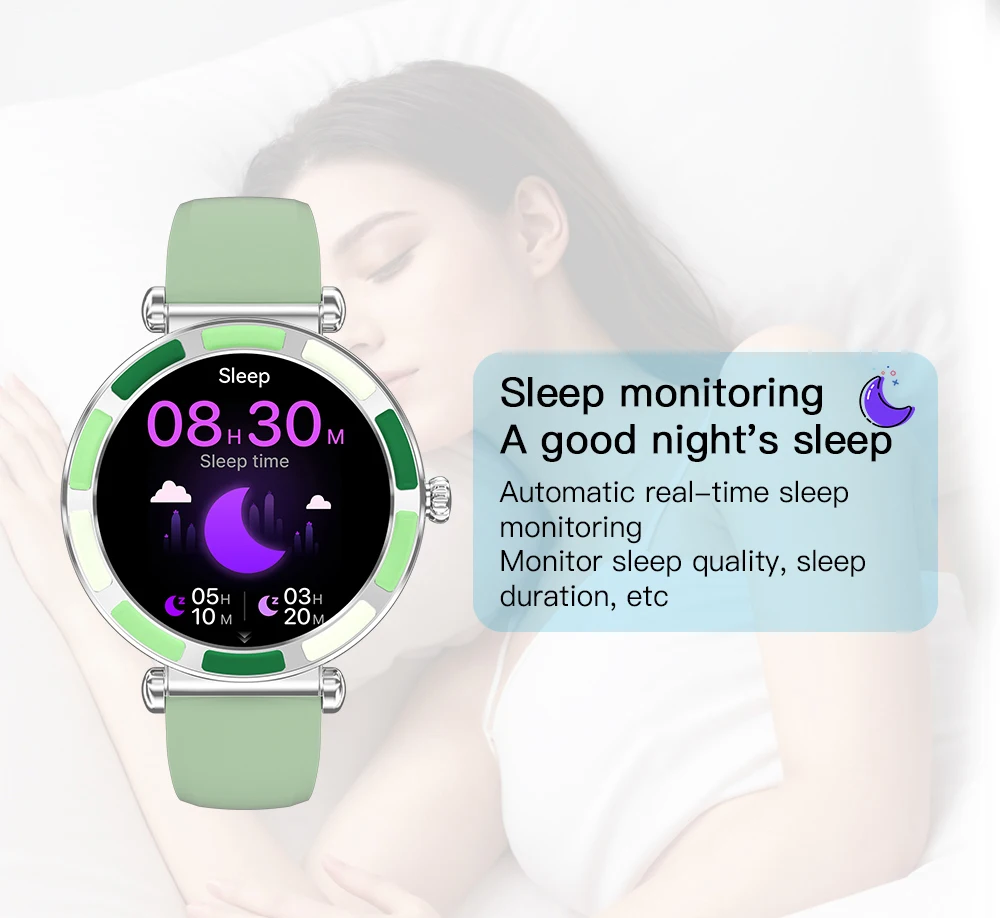 Wireless call (make & answer & reject), voice assistant, message notification, 24h health monitoring, heart rate, blood oxygen, sleep monitor, female menstrual period management, multiple sports modes, step, distance, calories, massive fashion dials, custom watch face, sedentary reminder, music control, remote camera, weather forecast, alarm clock, time & date display, stopwatch, timer, find phone & wristwatch, do not disturb mode, raise to wake screen.