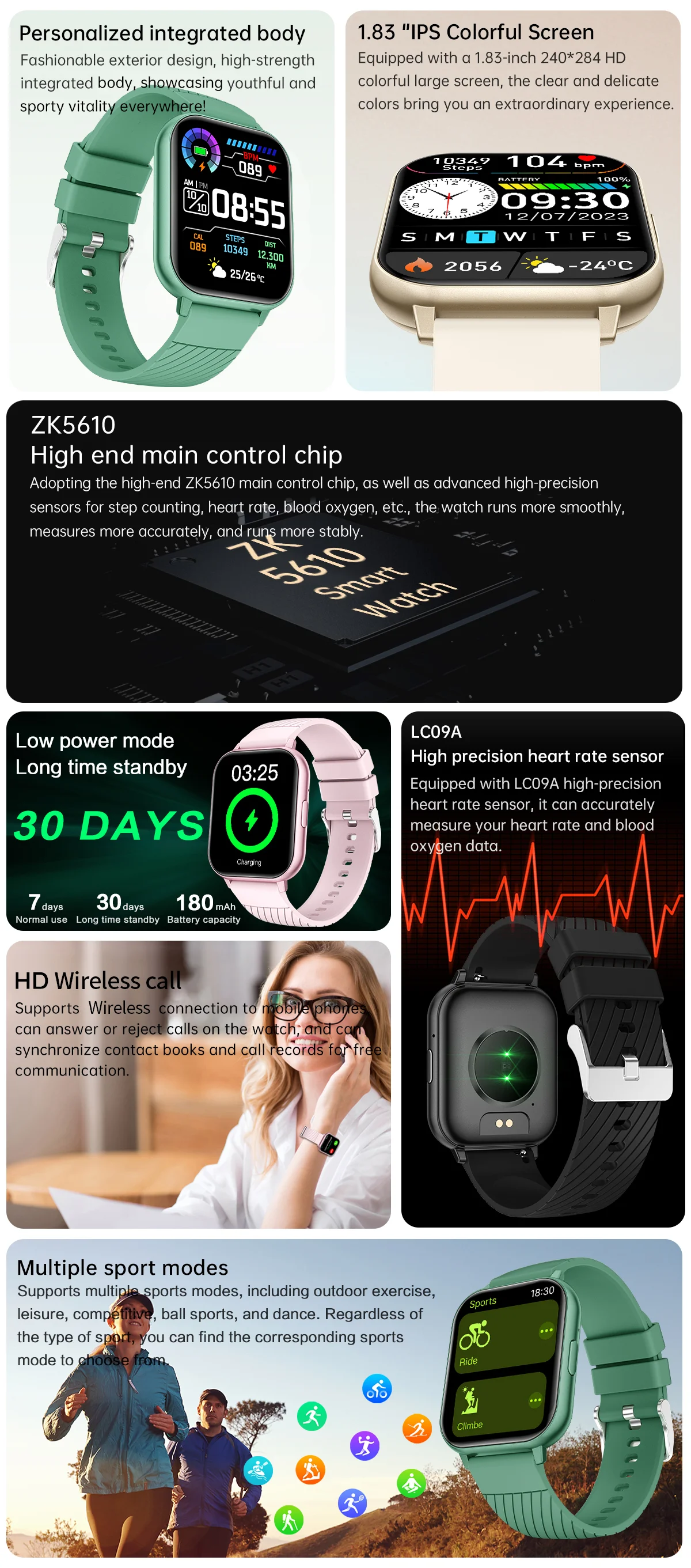 Dial market, sports mode, screen-out time settings, scan code connection, custom dial, custom components, voice calls, water drinking reminder, breathing training, sleep monitoring, heart rate, call reminder, message reminder, blood oxygen, sitting reminder, alarm clock reminder, search bracelet, stopwatch, wrist lifting bright screen, Bluetooth call, weather push, Bluetooth music.