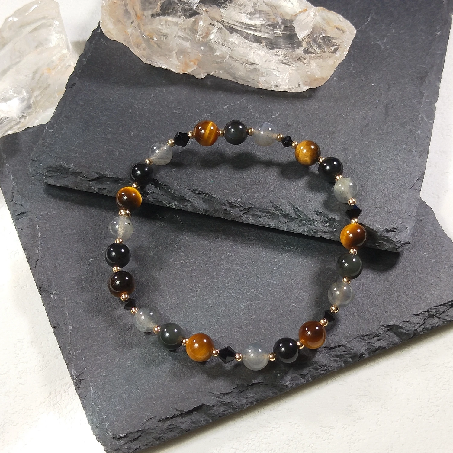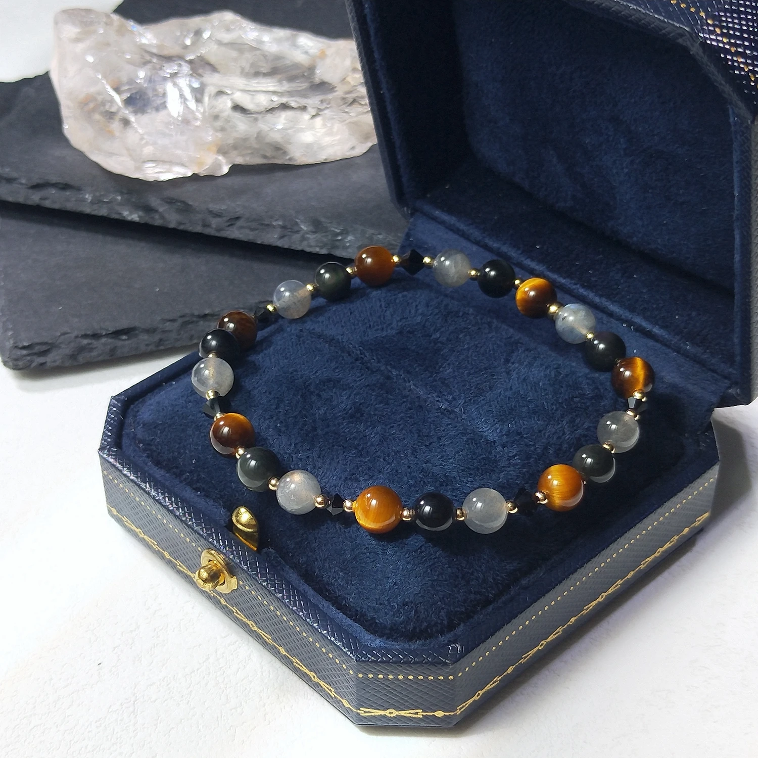 Lii Ji Natural Stone Black Tourmaline Tiger's Eye 4-8mm Stainless Steel 14K Gold Filled Bracelet Handmade Jewelry For Female