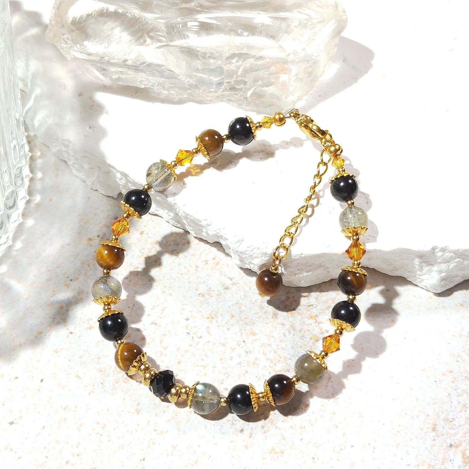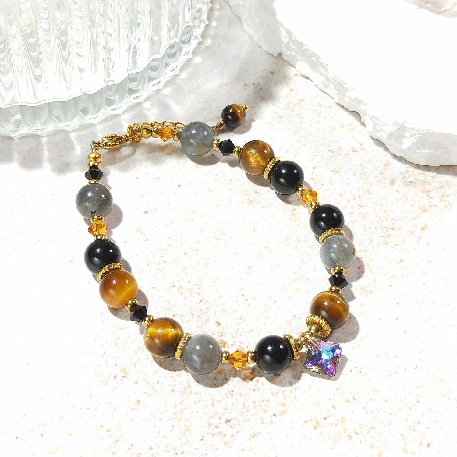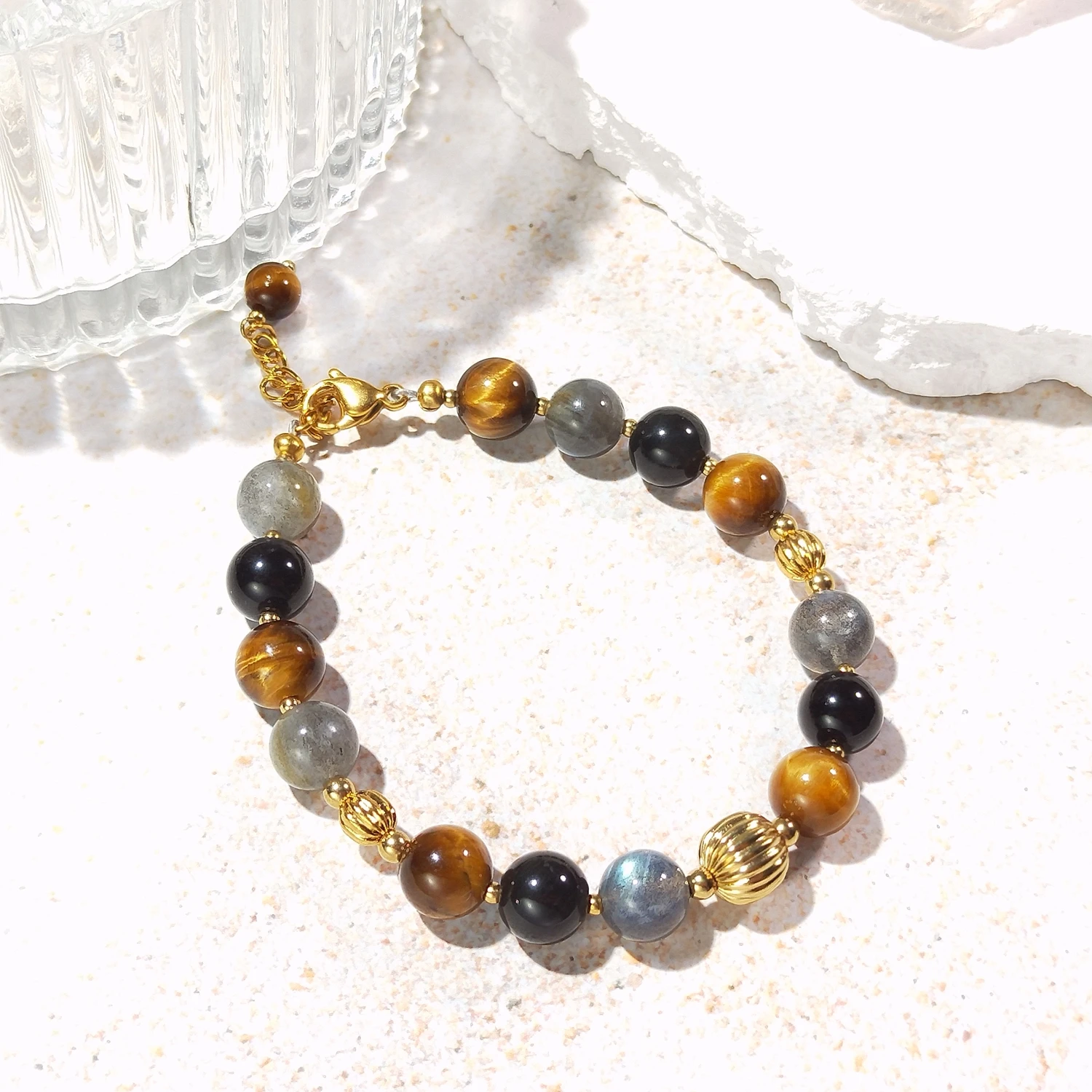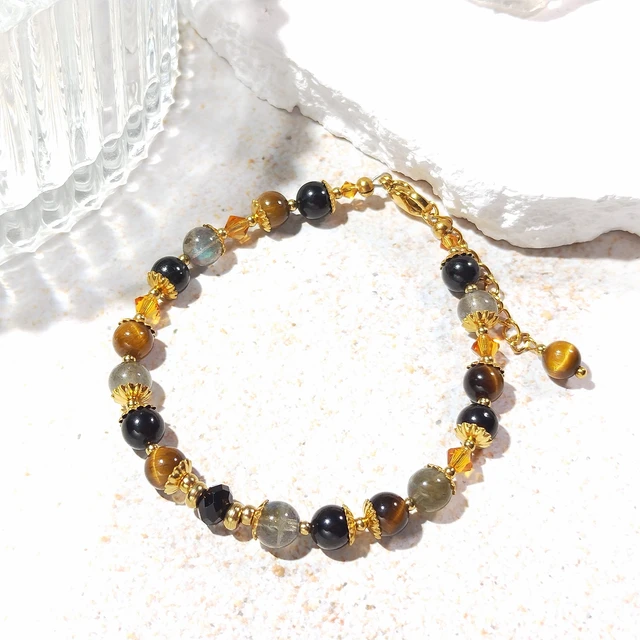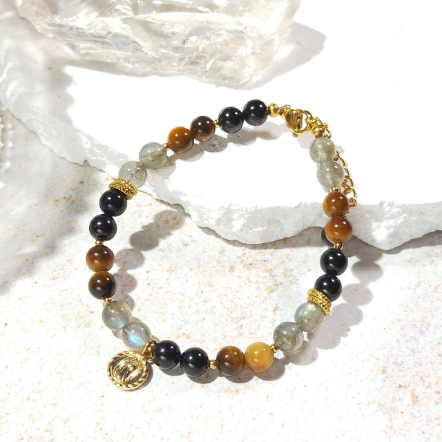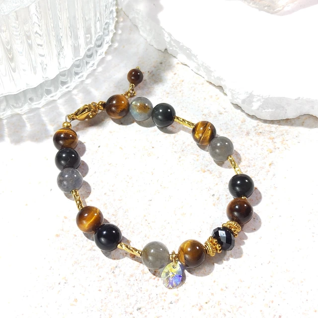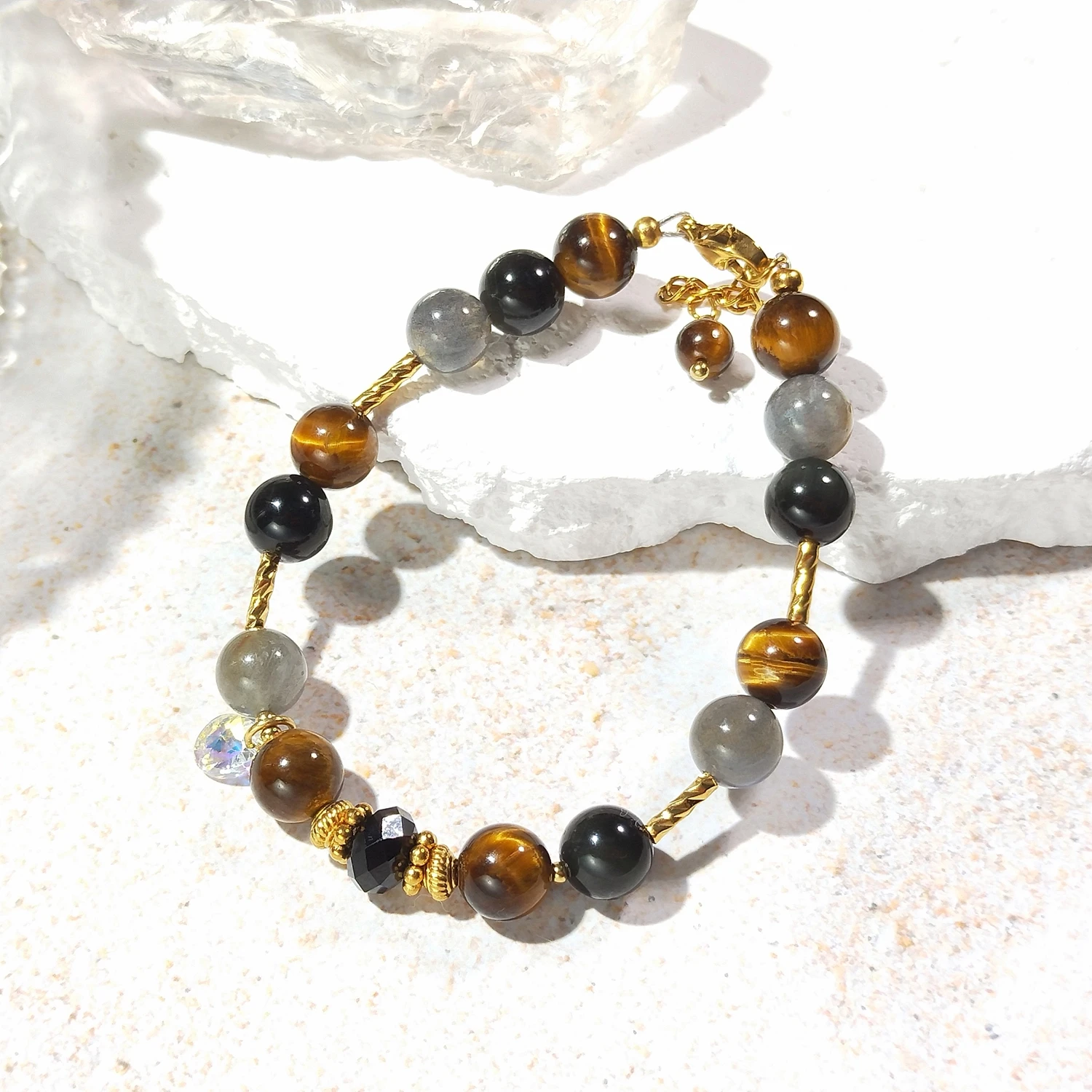 Lii Ji Tiger Eye Labradorite Obsidian/Black Tourmaline 4-8mm Stainless Steel 14K Gold Filled Bracelet Handmade Jewelry