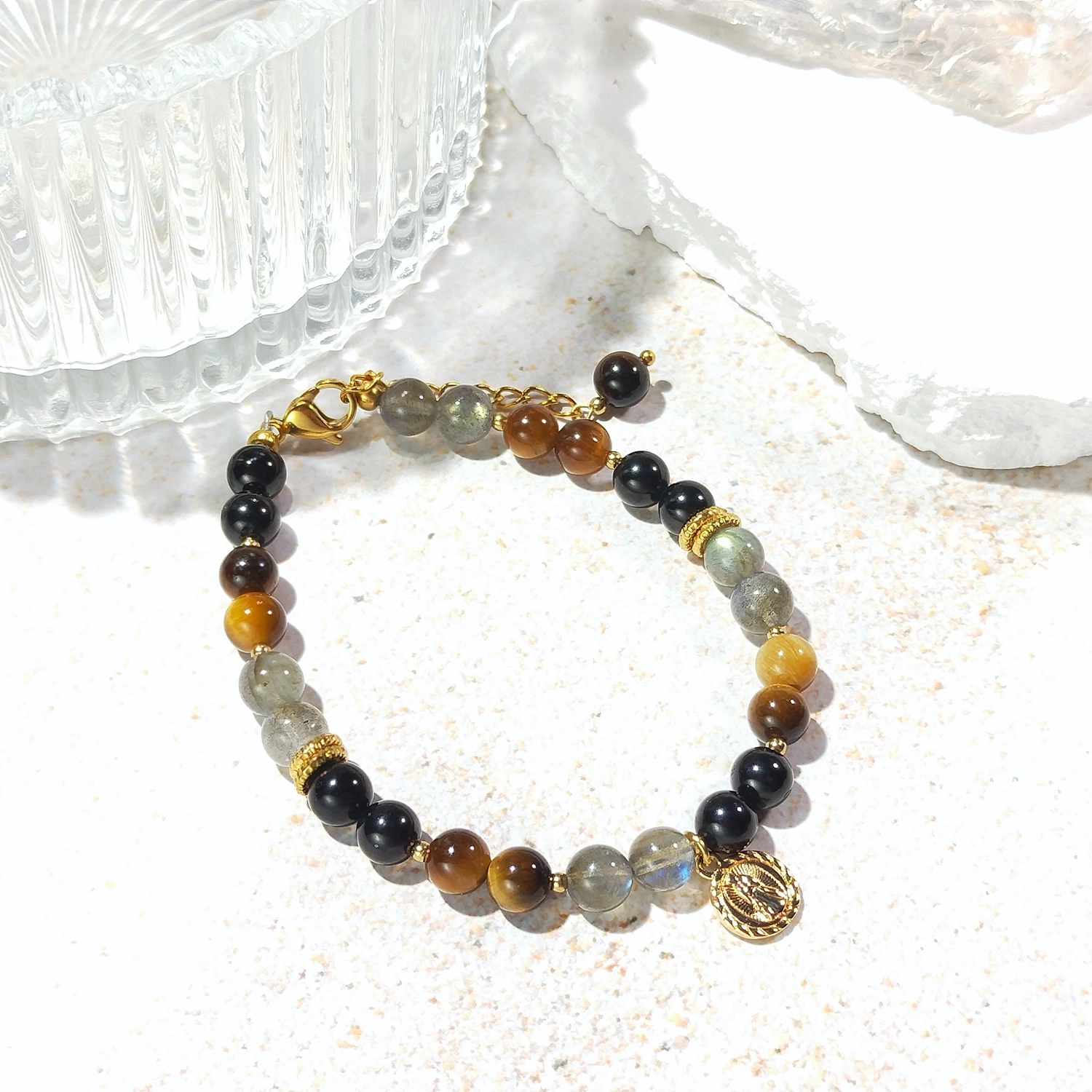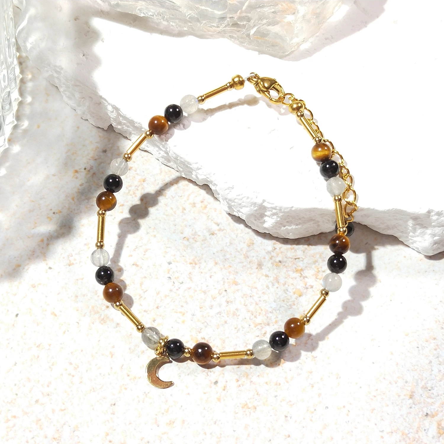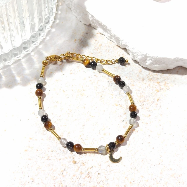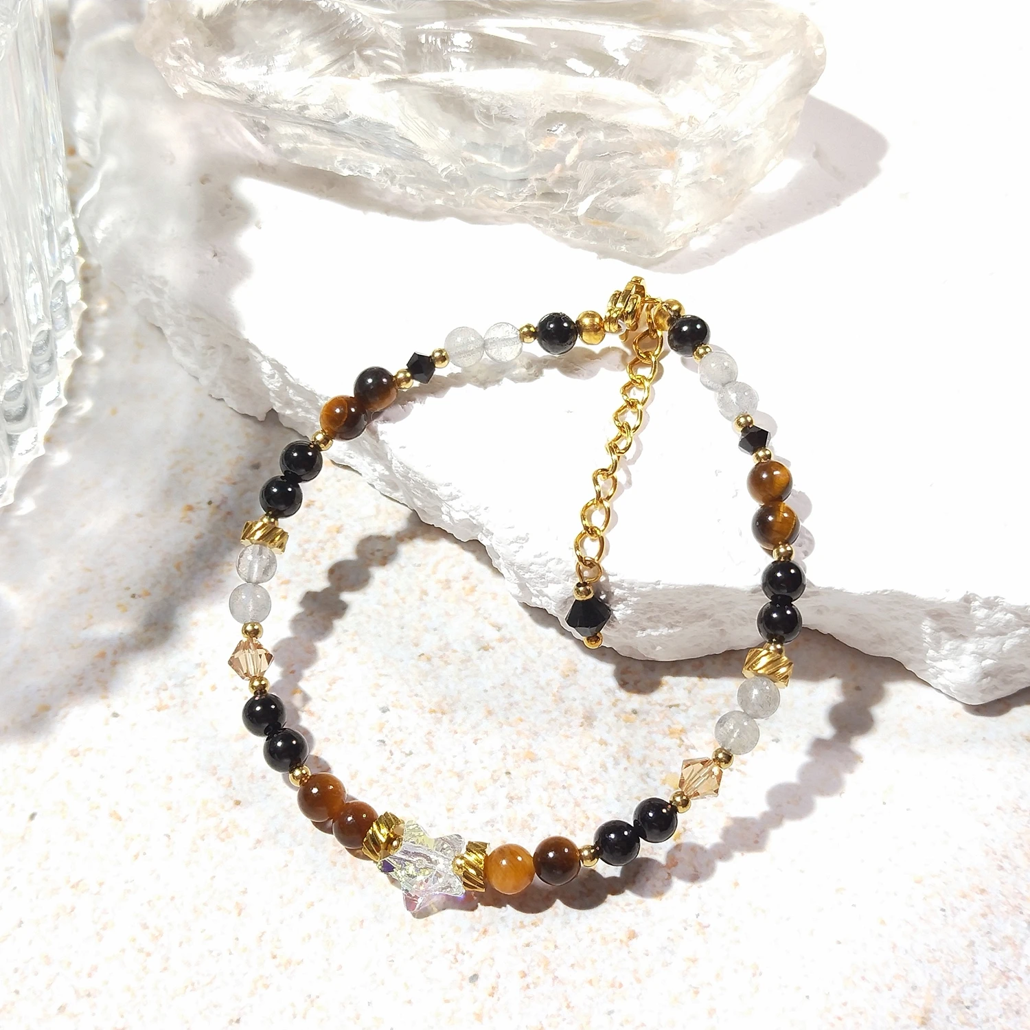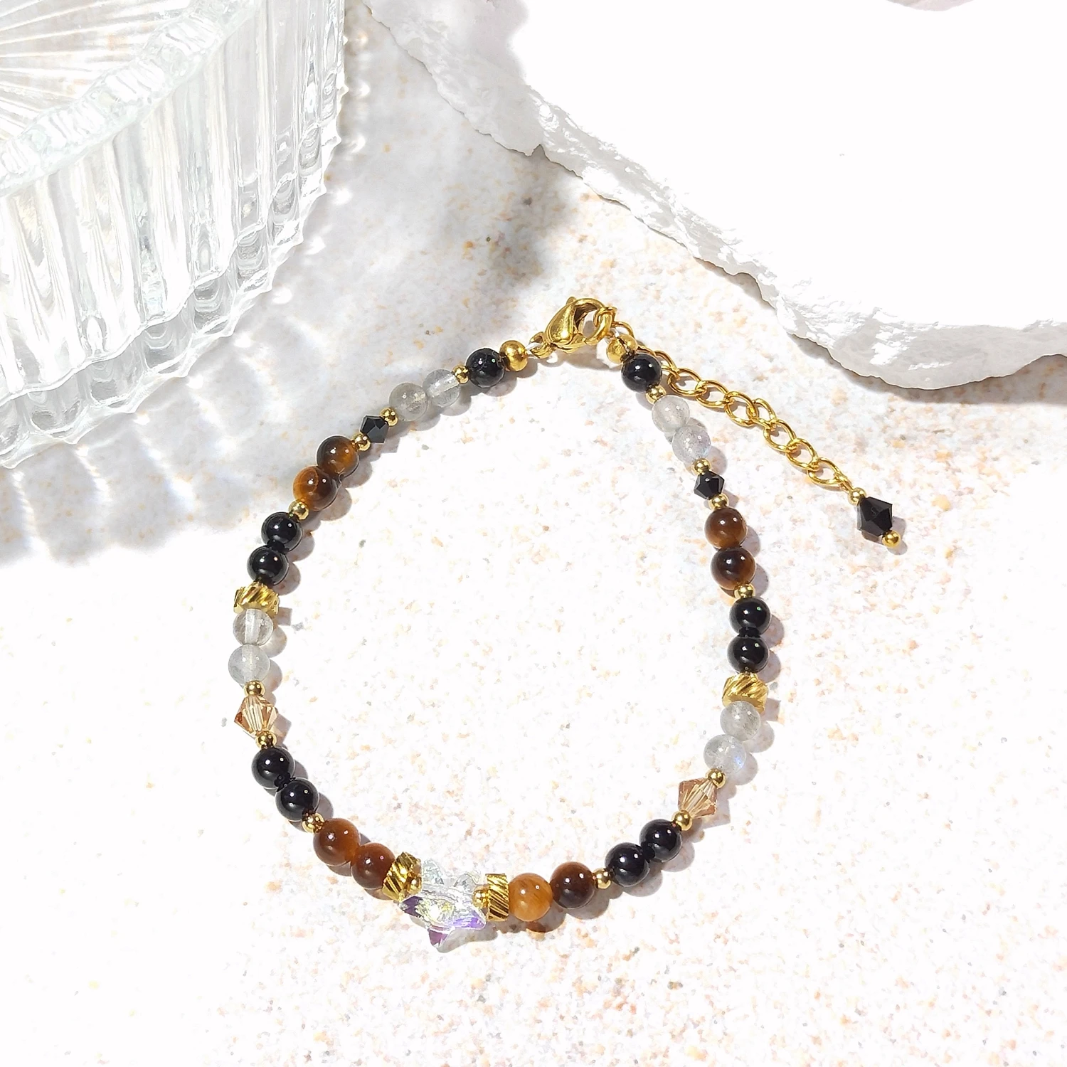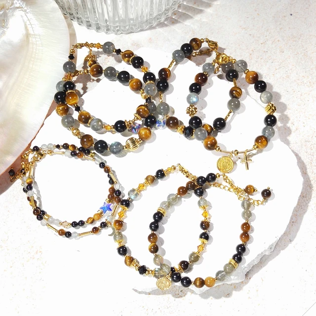 Lii Ji Tiger Eye Labradorite Obsidian/Black Tourmaline 4-8mm Stainless Steel 14K Gold Filled Bracelet Handmade Jewelry