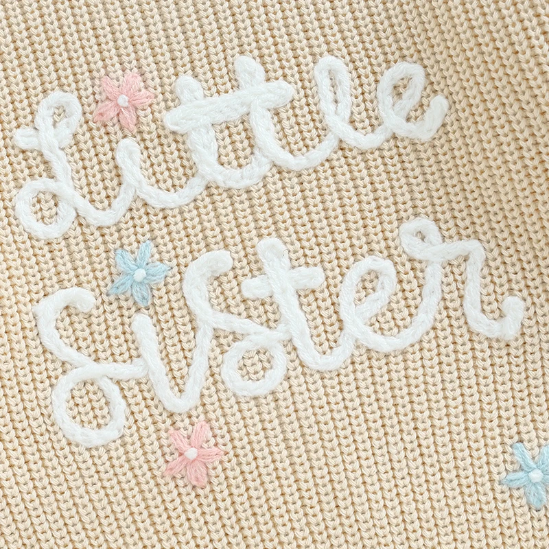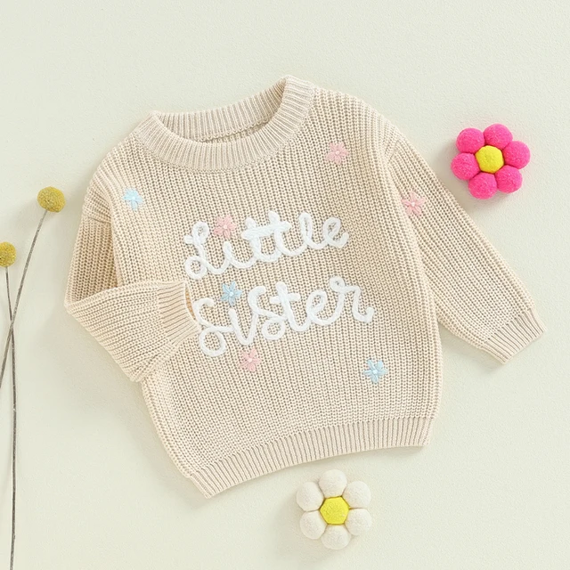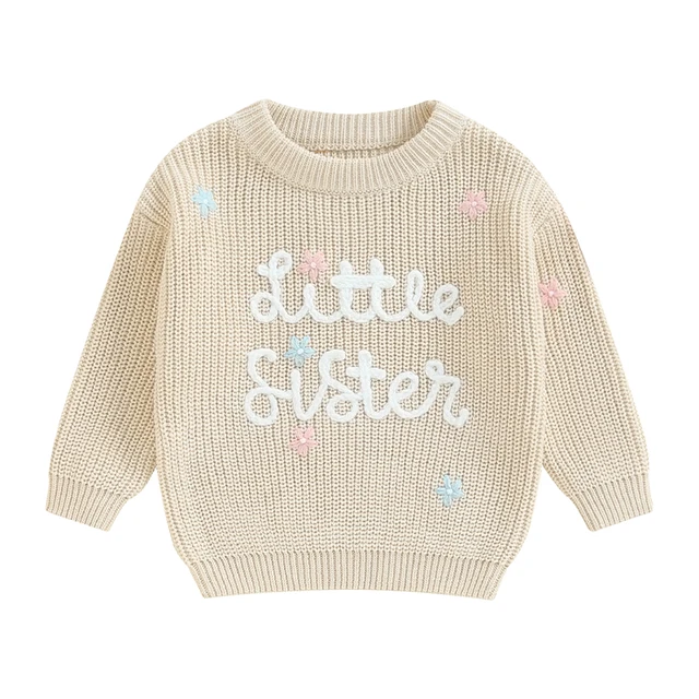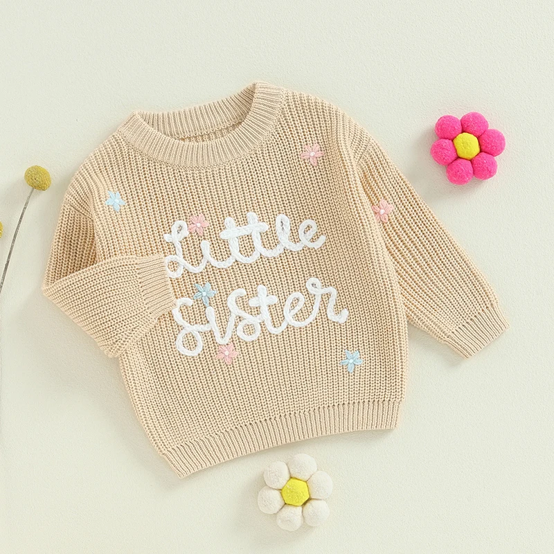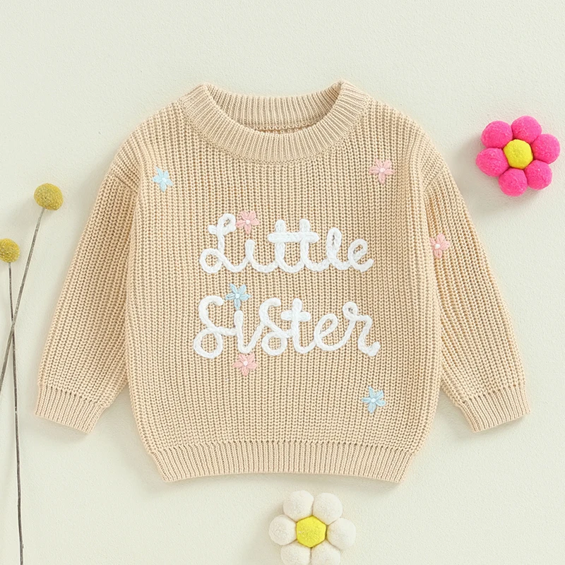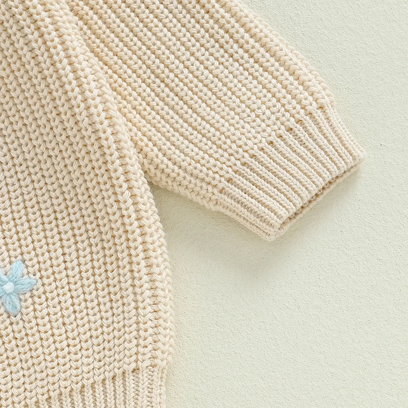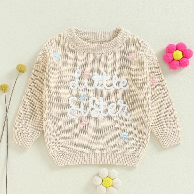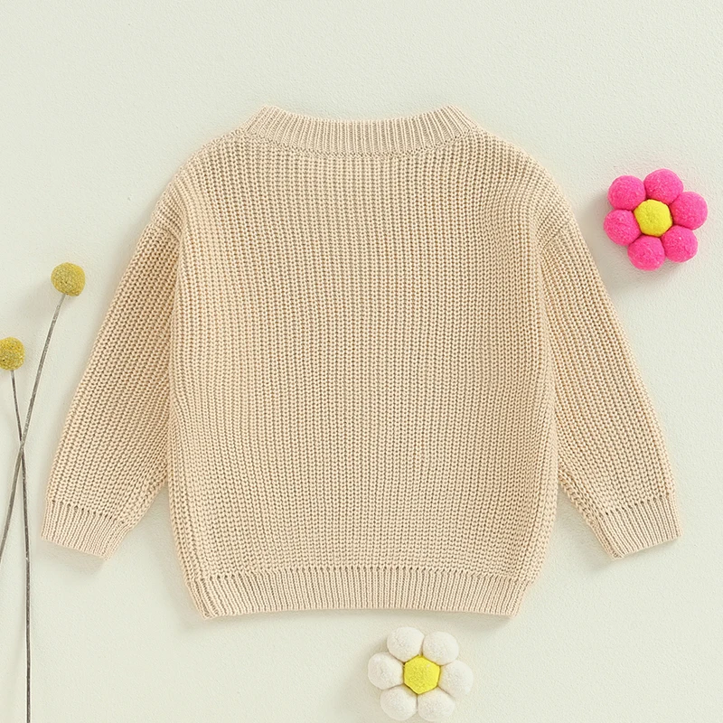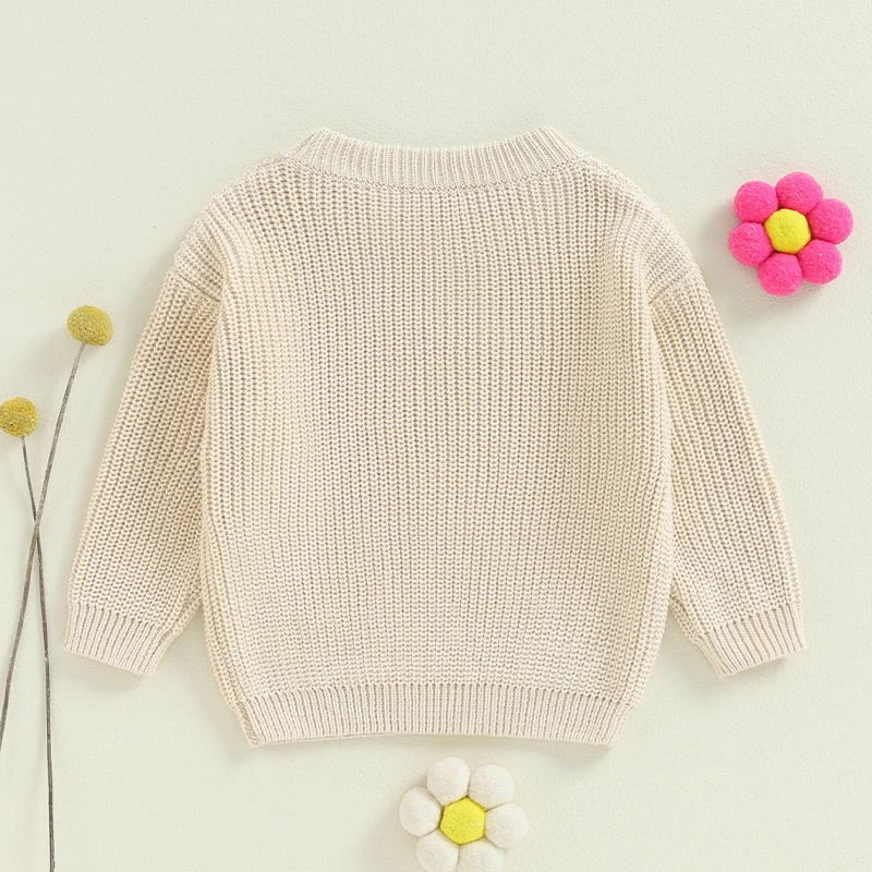 Baby Girl Fall Sweater Floral&Letter Embroidery Long Sleeve Round Neck Chunky Knitwear Pullover