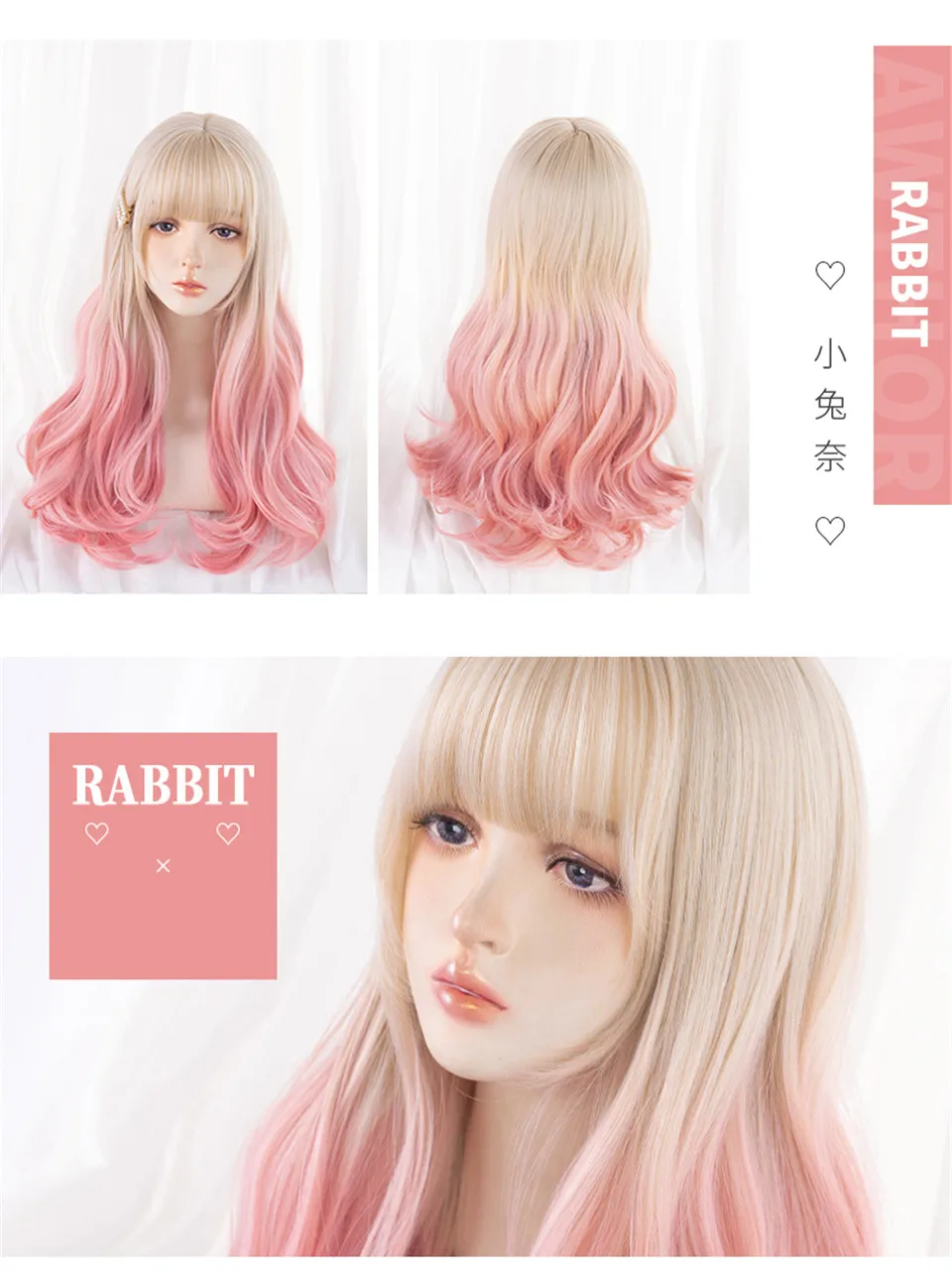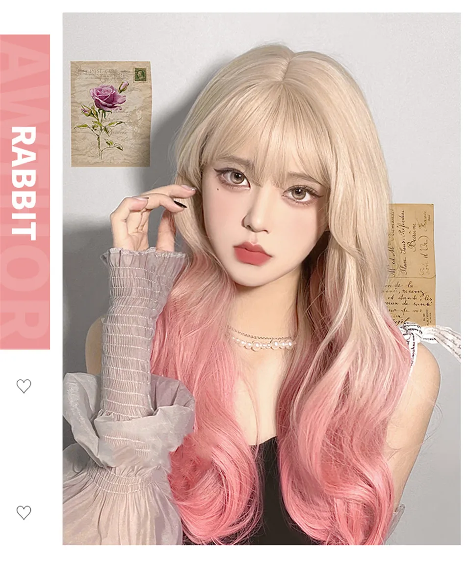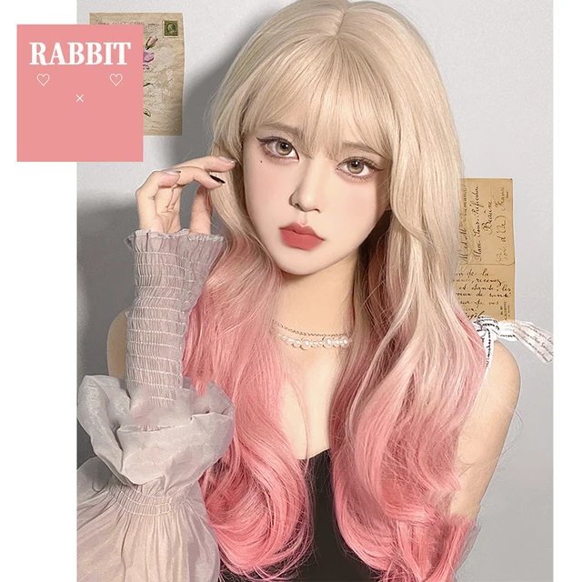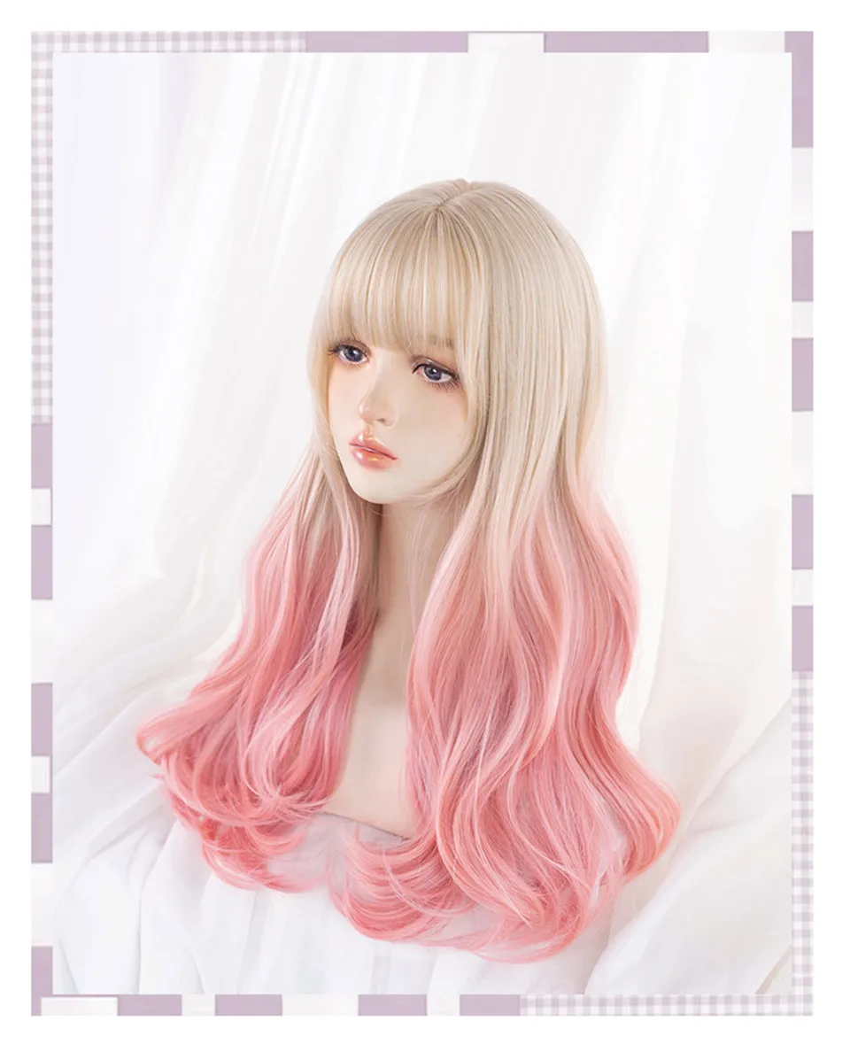 LM Long Natural Wavy Platinum Blonde Pink Wigs with Bangs Cosplay Party Lolita Synthetic Wigs for Women