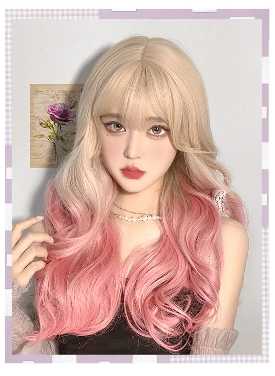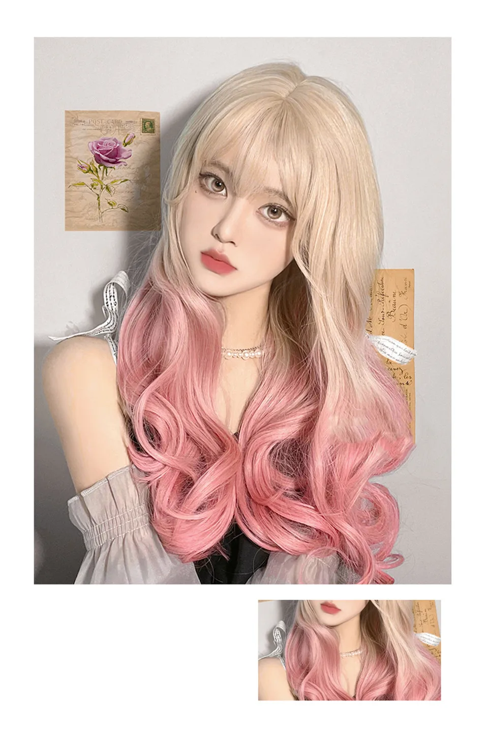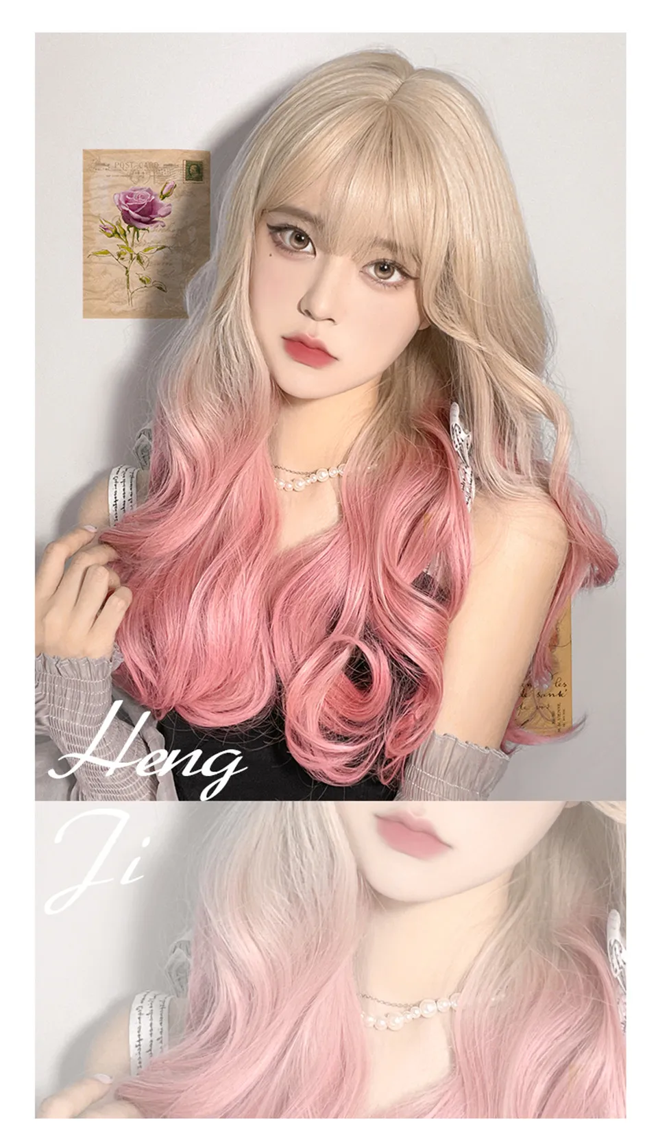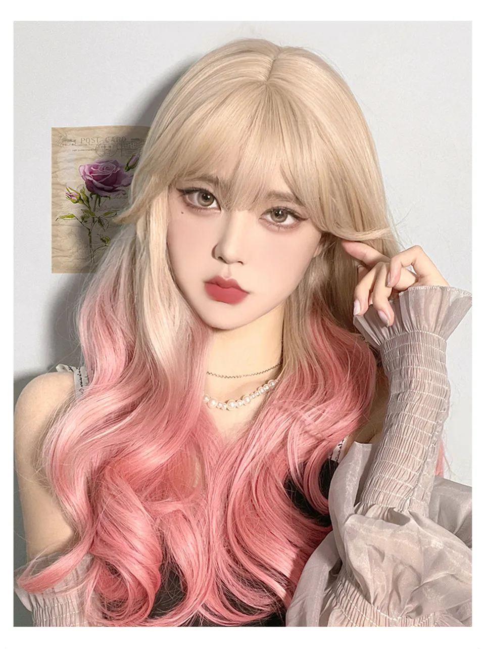 LM Long Natural Wavy Platinum Blonde Pink Wigs with Bangs Cosplay Party Lolita Synthetic Wigs for Women