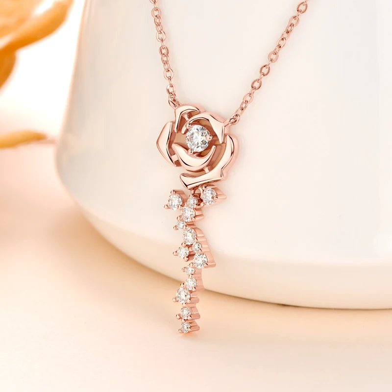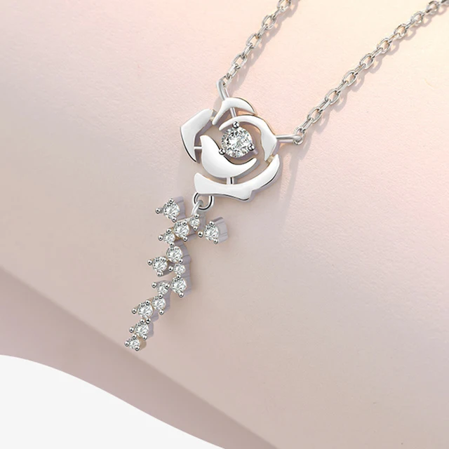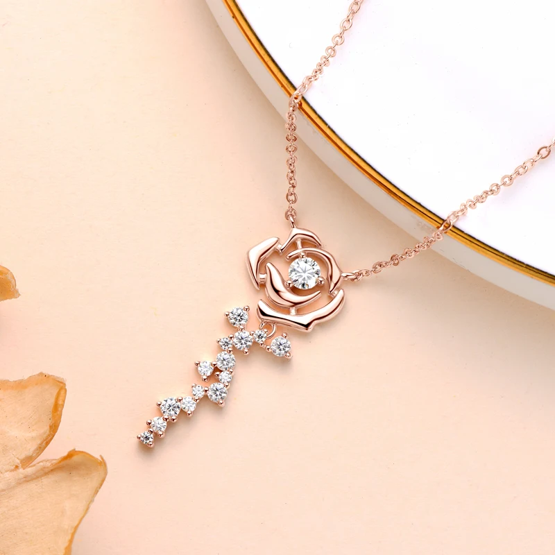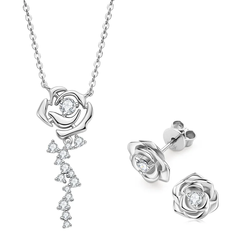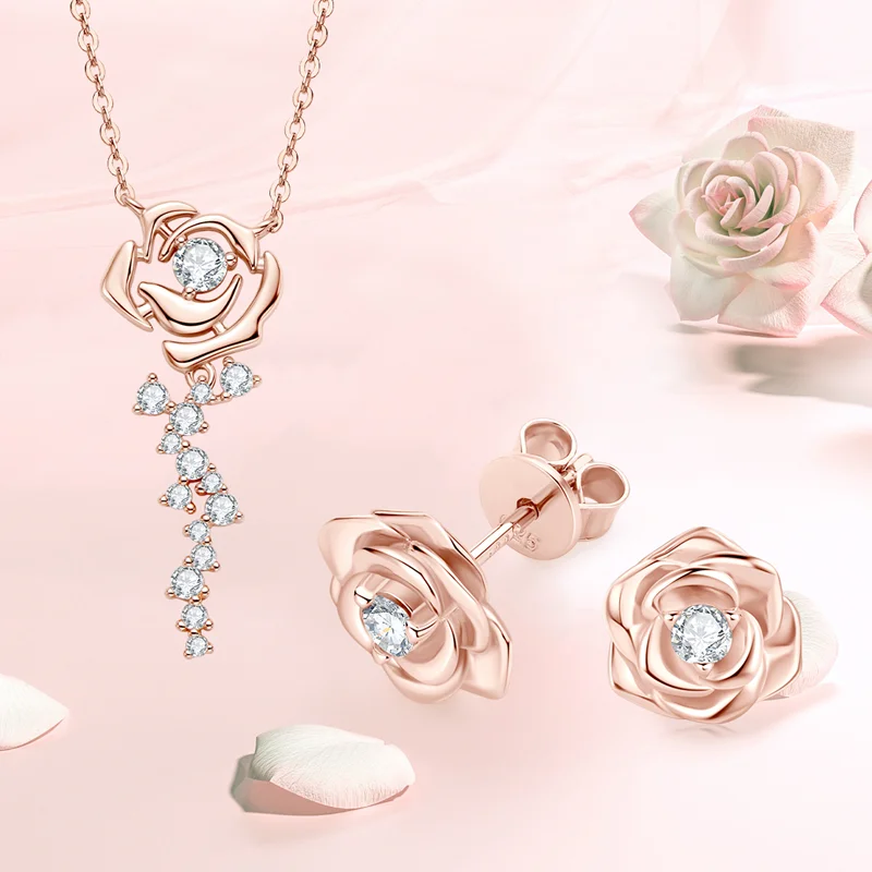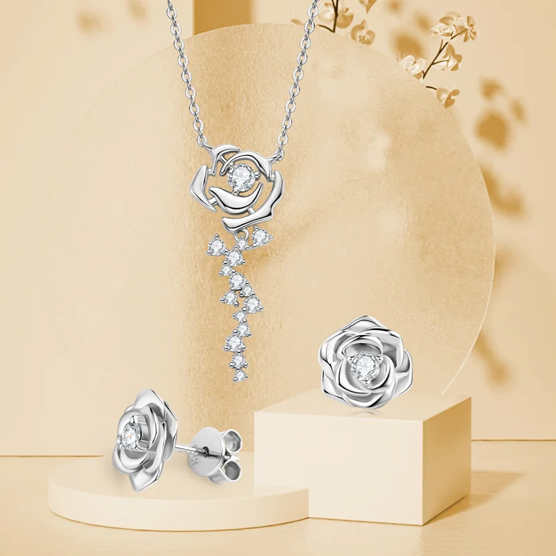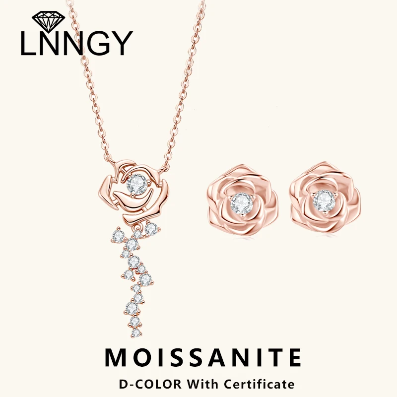 Lnngy Romantic Rose Flower Moissanite Jewelry Set For Wedding Certified 925 Sterling Silver Pendant Necklace Exquisite Gift