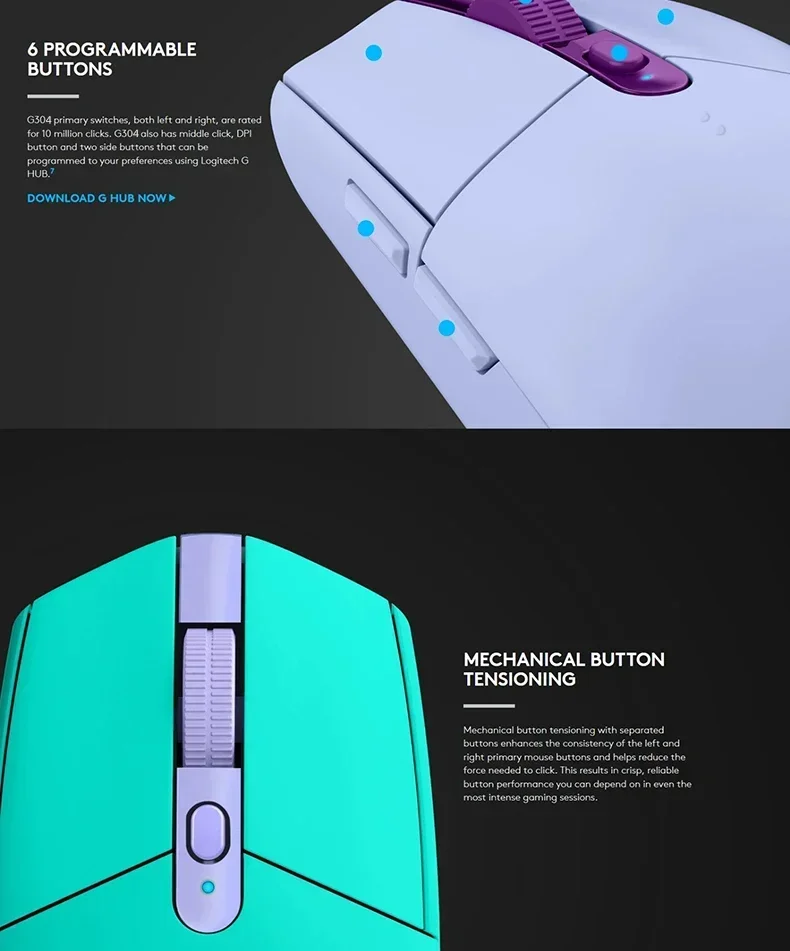 The micro switches of the two main buttons on the Logitech G304 can withstand approximately 10 million clicks. It also comes with a middle button, a DPI button, and two side buttons that can be customized using Logitech gaming software.
