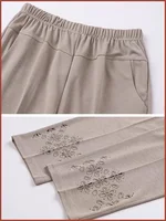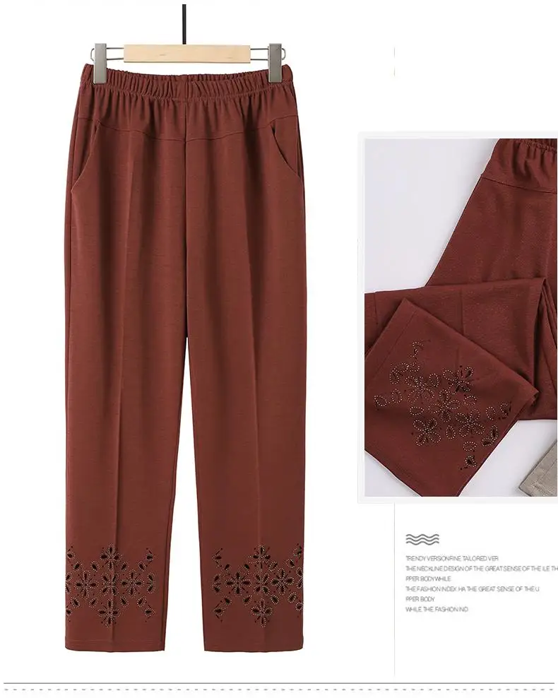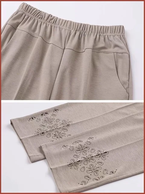 The high-waist design of these pants provides a flattering silhouette, enhancing the natural waistline and offering a comfortable fit for elderly women.