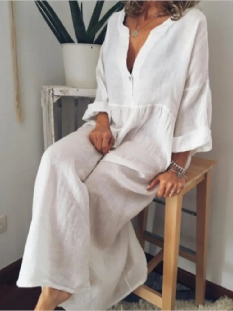women sundress Loose V-neck Patchwork Short Sleeves Solid Color Beach Dress Summer Women Dress Elegant Large Hem Maxi Dress