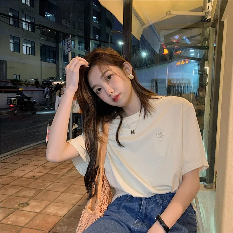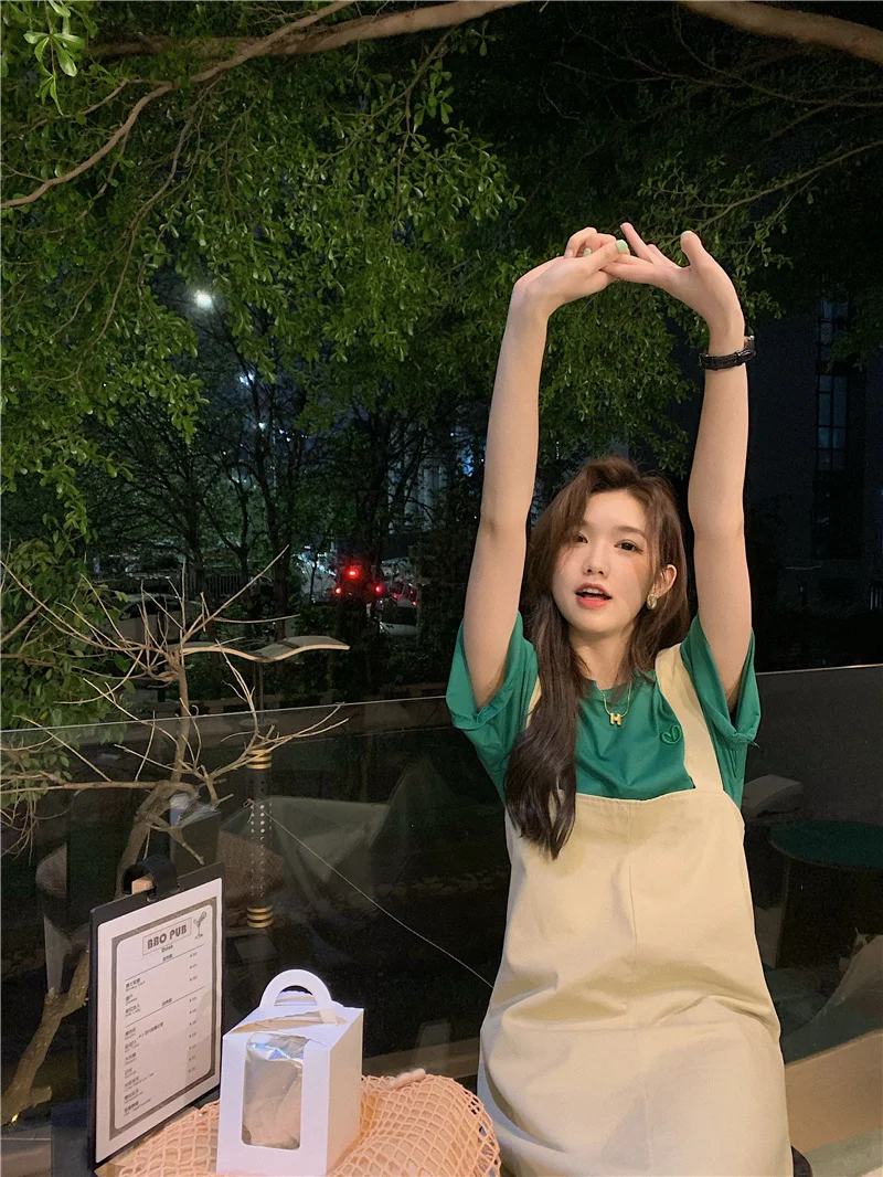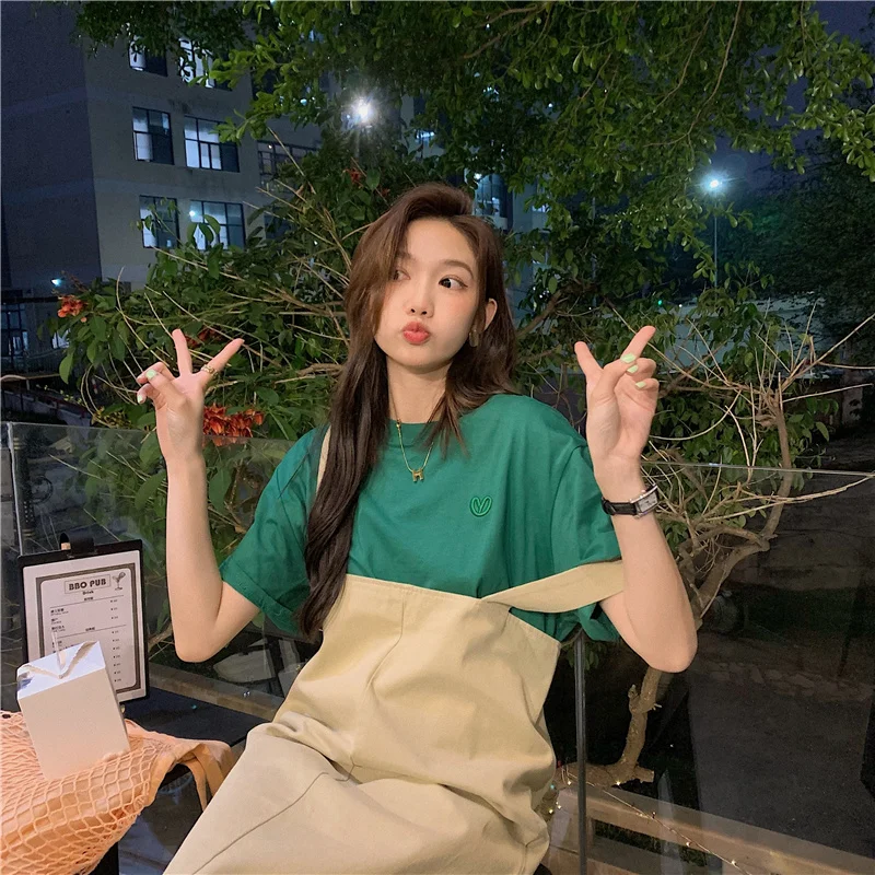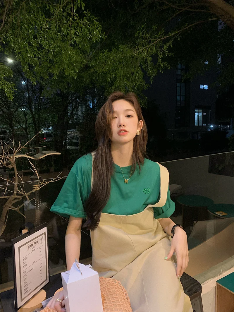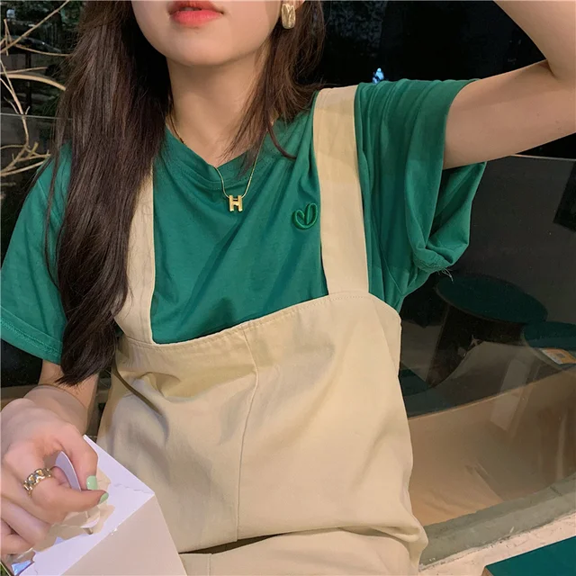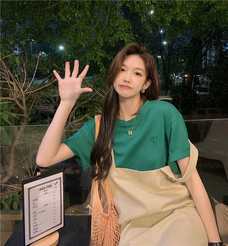 This green short-sleeved T-shirt features a trendy letter embroidery design, perfect for layering or as a standalone piece.