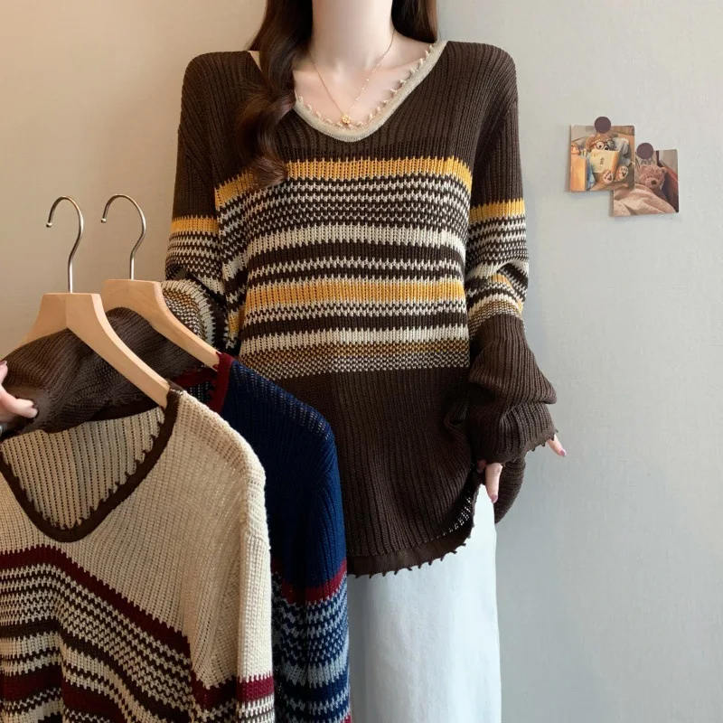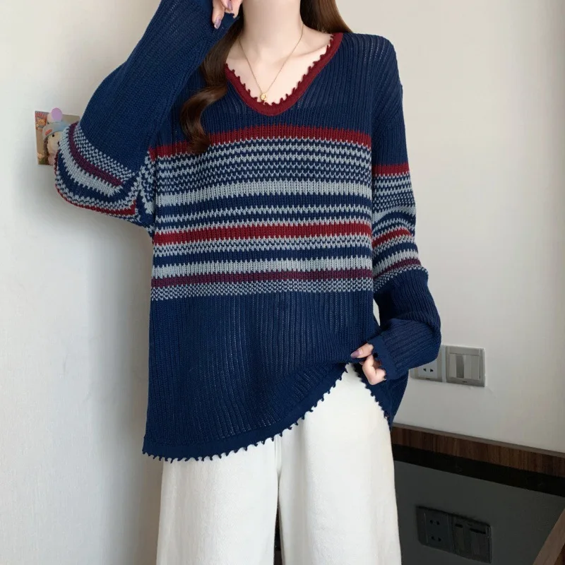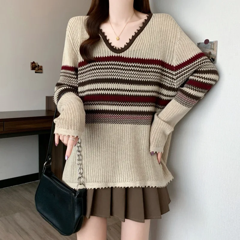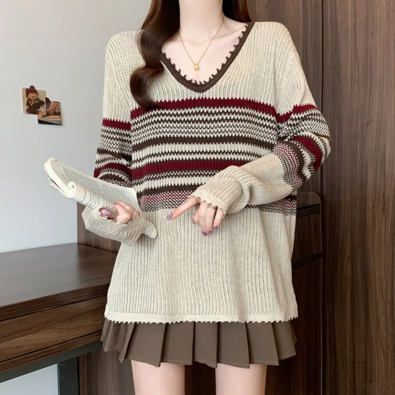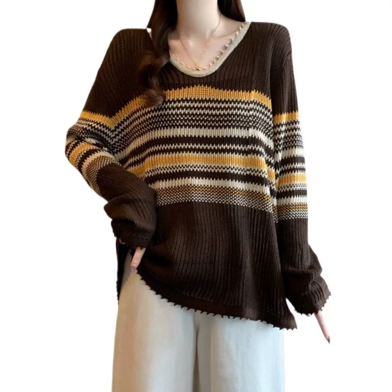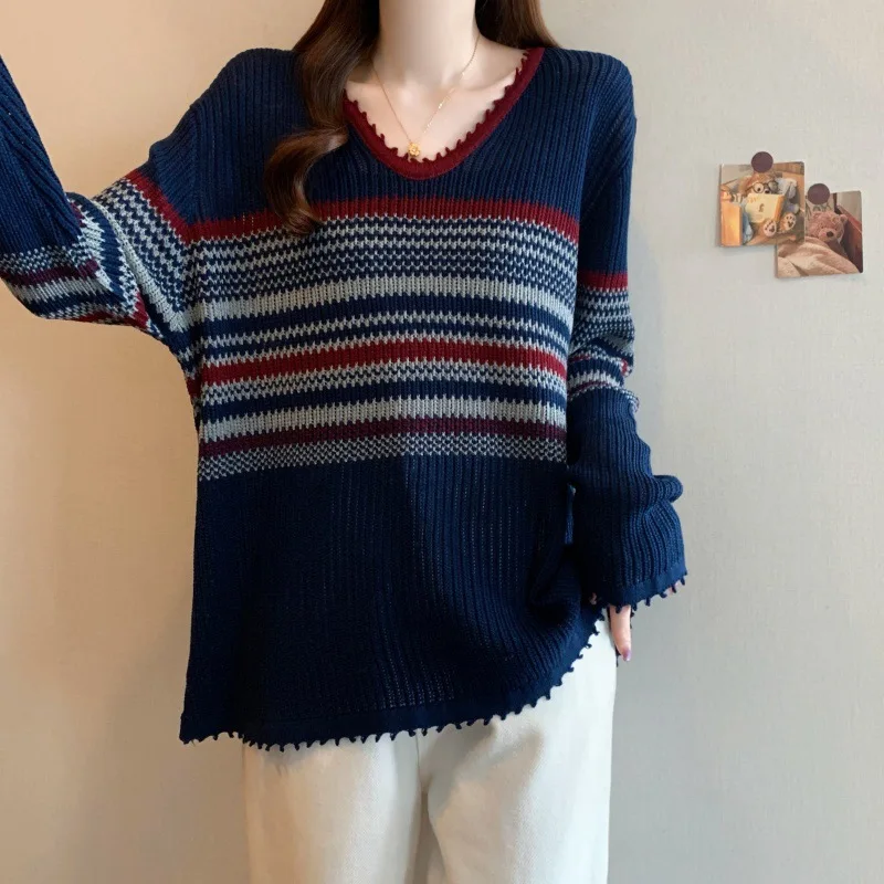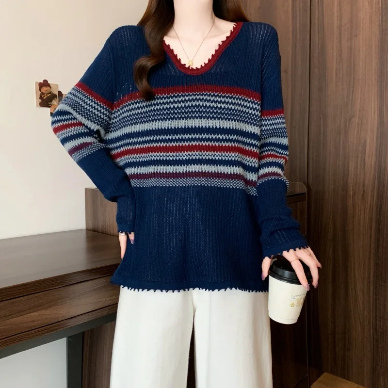 Loose Fit Stripe Knitwear Long Sleeve V-Neck Splicing Hollow out Casual Comfortable Women's Autumn New Style plus Size Top