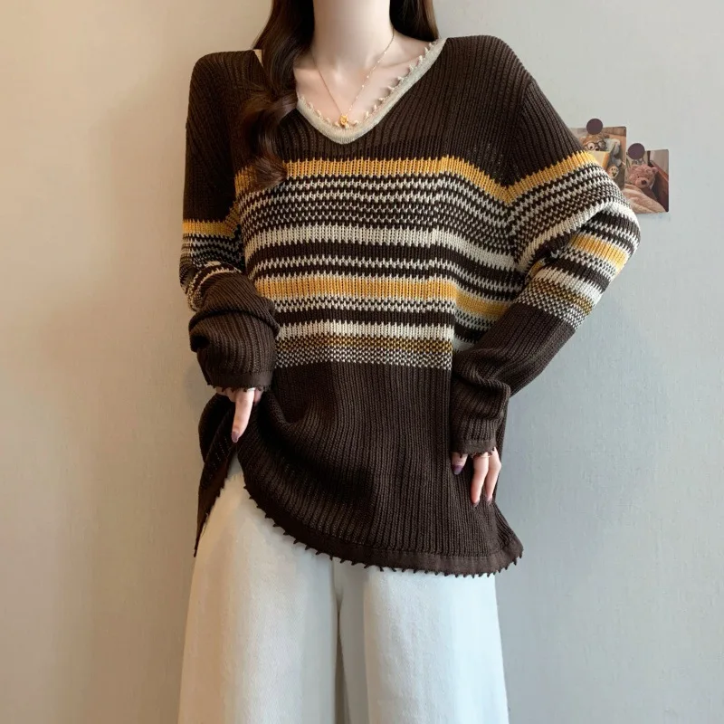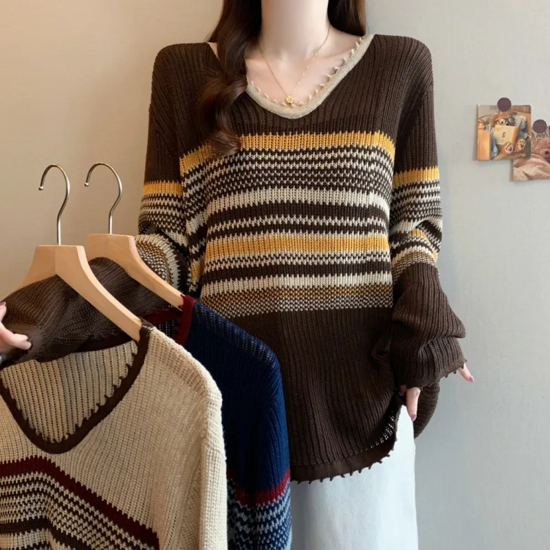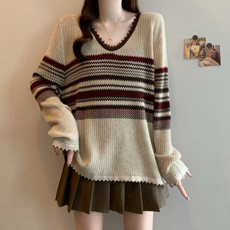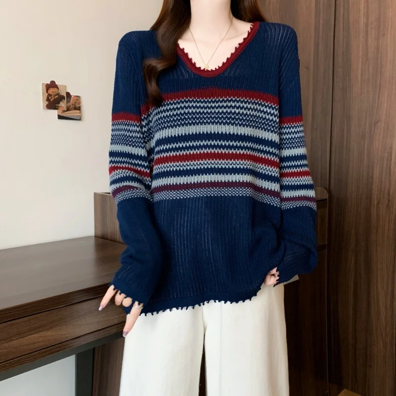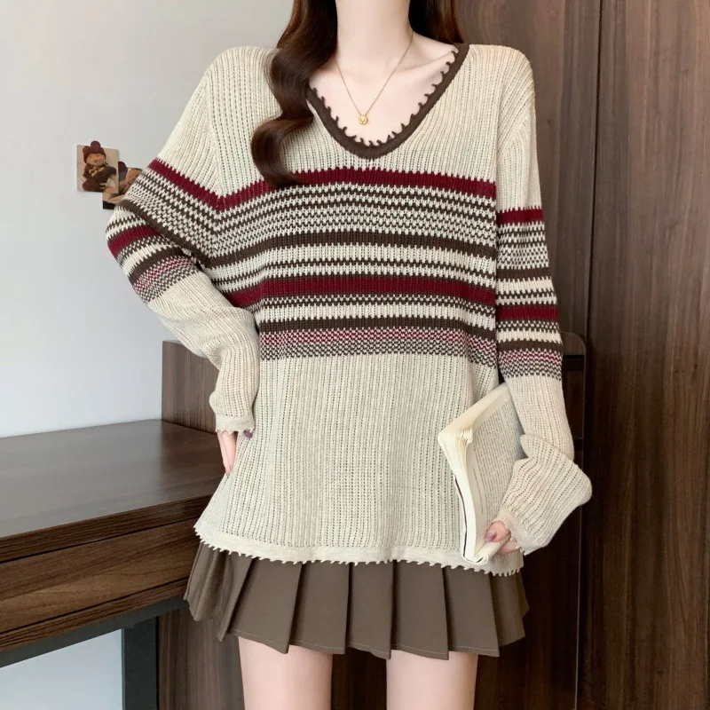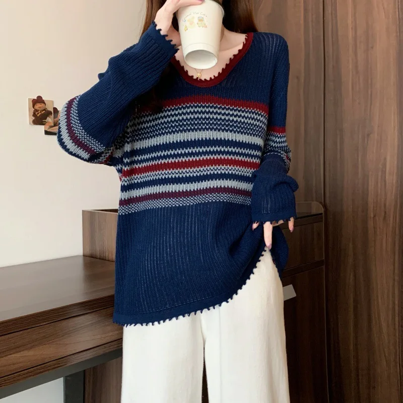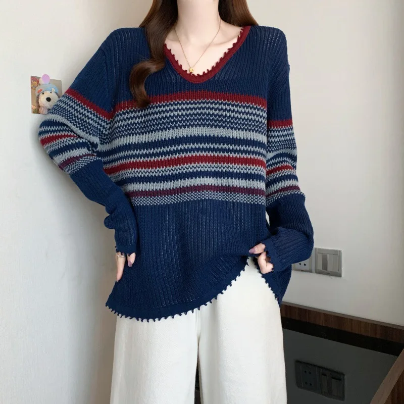 Loose Fit Stripe Knitwear Long Sleeve V-Neck Splicing Hollow out Casual Comfortable Women's Autumn New Style plus Size Top