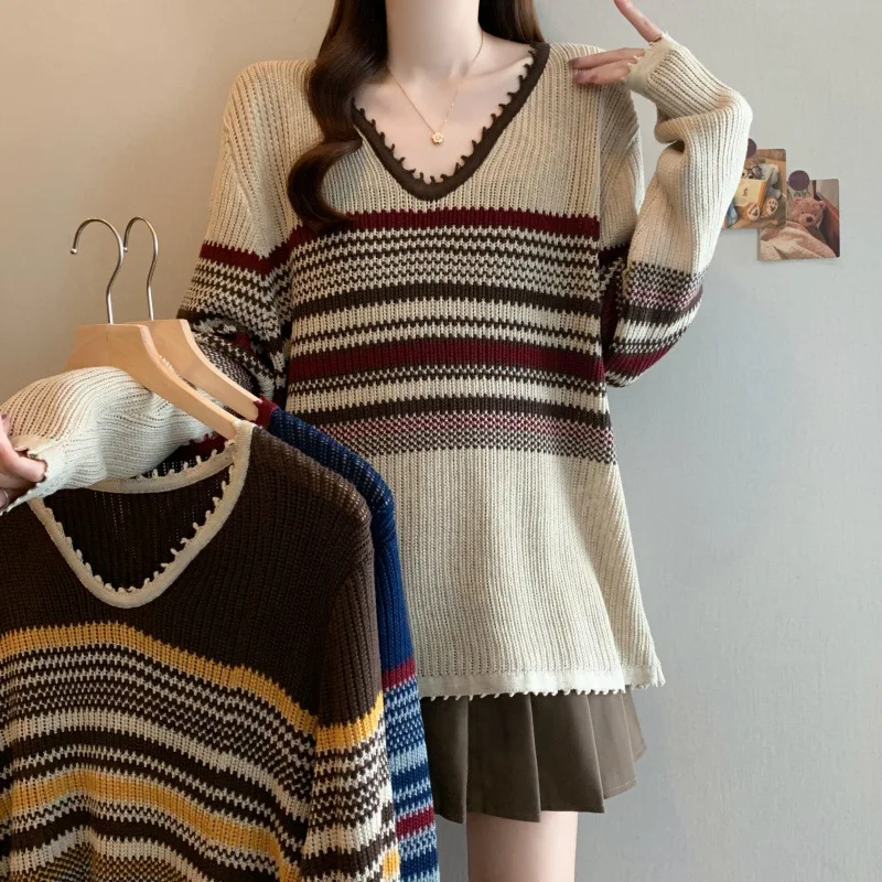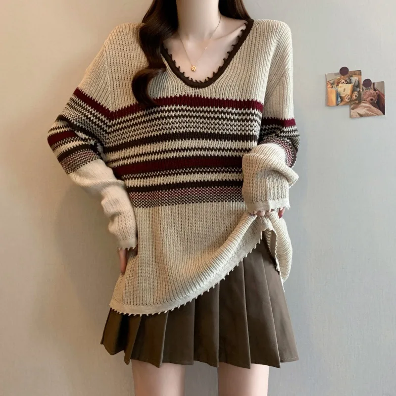Be the first to review “Loose Fit Stripe Knitwear Long Sleeve V-Neck Splicing Hollow out Casual Comfortable Women’s Autumn”