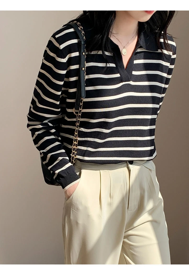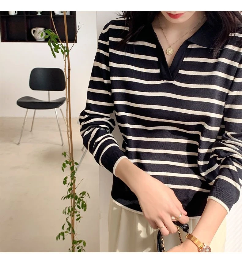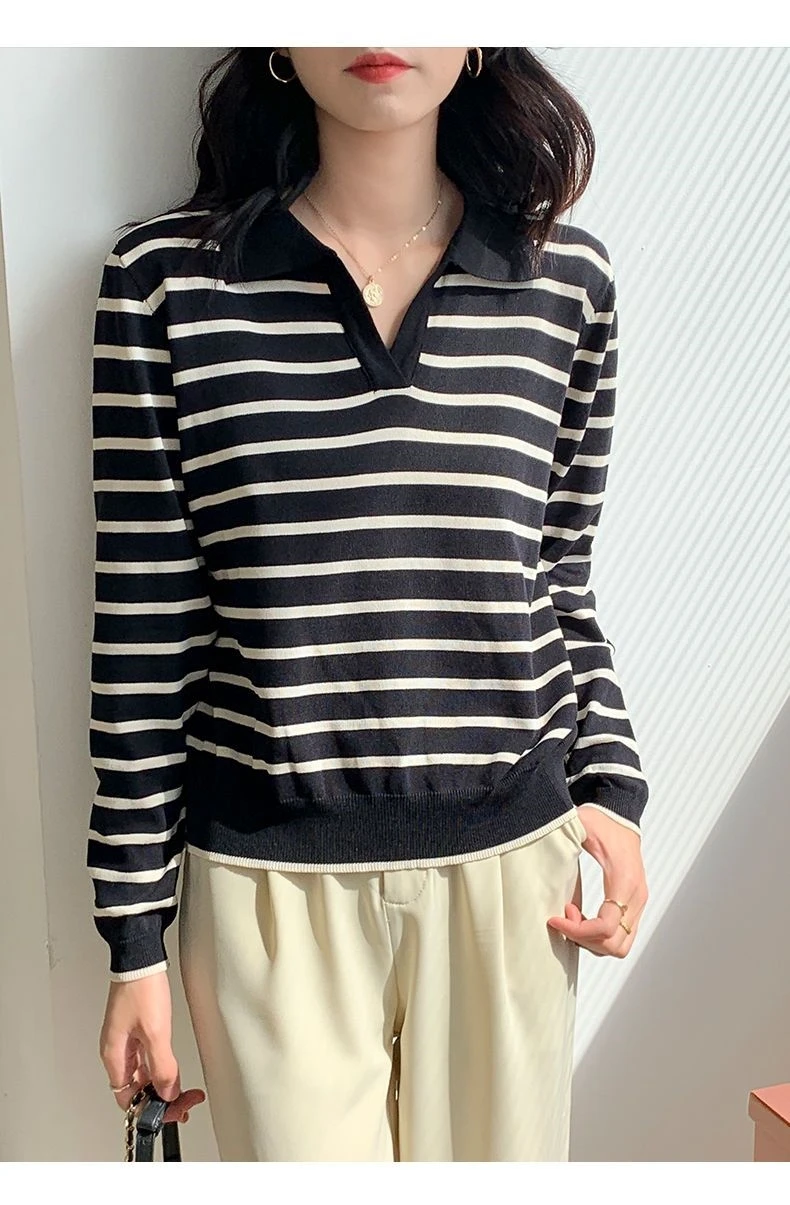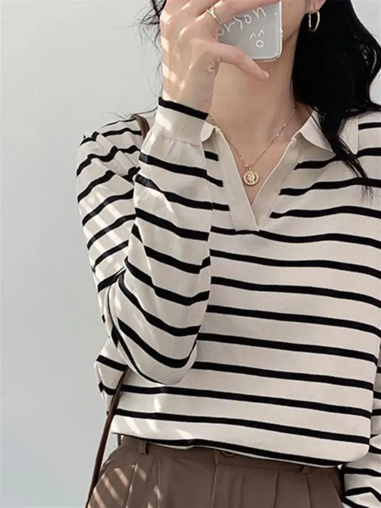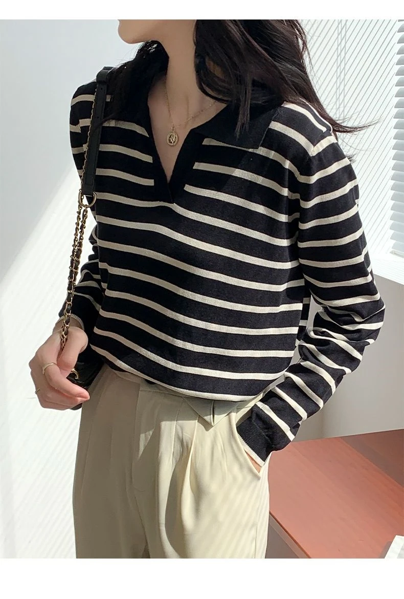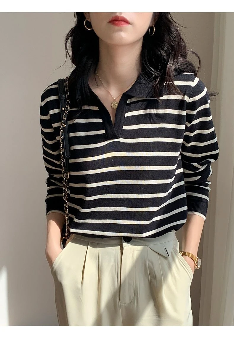 Loose Knitted Long Sve V-Ne Striped Base irt Women's T-irt Spring Autumn New Sle Commute Versatile Outerwear Top