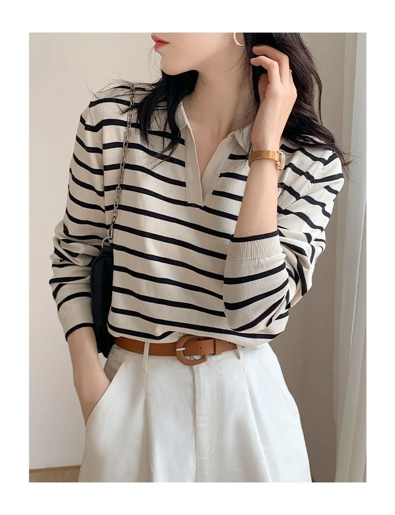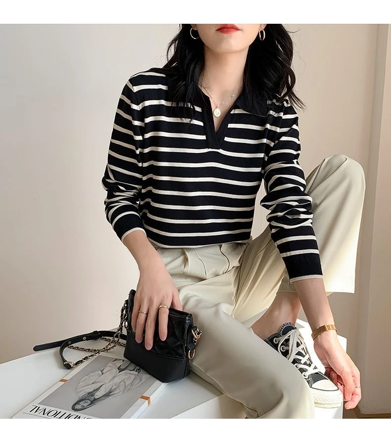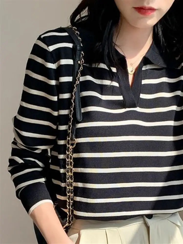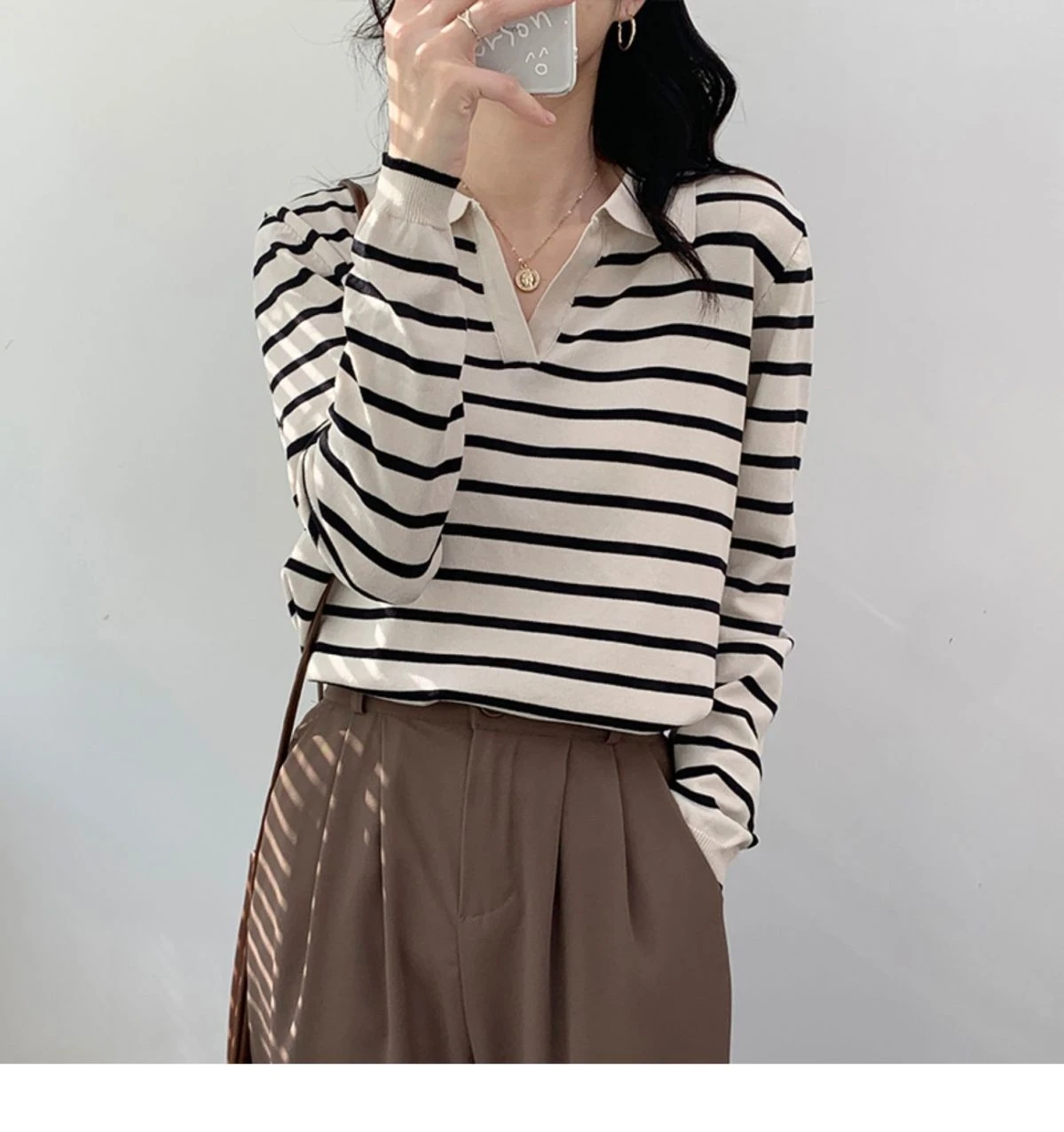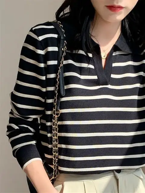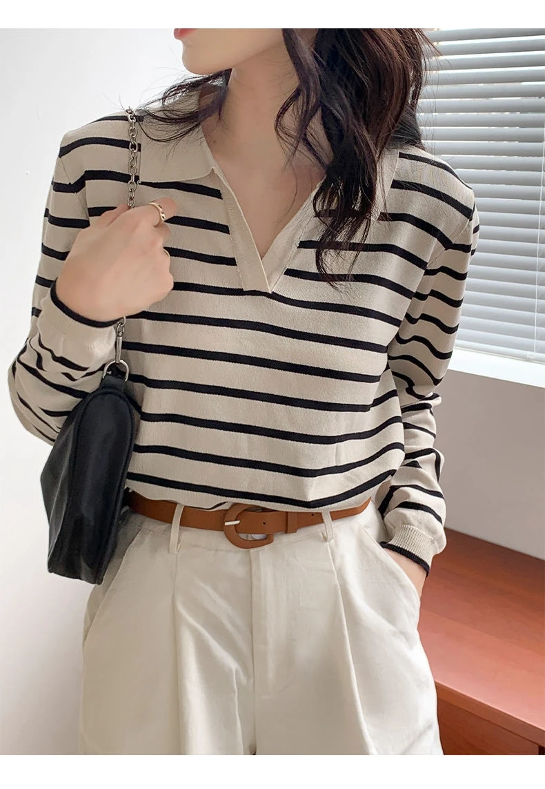 Loose Knitted Long Sve V-Ne Striped Base irt Women's T-irt Spring Autumn New Sle Commute Versatile Outerwear Top