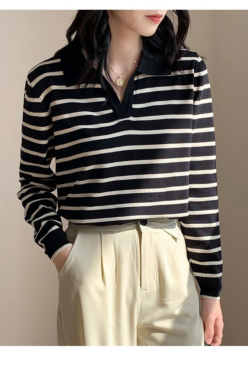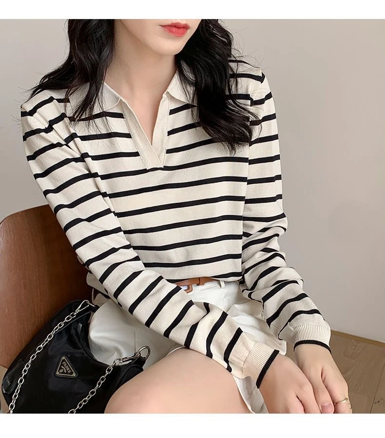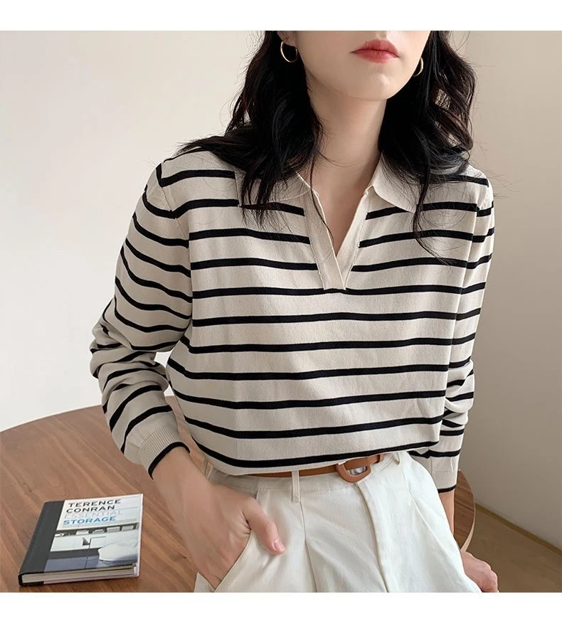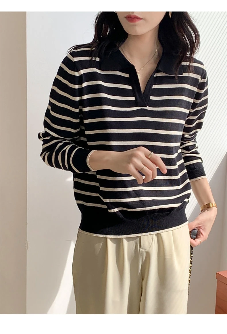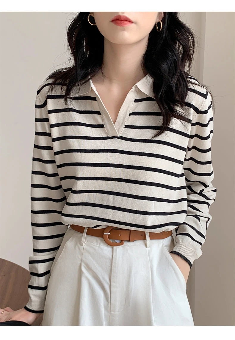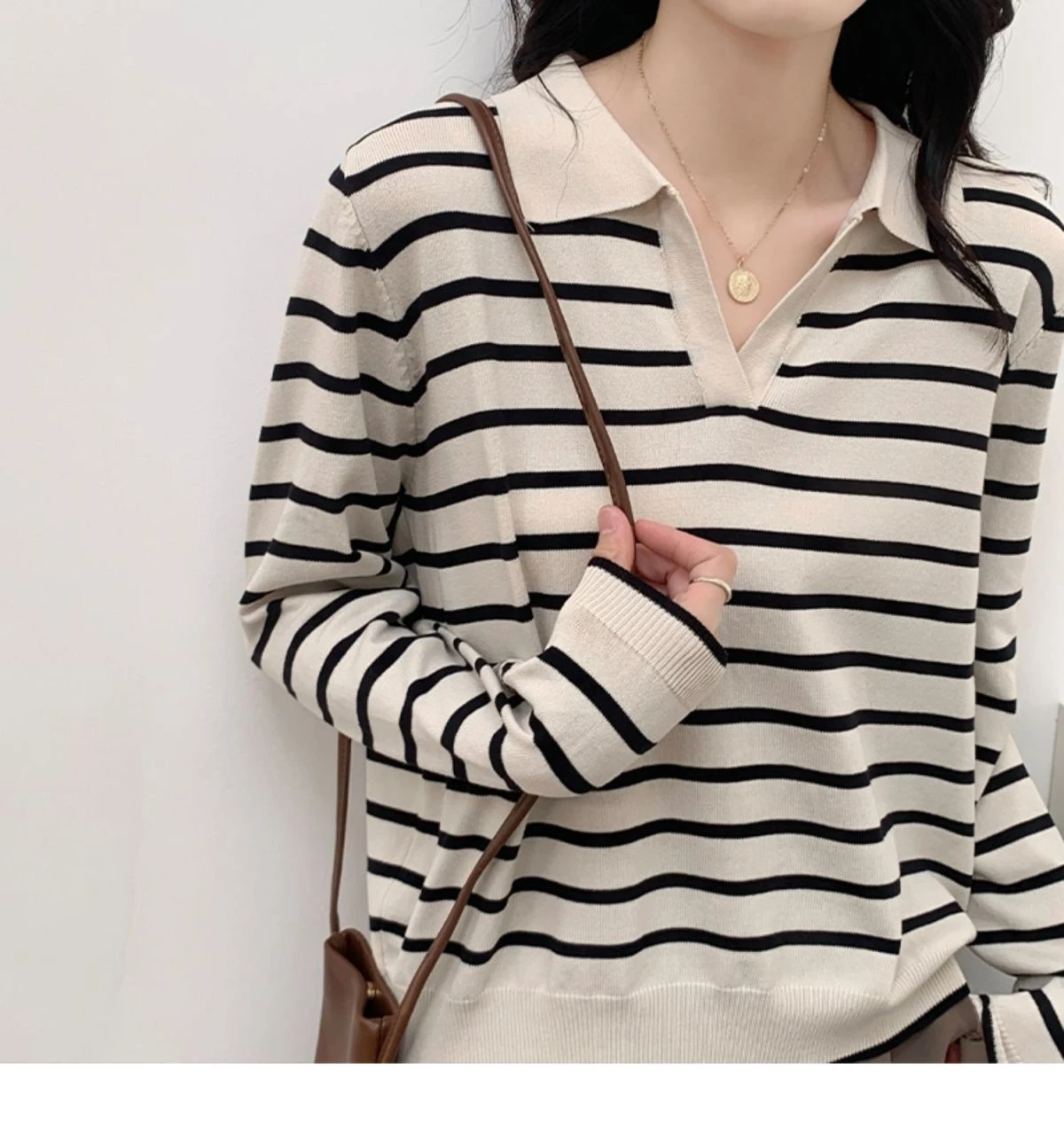 Loose Knitted Long Sve V-Ne Striped Base irt Women's T-irt Spring Autumn New Sle Commute Versatile Outerwear Top
