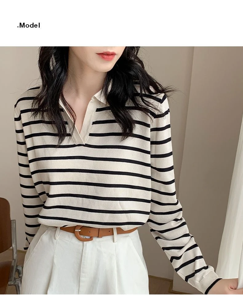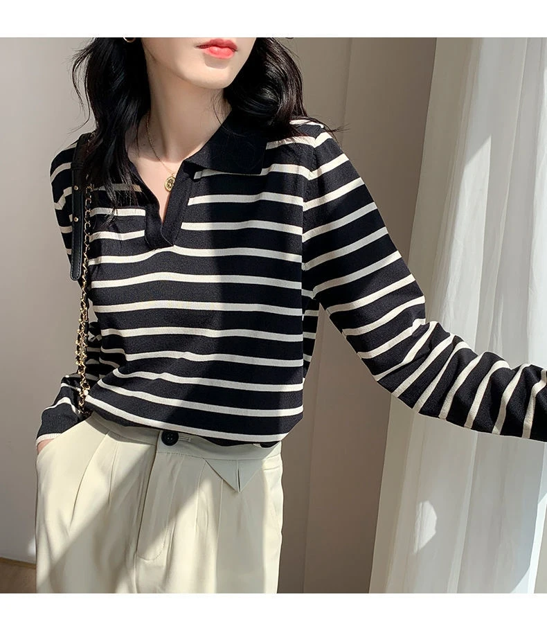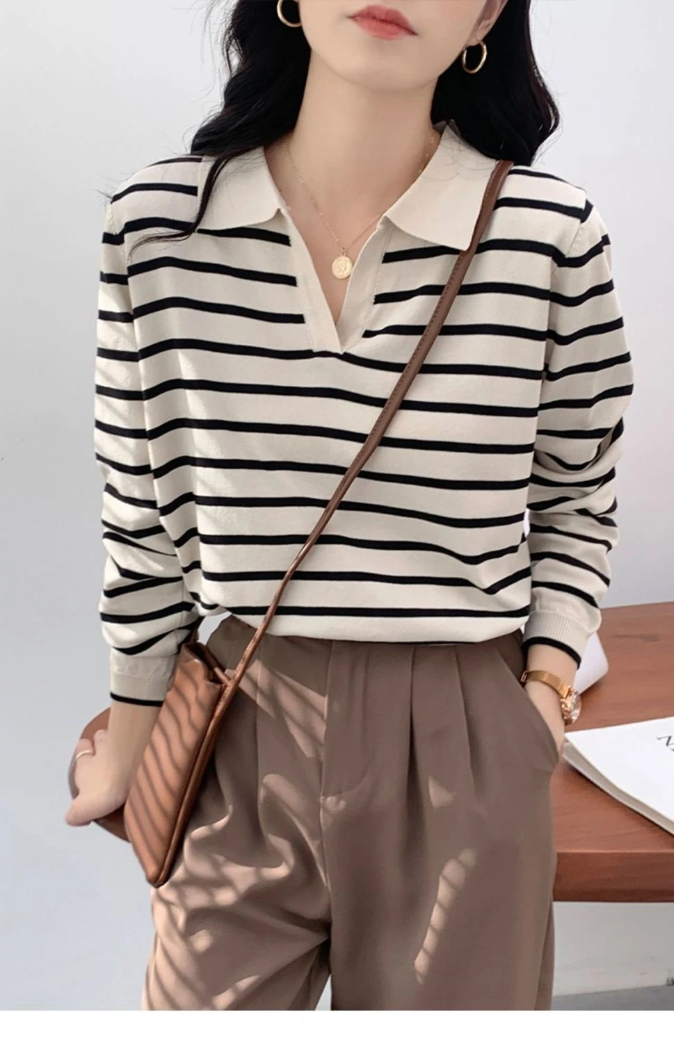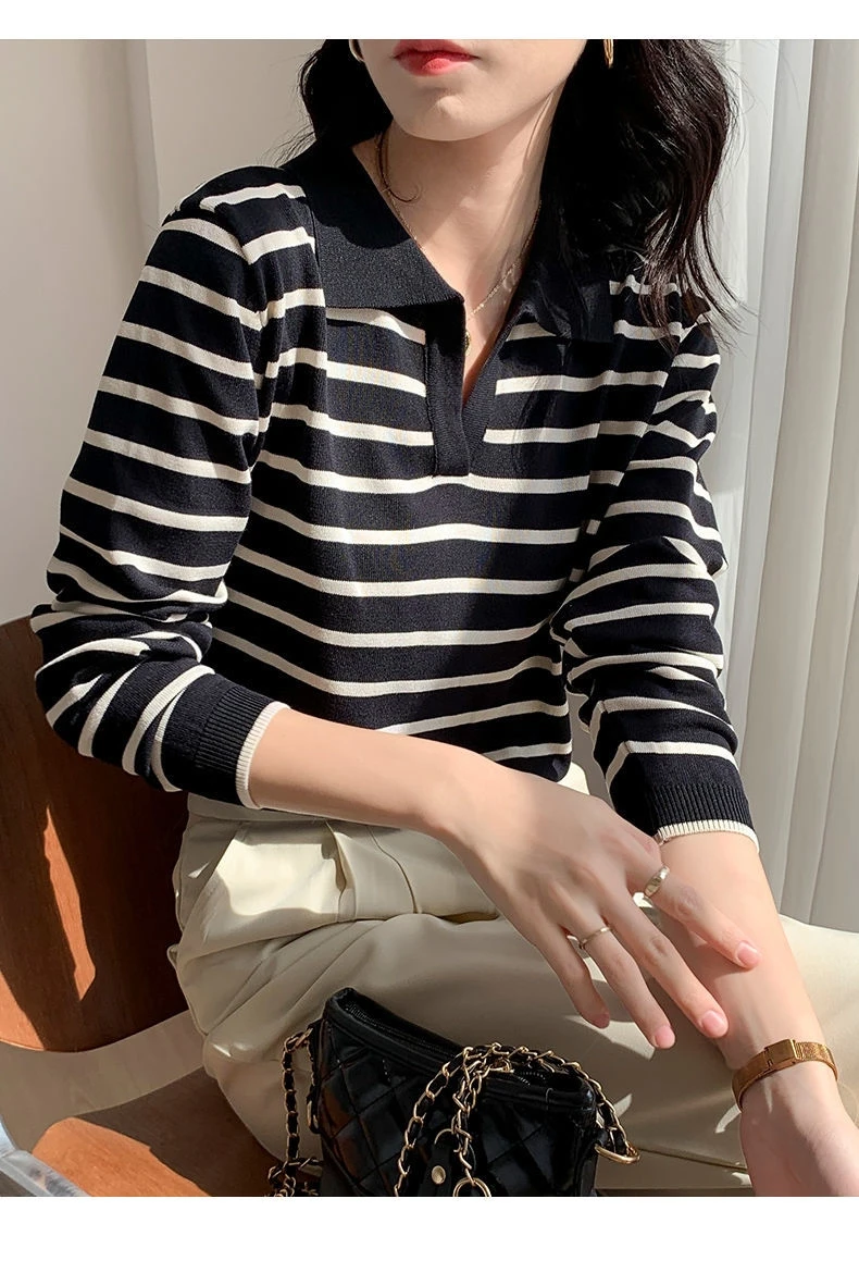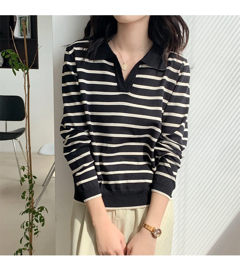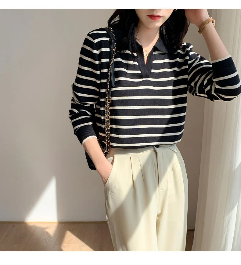 Loose Knitted Long Sve V-Ne Striped Base irt Women's T-irt Spring Autumn New Sle Commute Versatile Outerwear Top