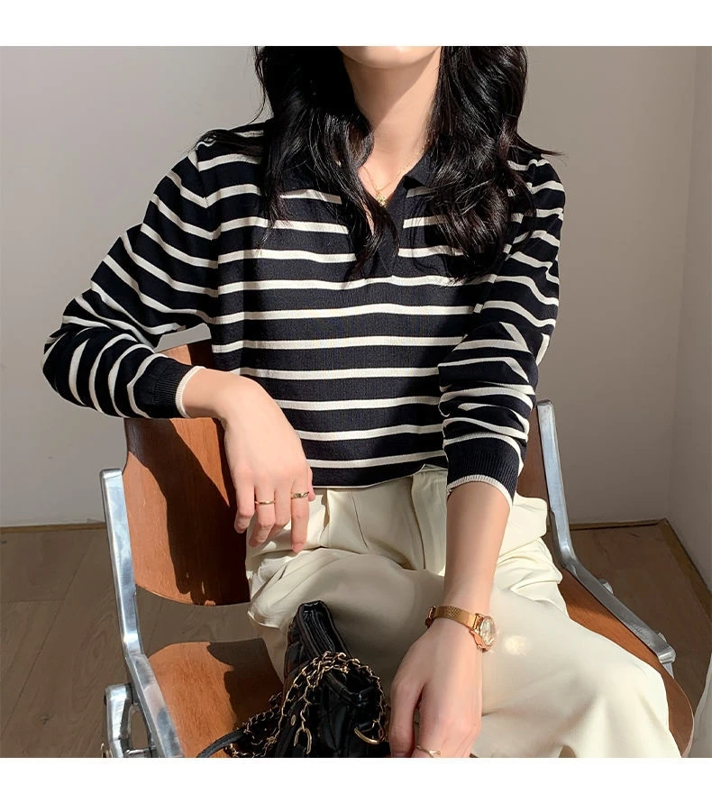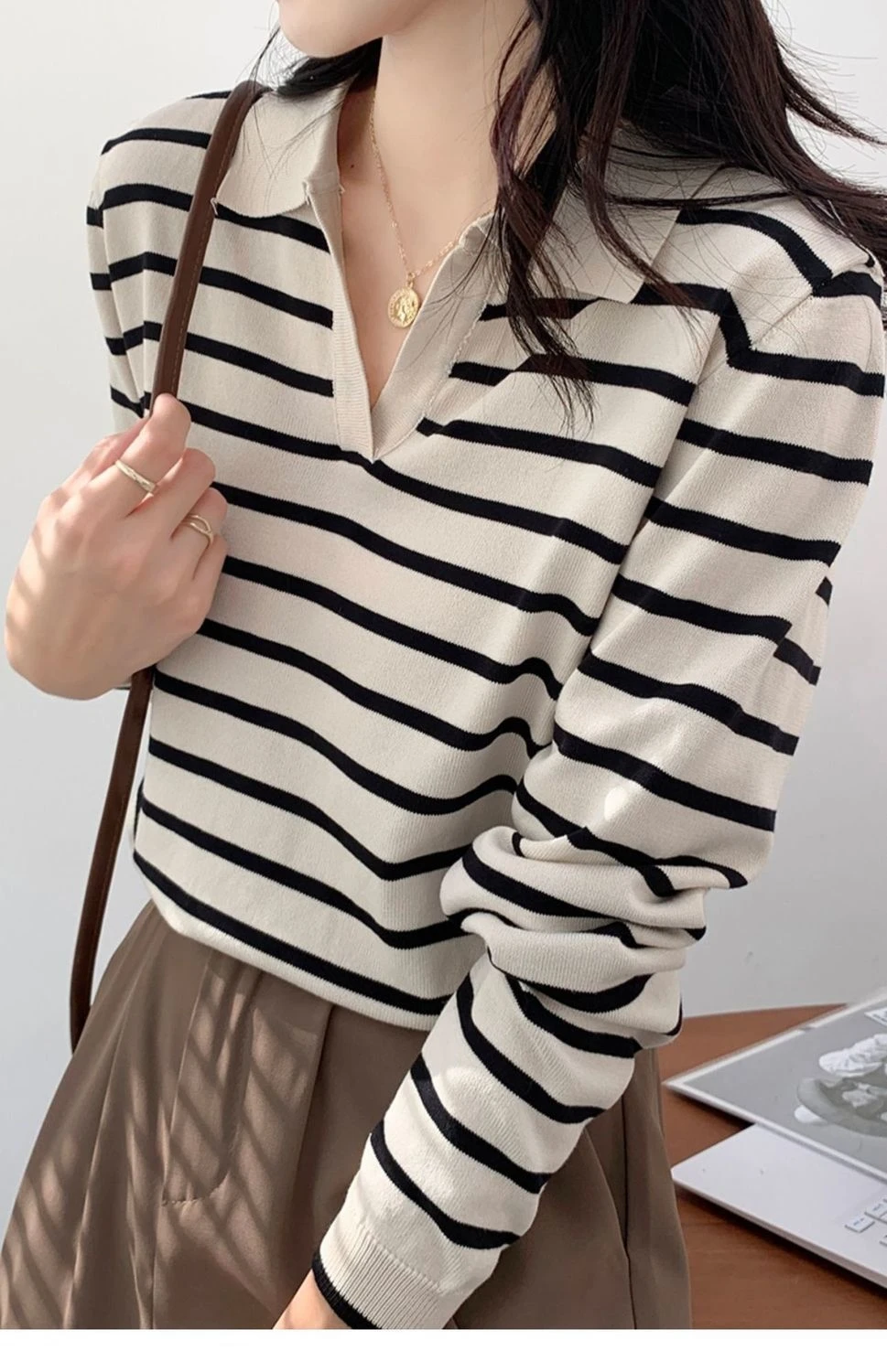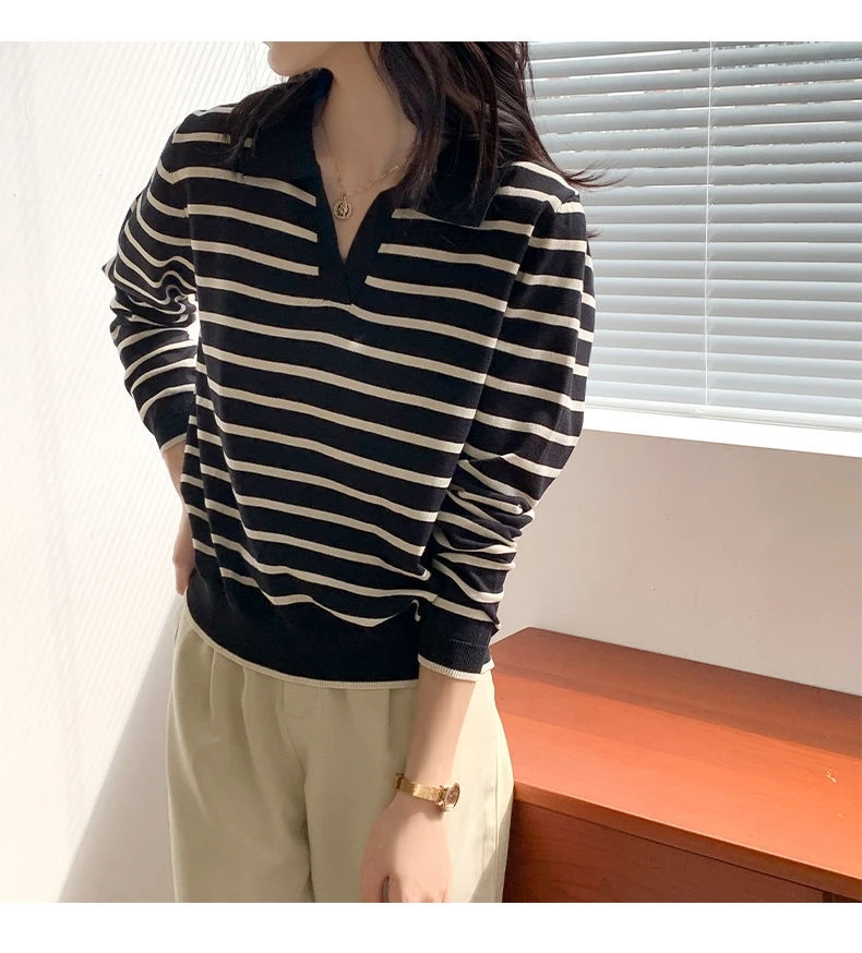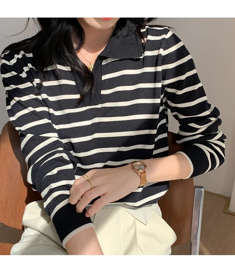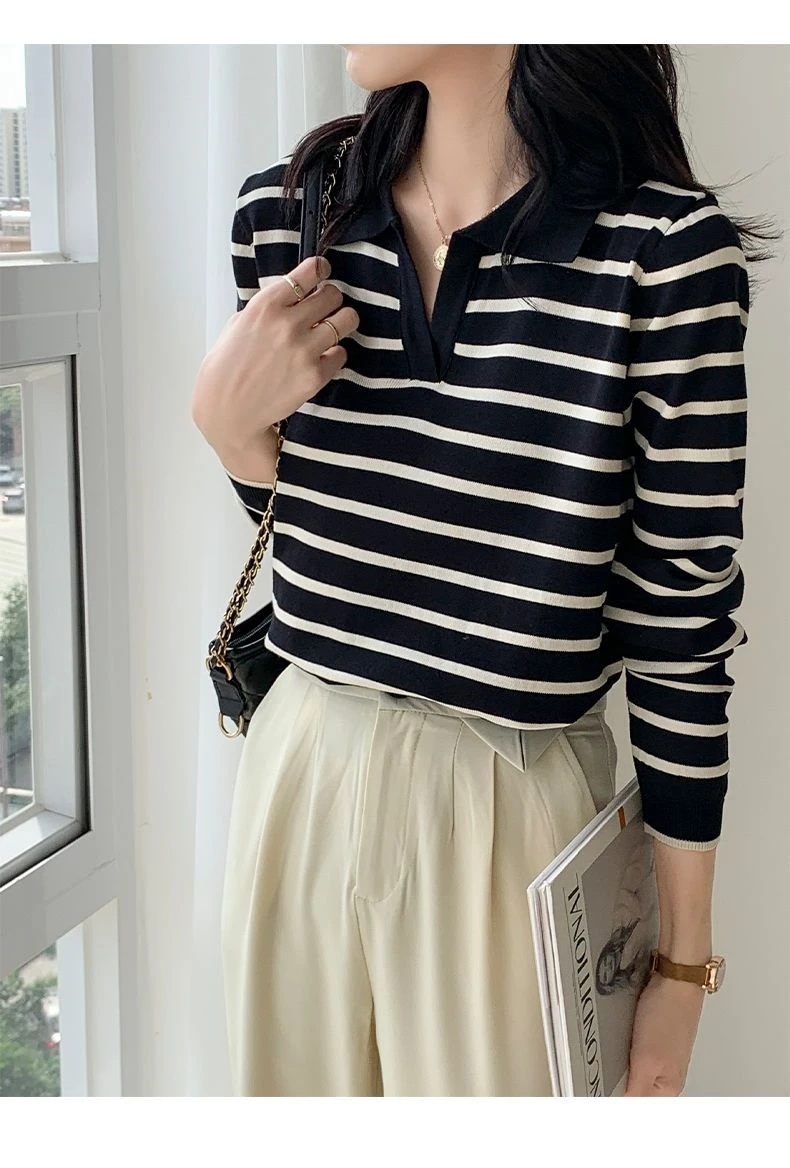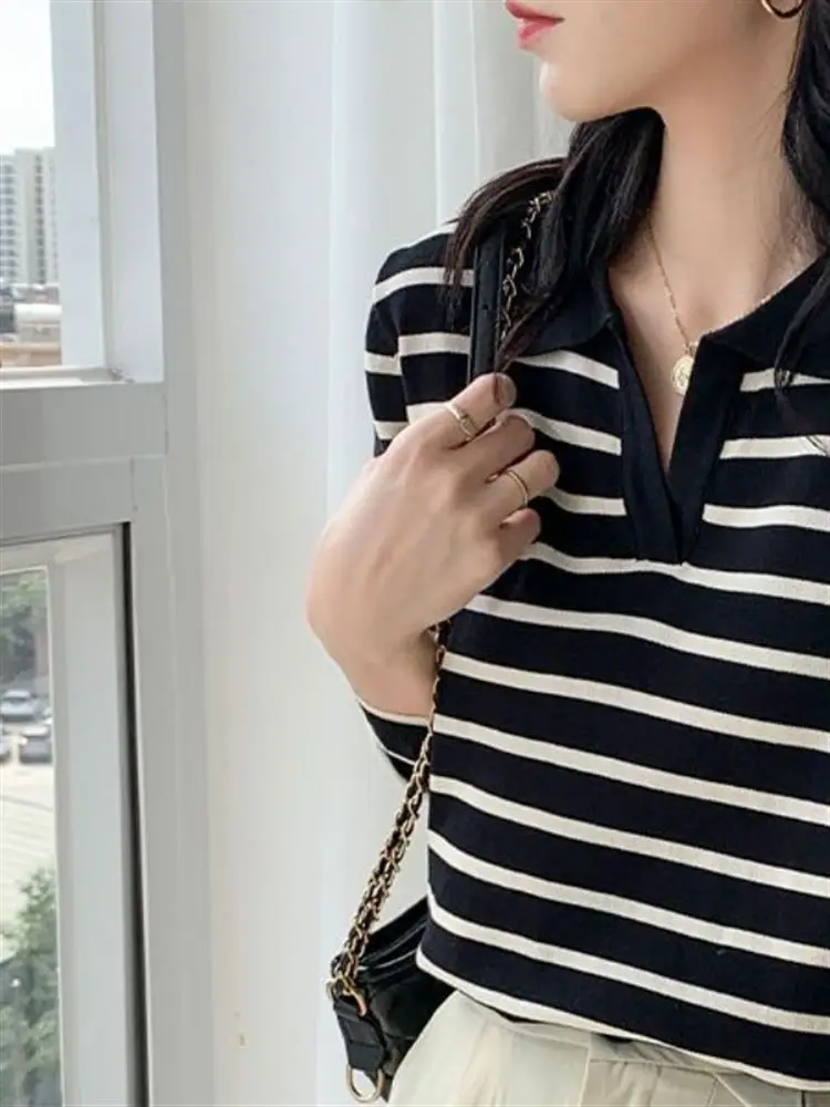 Loose Knitted Long Sve V-Ne Striped Base irt Women's T-irt Spring Autumn New Sle Commute Versatile Outerwear Top