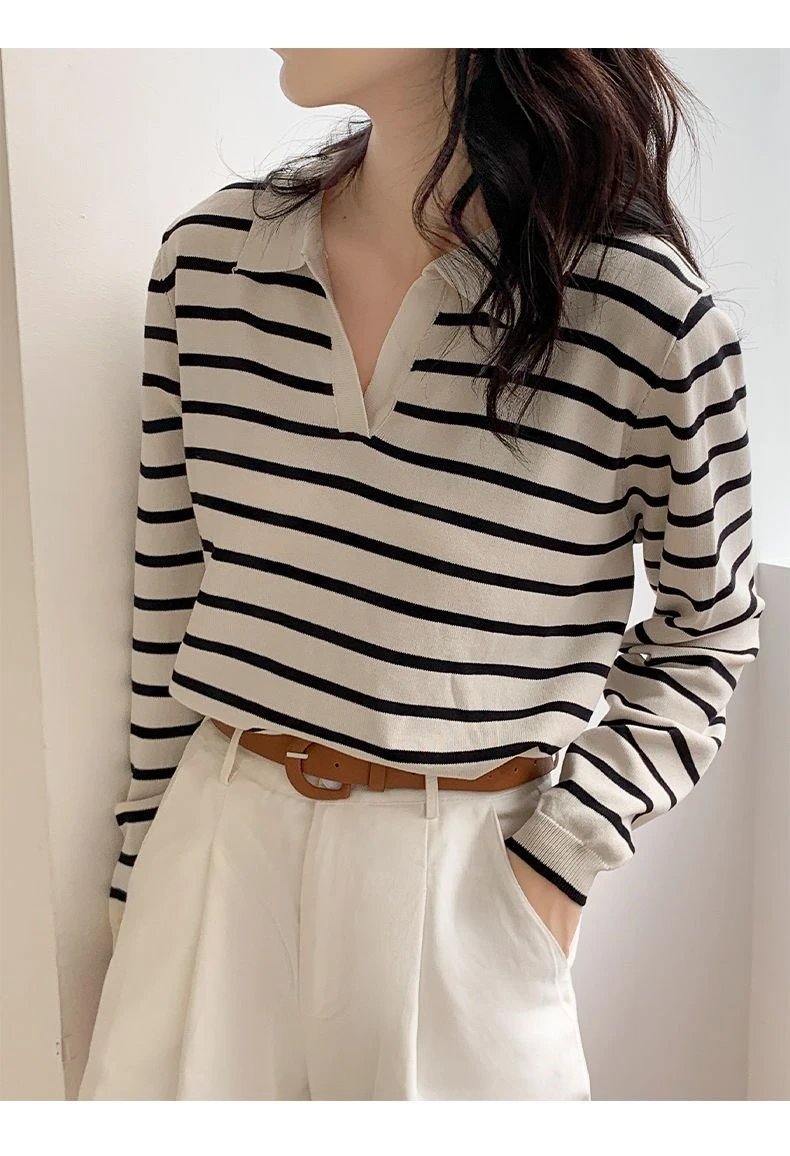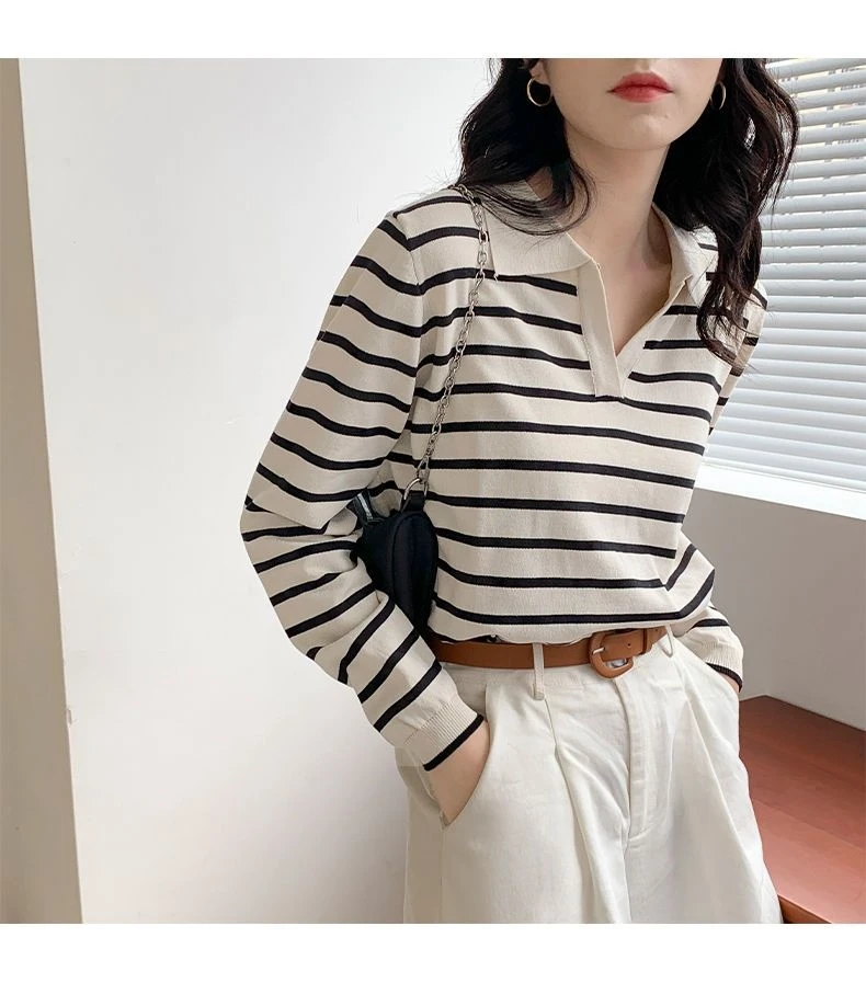 Loose Knitted Long Sve V-Ne Striped Base irt Women’s T-irt Spring Autumn New Sle Commute Versatile