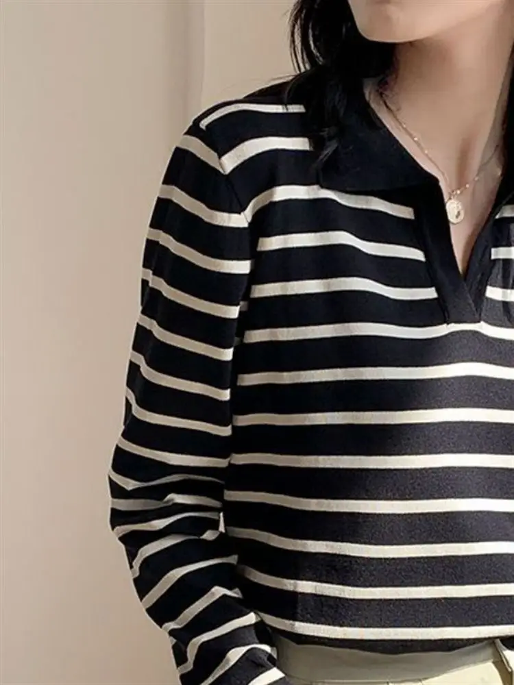 Loose Knitted Long Sve V-Ne Striped Base irt Women's  T-irt Spring Autumn New Sle Commute Versatile Outerwear Top