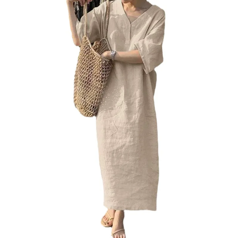 Loose ort Sve V-Ne Pure Color Cotton Linen Women’s Dr Summer Thiened Waist Sle Chinese Production