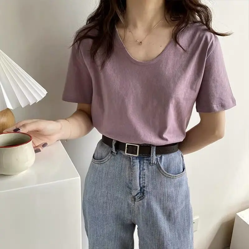The pure color pattern of this T-shirt adds a touch of simplicity and elegance, making it a versatile piece for any outfit.