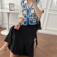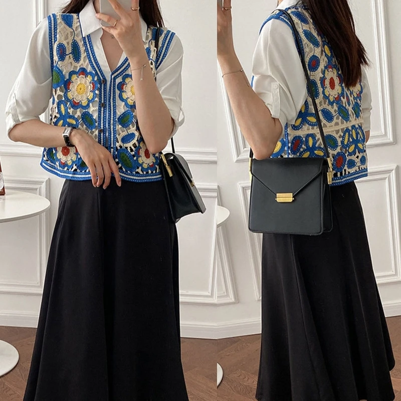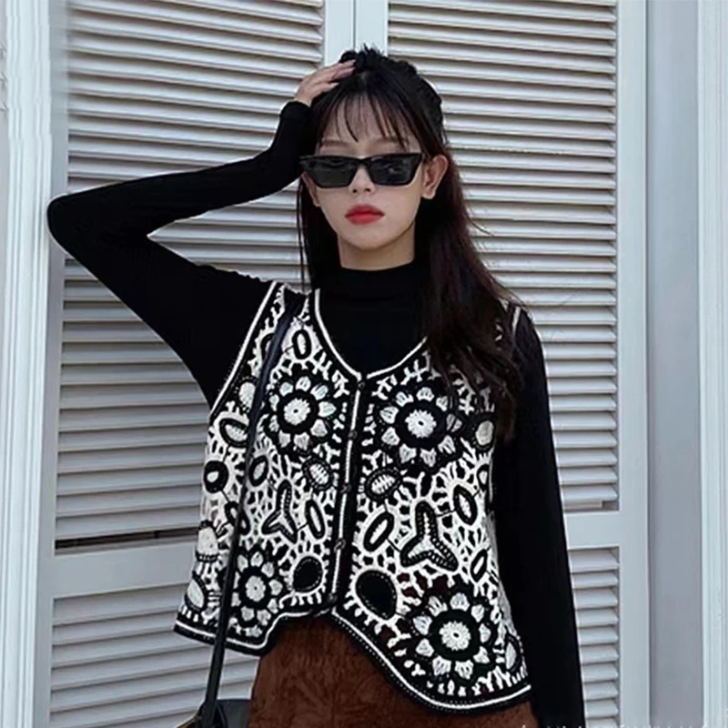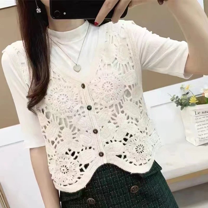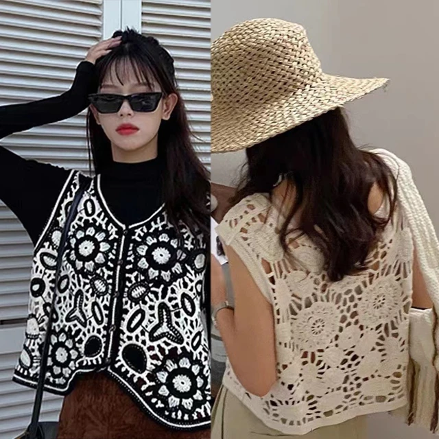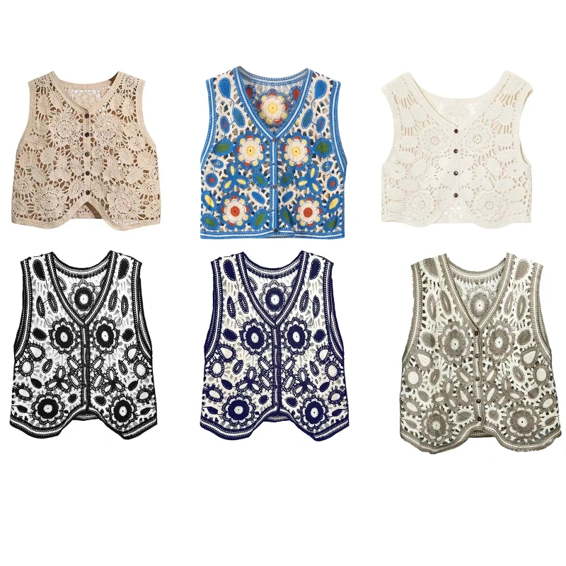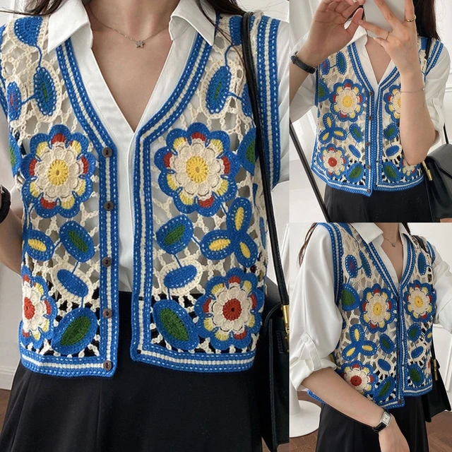 Design: Sweet floral crochet tops for girls, waistcoat tops for girls, sleeveless, hand crochet embroidery openwork buttons front tops, make you look lovely and charming.