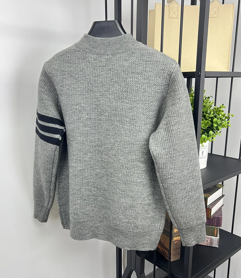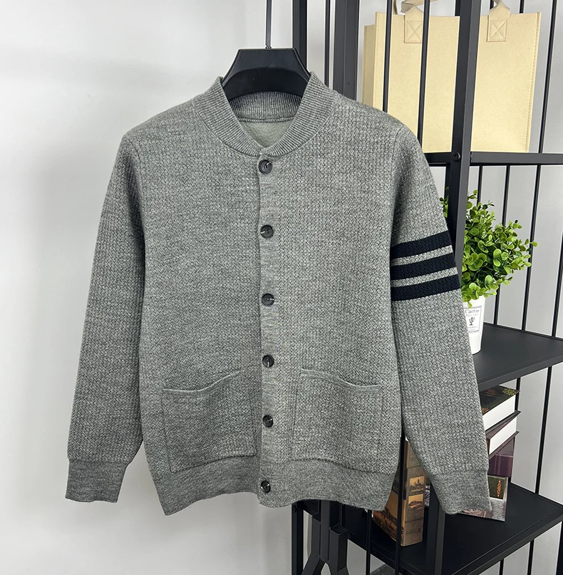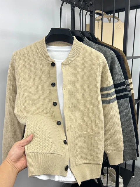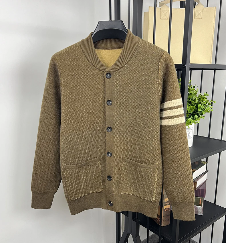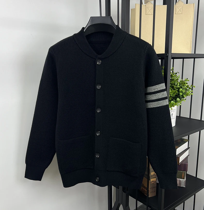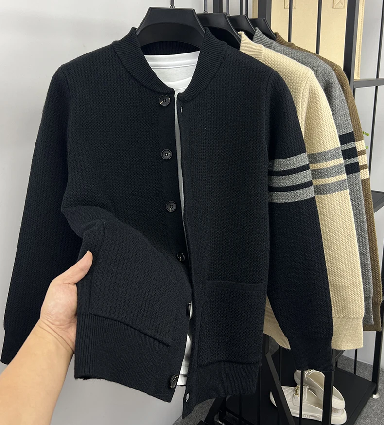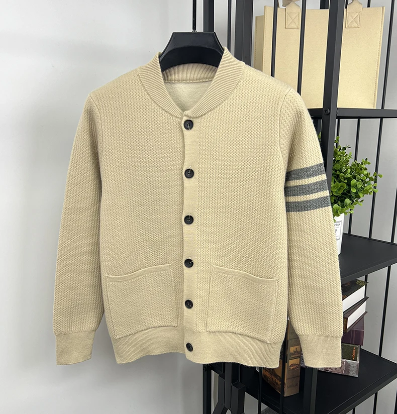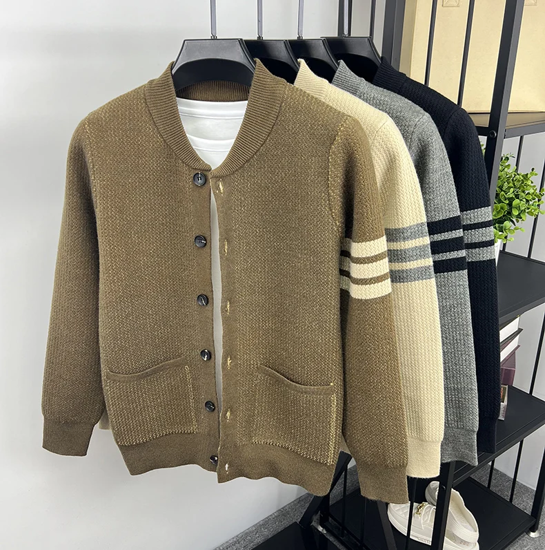 Luxury Design Brand Men’s Knit Cardigan Baseball Collar 3 Stripe Sweater Coat Korean Fashion Velvet