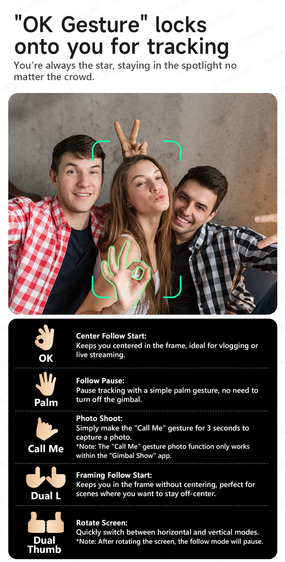 2. Gesture control, ‘OK’ lock protagonist mode;