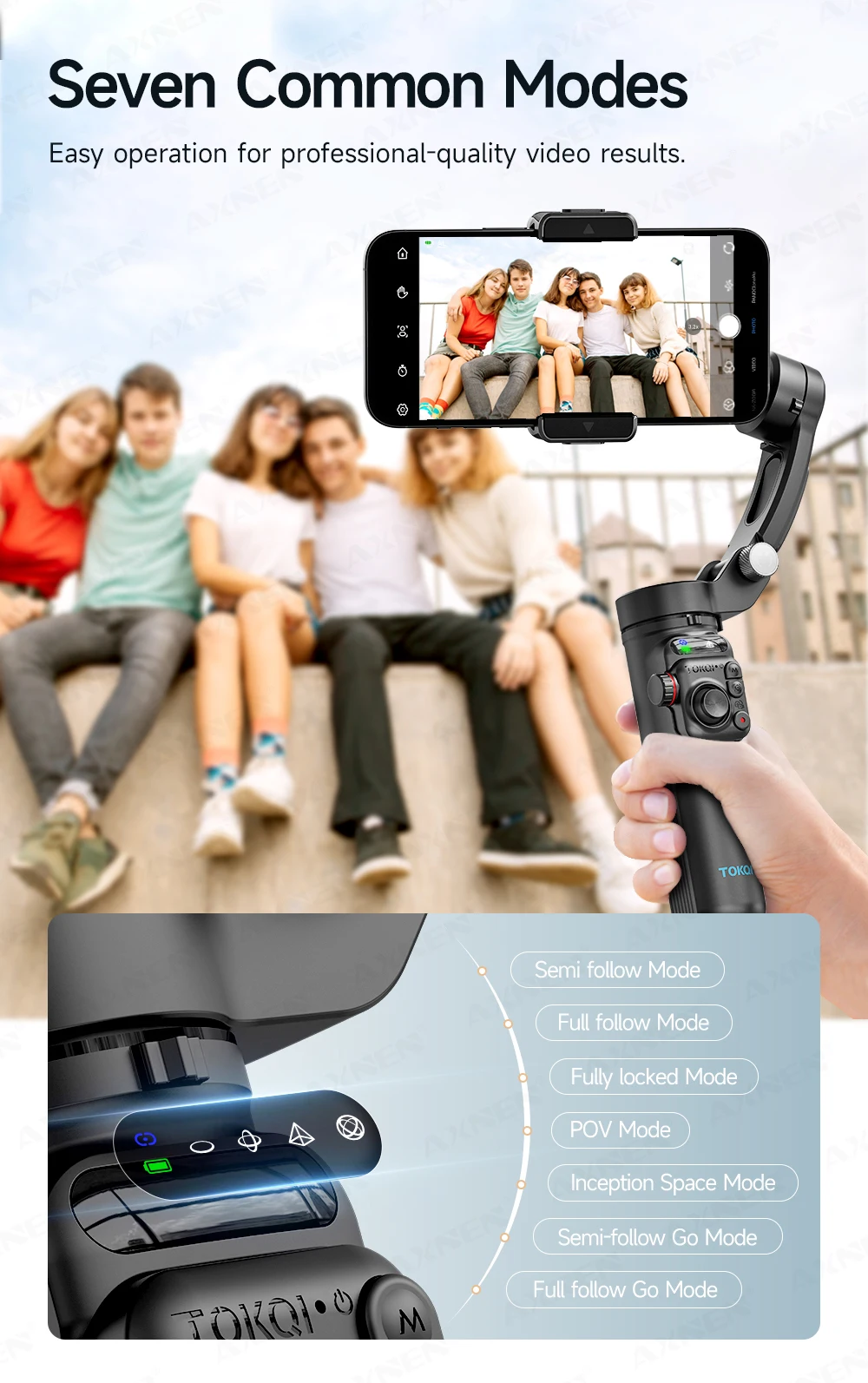 Gimbal working mode: Semi-follow, Full follow, Fully Locked, POV, Inception Space, Semi-follow Go Mode, Full follow Go Mode