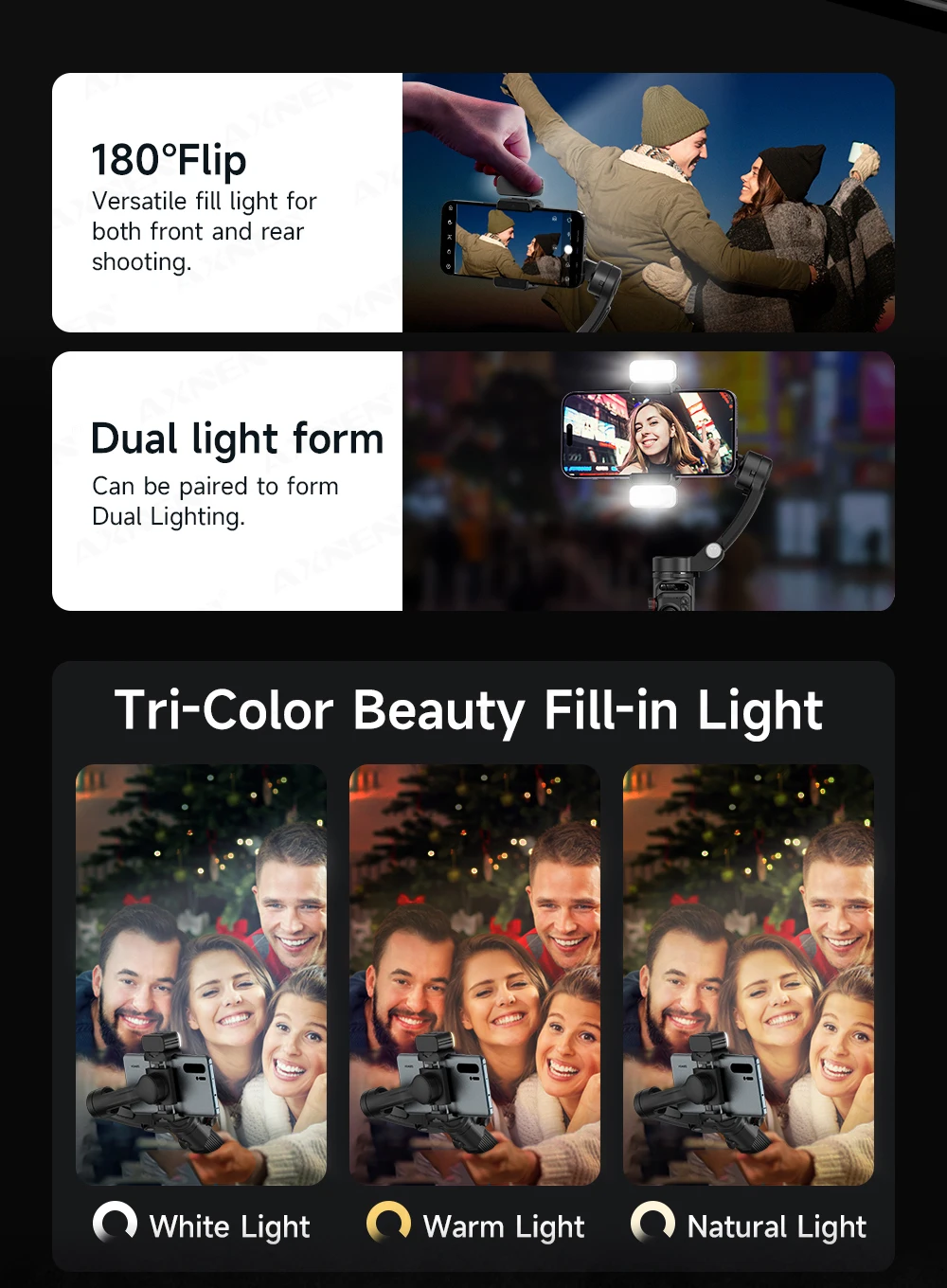 5. Equipped with magnetic fill light module, three colours and nine modes adjustment;