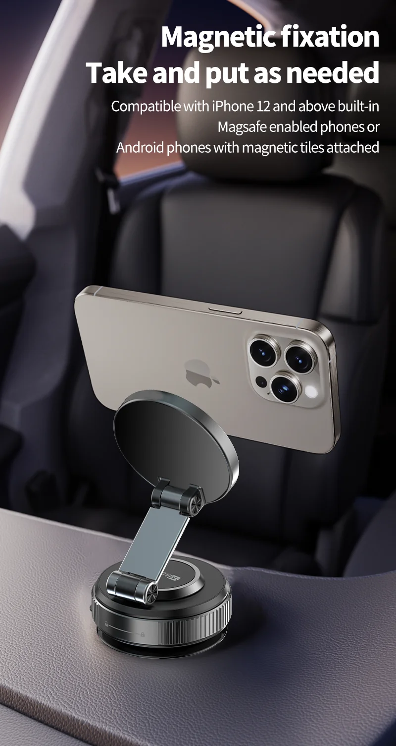 【One-Touch Vacuum Phone Mount Operation】No batteries needed! Activate the vacuum suction magnetic phone holder grip by twisting the knob; reverse to release without residue. Effortlessly switch between car phone mount locations or surfaces, ideal for multi-vehicle use.