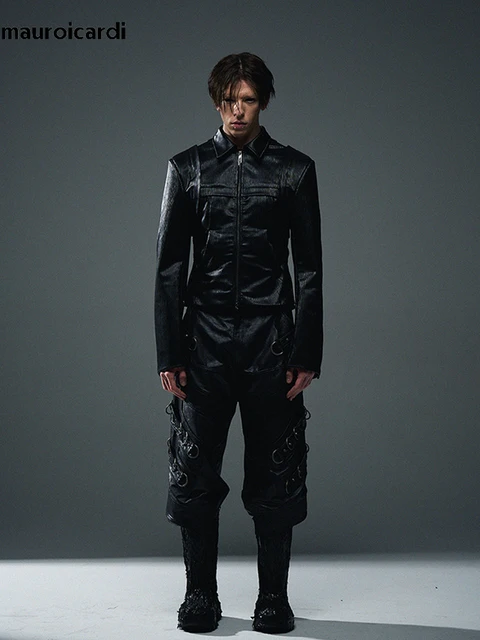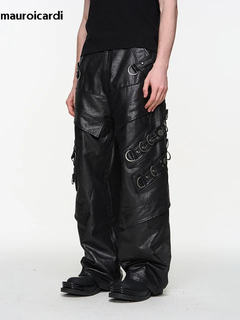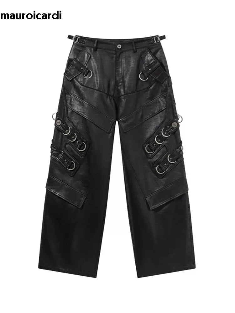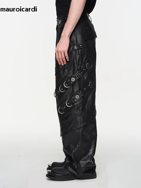 Mauroicardi Spring Autumn Cool Handsome Long Black Pu Leather Motorcycle Pants for Men High Quality Mens Designer Clothes 2024