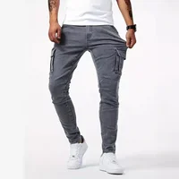 Men Fashion Casual Pencil Elasticity Jeans Male Multi Pocket Small Slim High Street Denim Pants Wash Solid Vintage Trousers