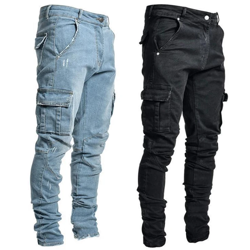 Men Fashion Casual Pencil Elasticity Jeans Male Multi Pocket Small Slim High Street Denim Pants Wash Solid Vintage Trousers