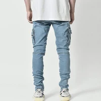 Men Fashion Casual Pencil Elasticity Jeans Male Multi Pocket Small Slim High Street Denim Pants Wash Solid Vintage Trousers