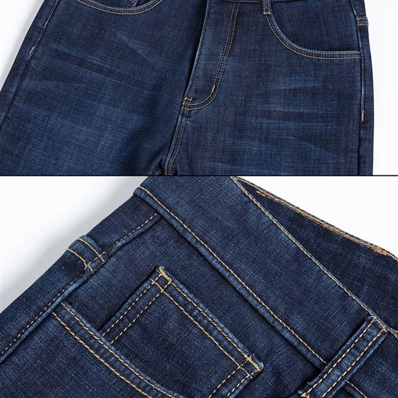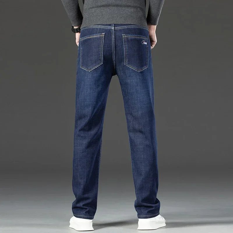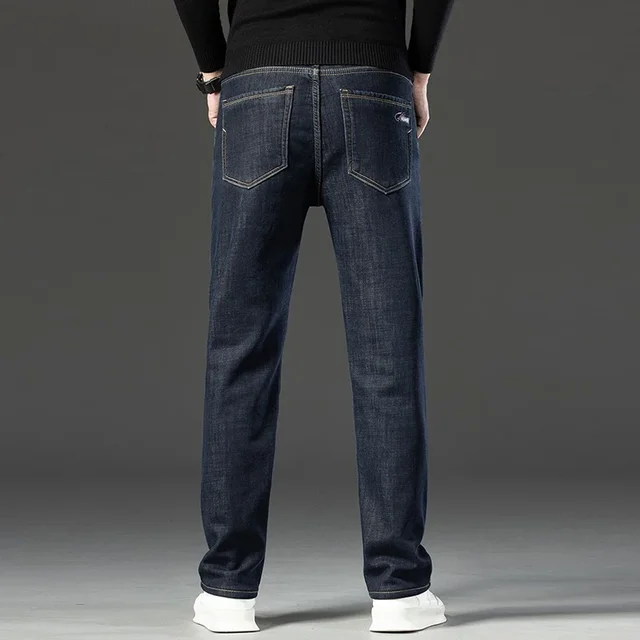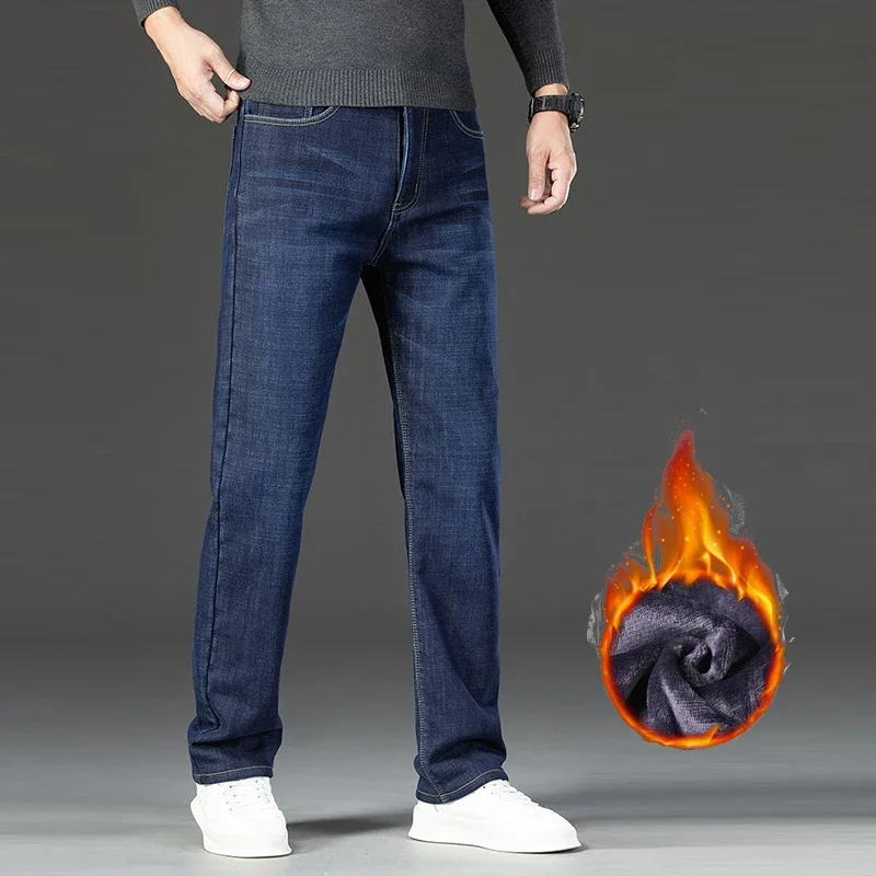 Men Fleece Lined Straight Jeans Male Winter Warm Fleece Lined Thickened Denim Pants Elasticity Comfortable Casual Loose Trousers