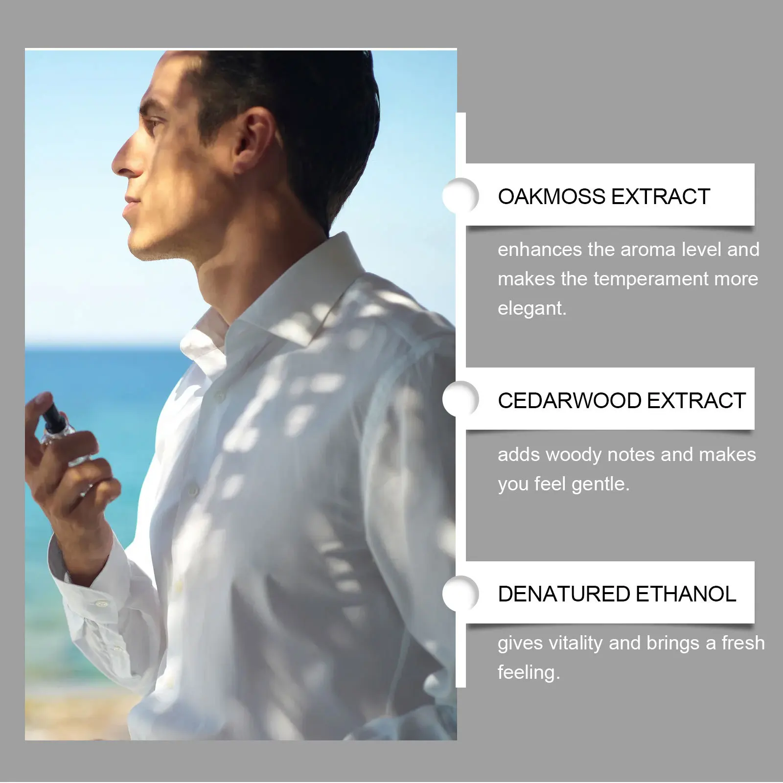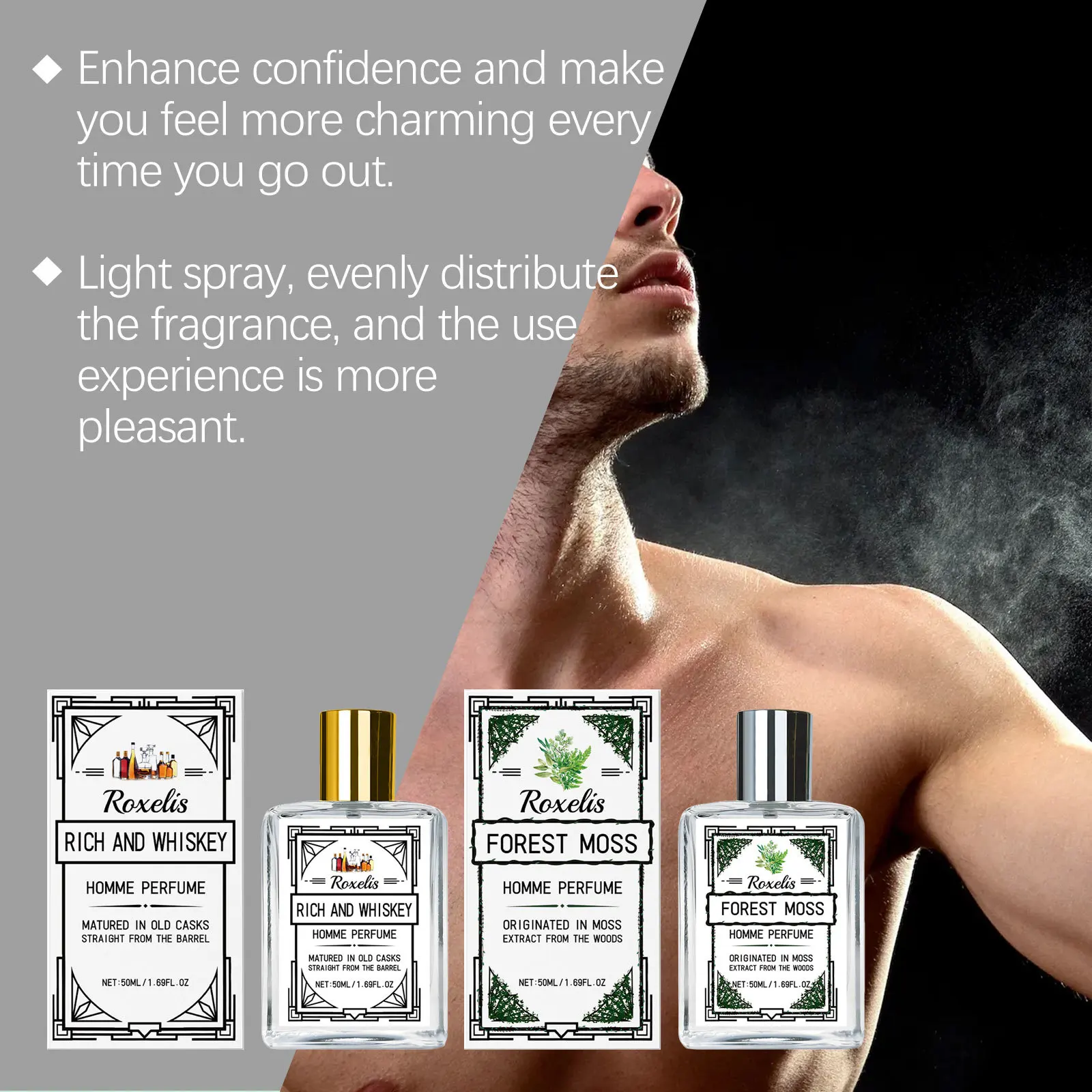 Our charming men’s perfume is carefully blended with vanilla extract and sandalwood extract. Designed for people with heavy body odor, obvious sweat and excessive oil secretion. The use method is very convenient: the perfume spray on the wrist, neck, buttocks and other parts, so that the perfume evenly spread over the body, leaving a 1 of aromatic aroma. And can add wood flavor, make you feel gentle.