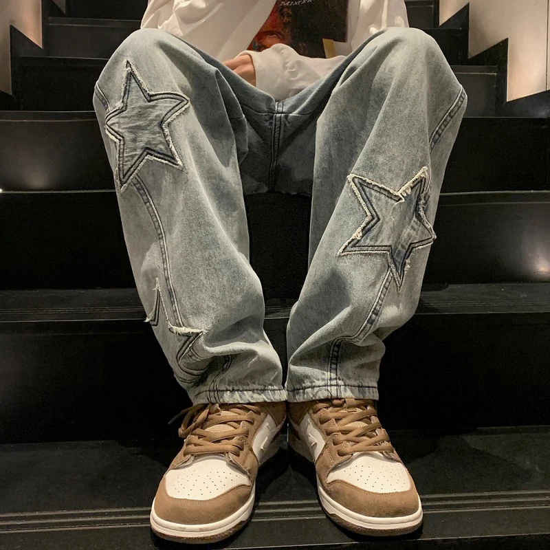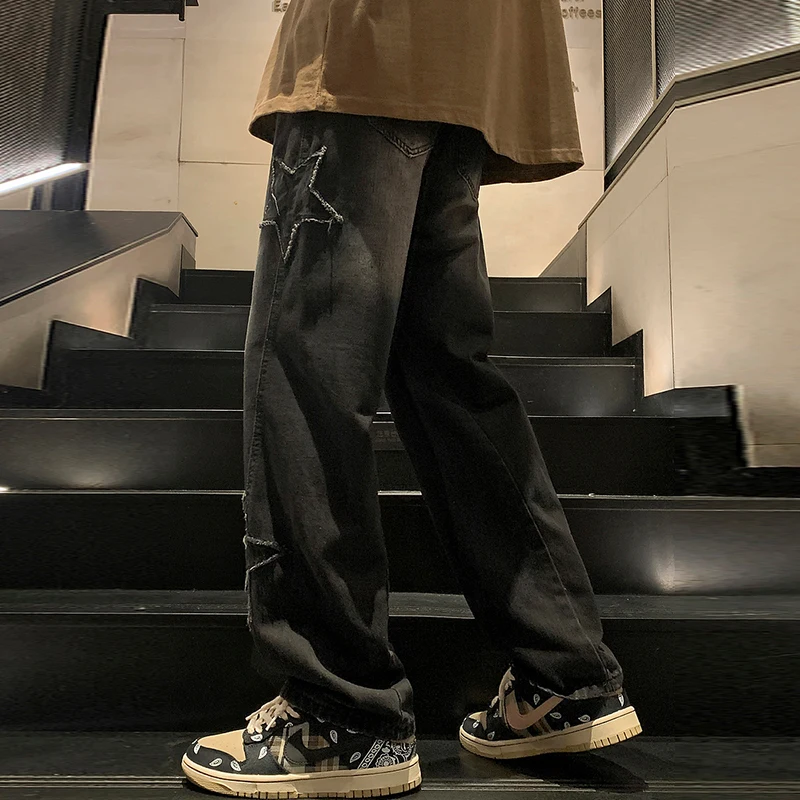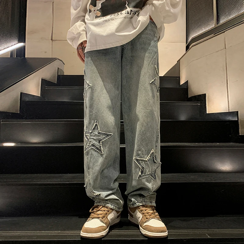 Men Star Embroidery Straight Casual Jeans Gothic Neutral Denim Pants Loose Hip-hop Fashion Youth Streetwear