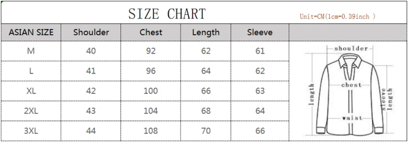 Note: We sell ASIAN SIZE is about2-3 sizeSMALLER than US,UK,AU,EU size.Please choose the size according to our size form.All the dimensions we have personally measured and reality try. When you place the order please live the message with your Shoulder(CM) and Chest(CM) .We will help you to confirm the size.Think you for buying !