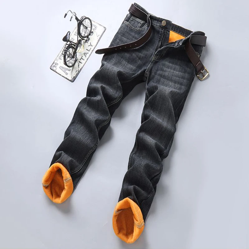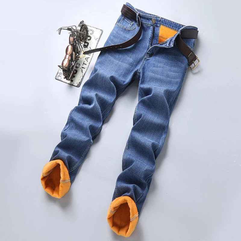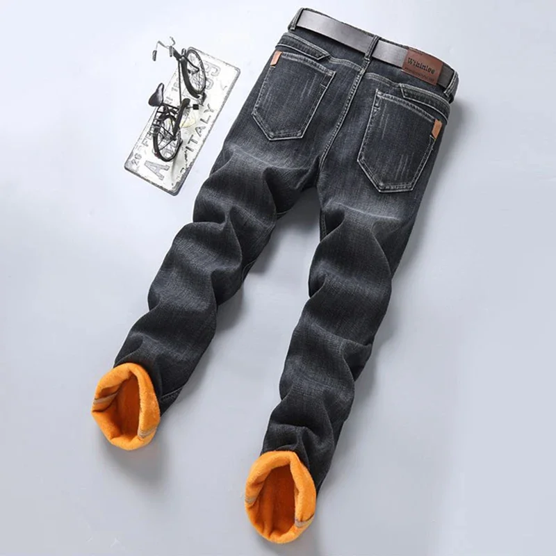 Men Warm Fleece Lined Thickened Jeans Male Fashion Windproof Vintage Denim Pants Daily Classic Slim Fit