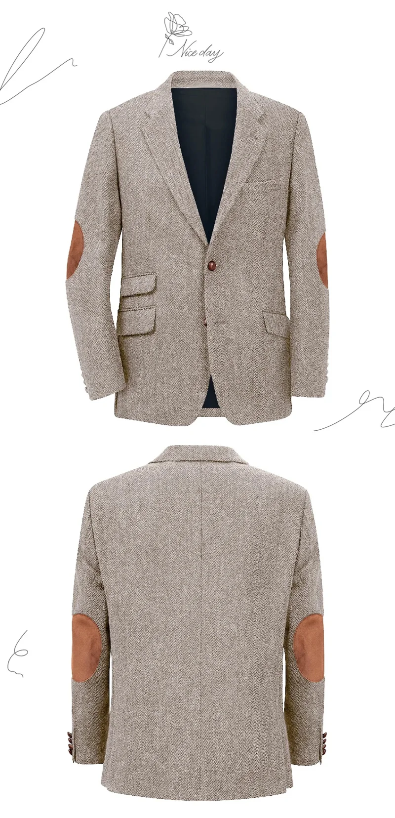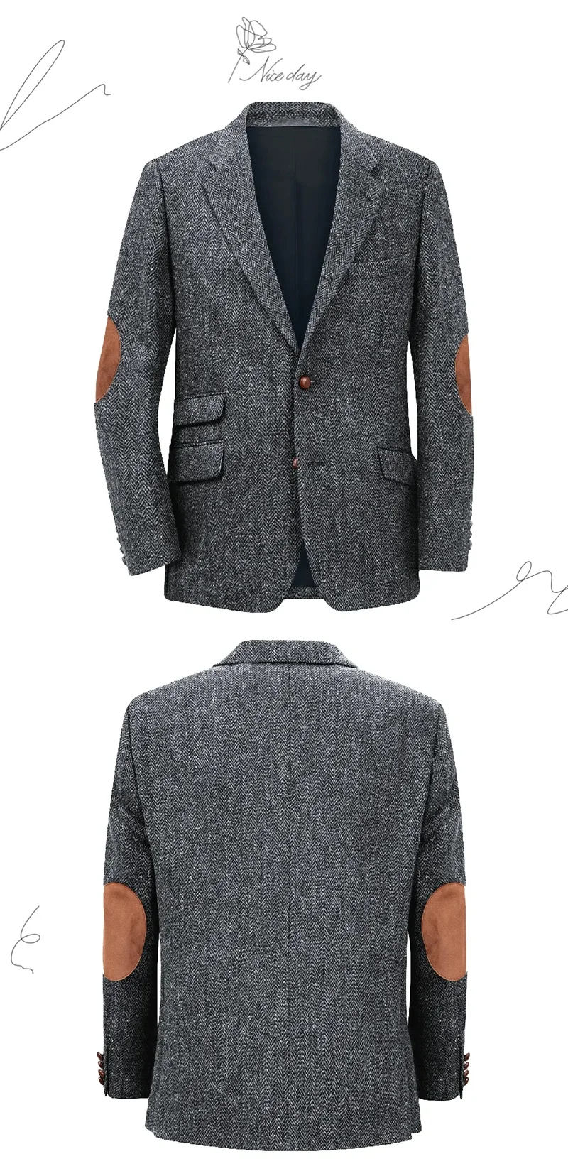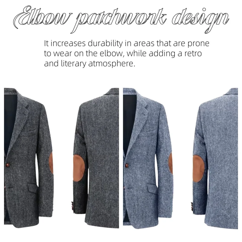 – From the style point of view, it has a retro and classic charm, and the patch design of herringbone fabric and elbows adds a retro texture and detail, and the overall style is inclined toward the British retro style.