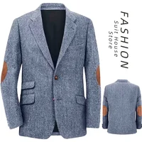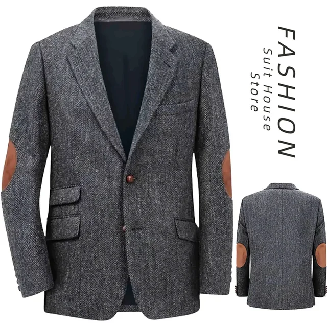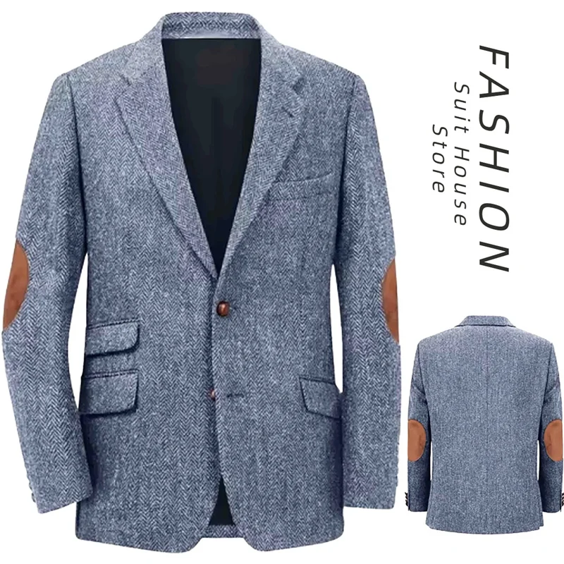 Men’s Casual Blazer British Retro Style Classic Herringbone Fabric Elbow Patchwork Design Daily Leisure Business Autumn Winter