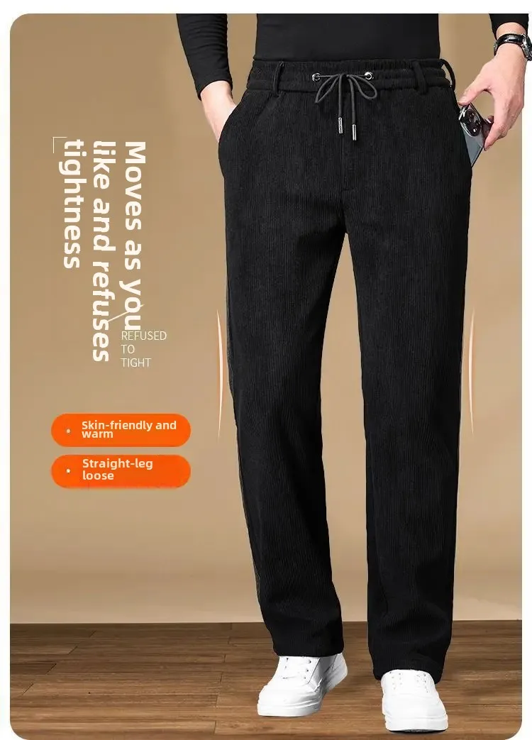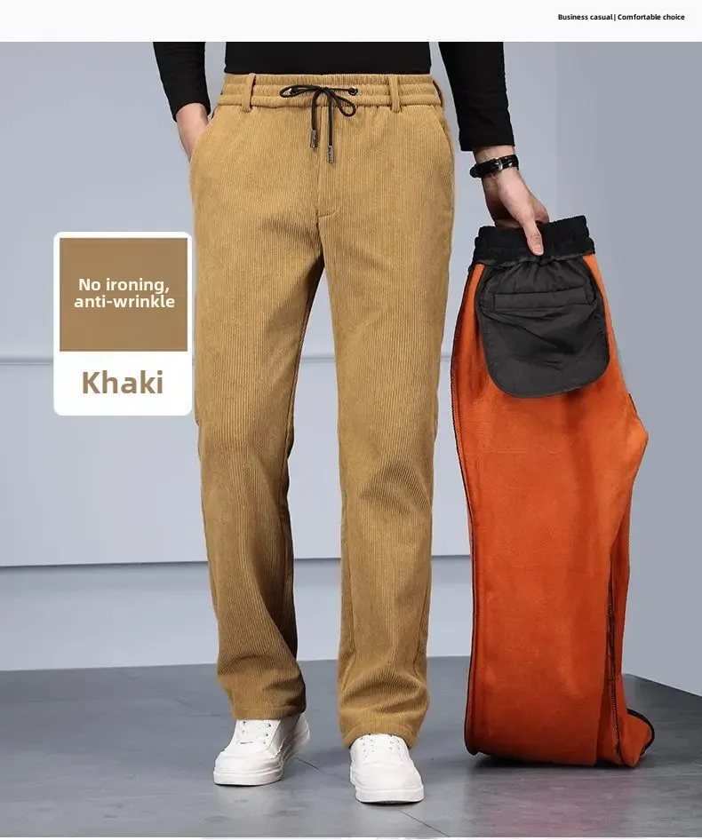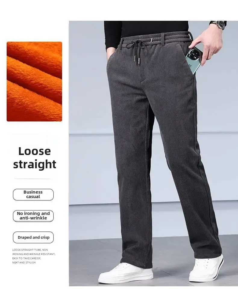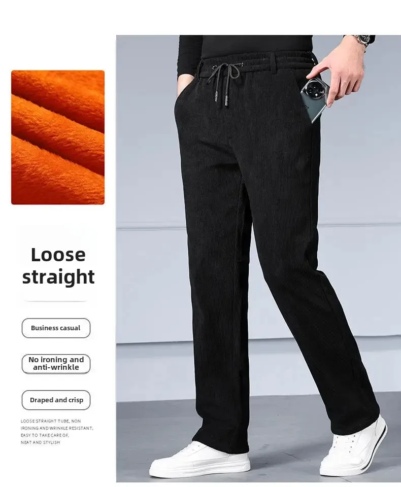Men's Casual Fleece-Lined Corduroy Pants Loose-Fit Straight-Leg Thickened Mid-Waist Dad Slim Fit Velvet Pants