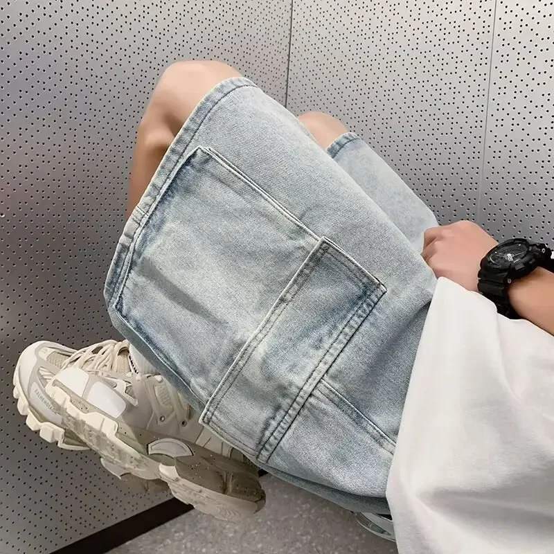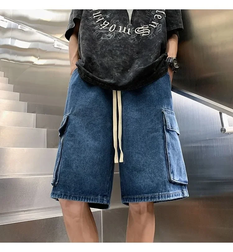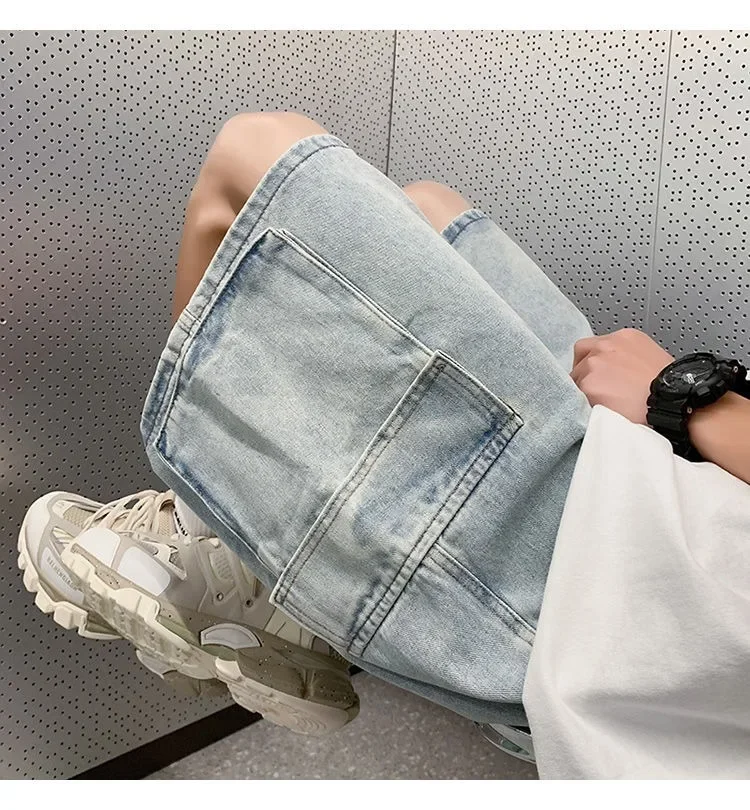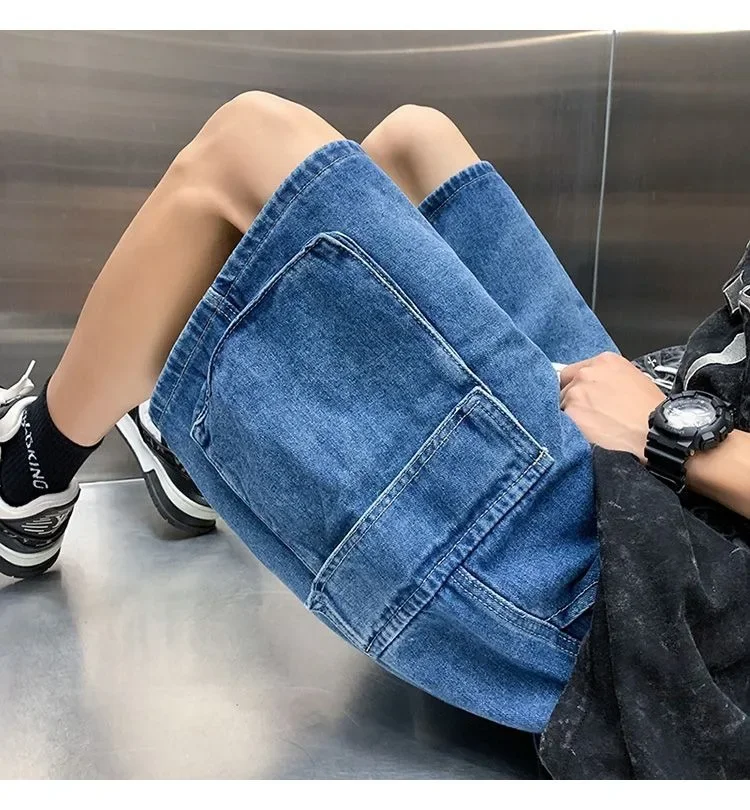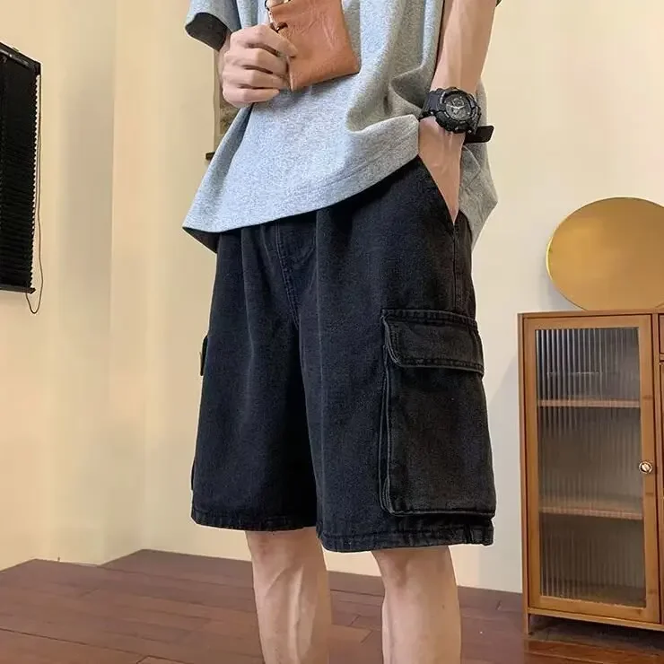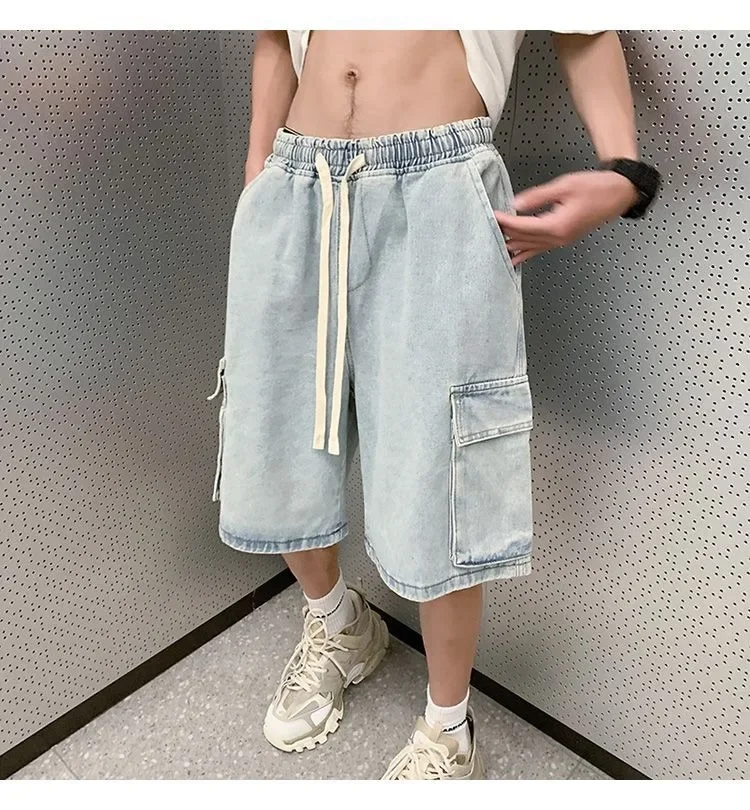 Men's Casual Straight Leg Jeans Shorts Thin Elastic Waist Loose Fit Five-Quarter Length Workwear Style Summer Fashion