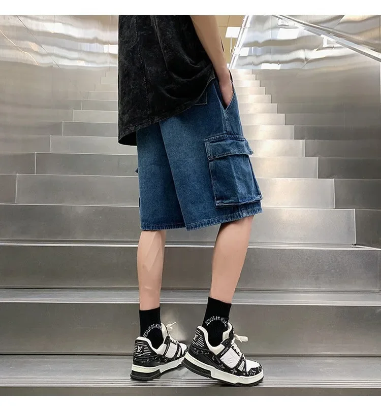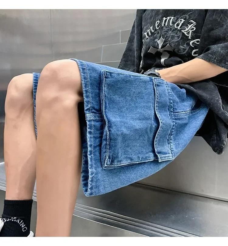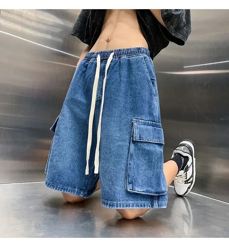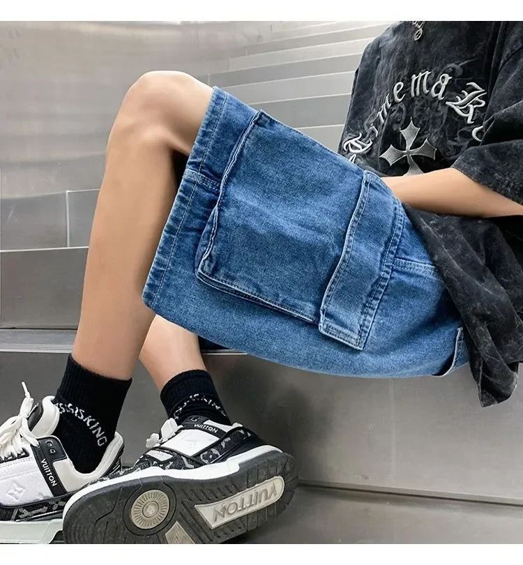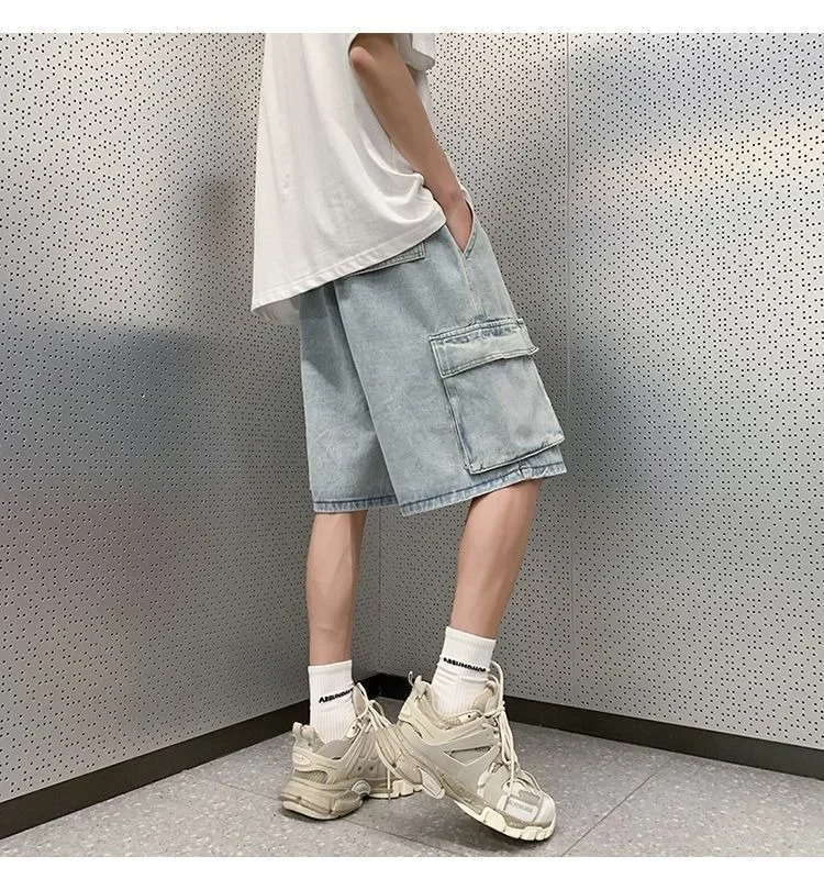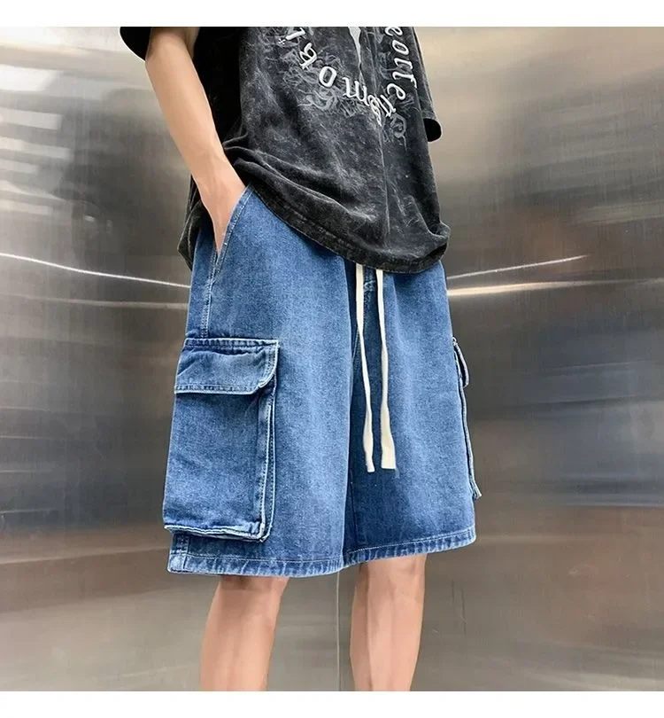 Men's Casual Straight Leg Jeans Shorts Thin Elastic Waist Loose Fit Five-Quarter Length Workwear Style Summer Fashion