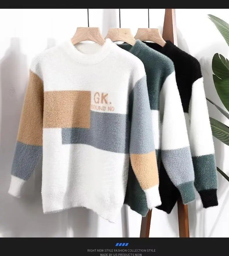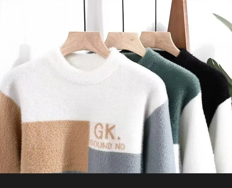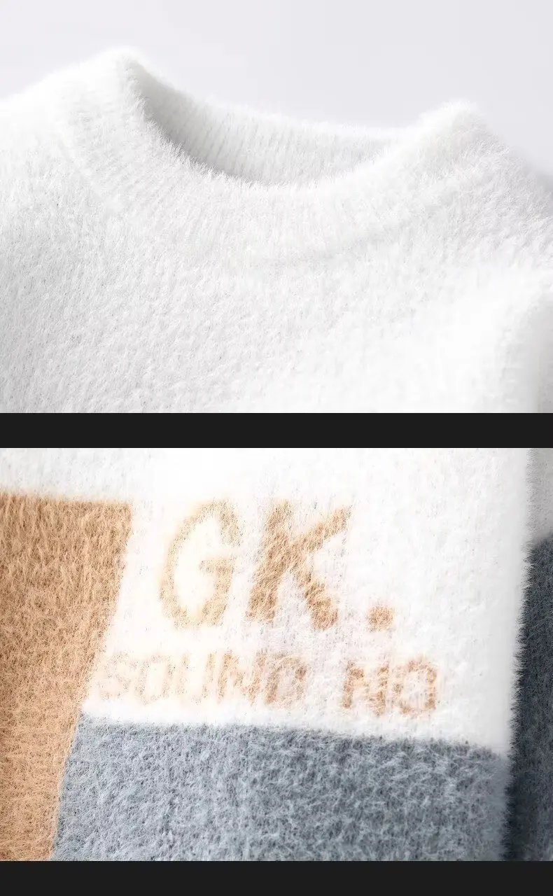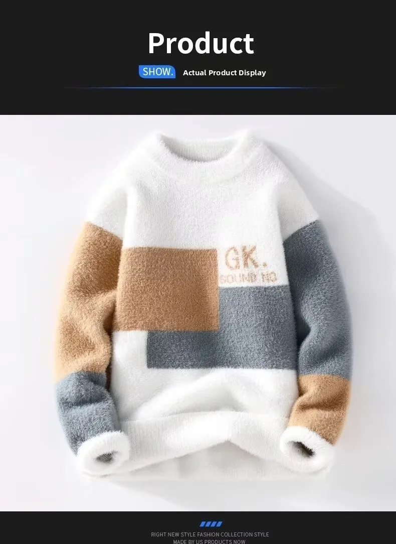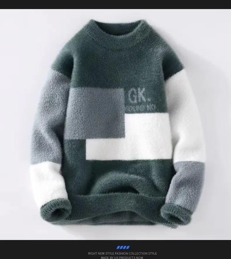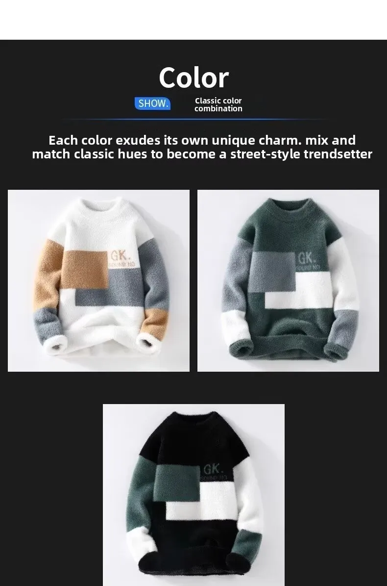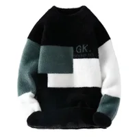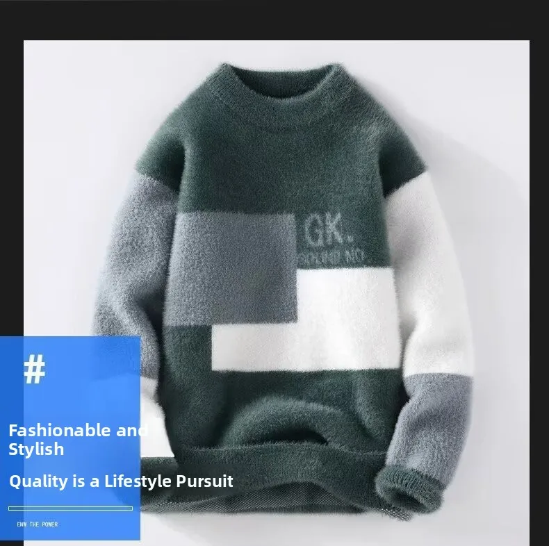 Men's Classic Autumn Winter Knitted Sweater Mid Neck Fleece Lined Letter Print Base Layer Fashionable Korean Style Long Sleeve